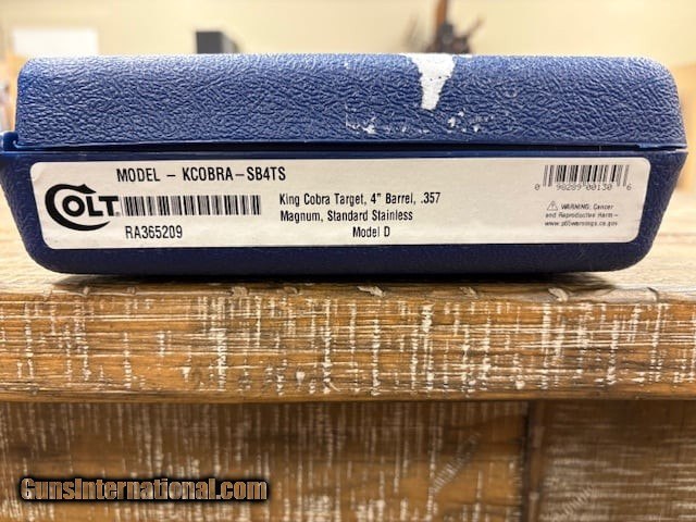 Description: Guns Listing ID: 582767 Colt Cobra model KCOBRA-SB4TS in like new condition, has been fired 6 times. Comes with original box and all paperwork. Manufacturer: COLT Model: KING COBRA TARGET Caliber Info: .357 MAG Condition: Used - Non-Certified Barrels: 4" BARREL Action: DOUBLE ACTION Finish: STAINLESS Weight: 2.2 lbs. Price: $995.99 Contact Seller |