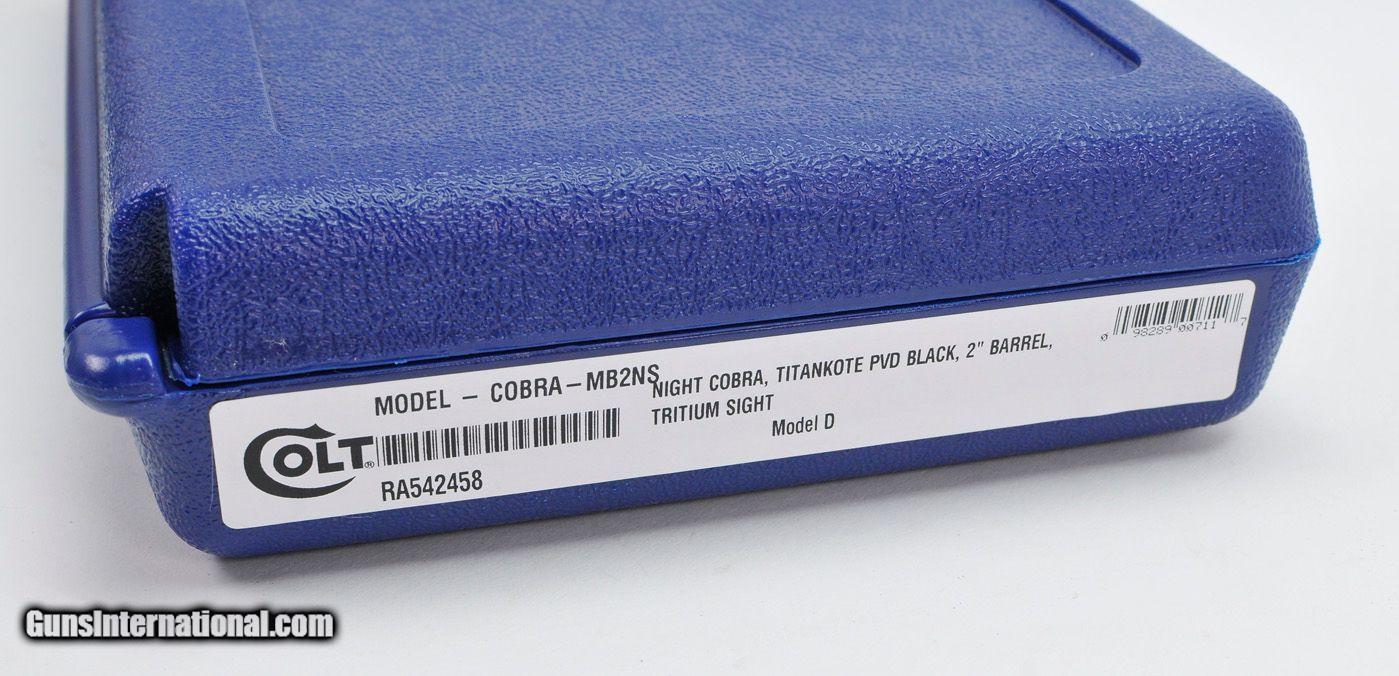 Description: Colt Night Cobra Model MB2NS 2-Inch .38 Special. Brand New In Factory Hard Case Colt's Legendary Double-Action Revolvers Return The Colt Cobra® is now available in a carry-ready format. Matte black DLC (Diamond-Like Carbon) coating over Stainless Steel frame ensures maximum corrosion resistance and ultimate concealability. Double Action Only configuration retains the smooth trigger pull with a snag-free bobbed hammer design. Custom Colt G10 Grips provide a smooth drag free grip that is won’t hang up on clothing or cover garments. The Cobra® is chambered in .38 Special and is +P capable. This firearm was designed to meet the needs of new shooters and seasoned professionals alike. It's easy and enjoyable to shoot, easy to carry, and draws from the fine lineage that make Colt revolvers special. Features