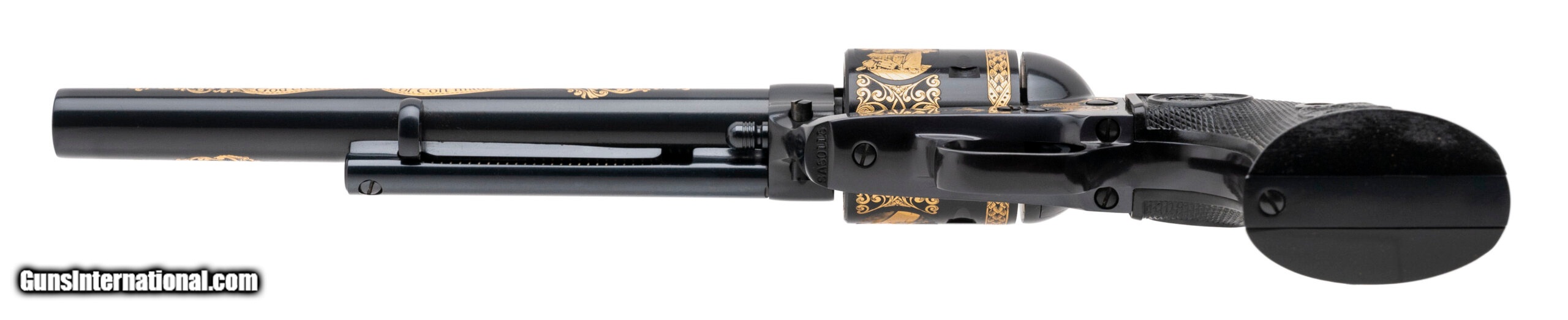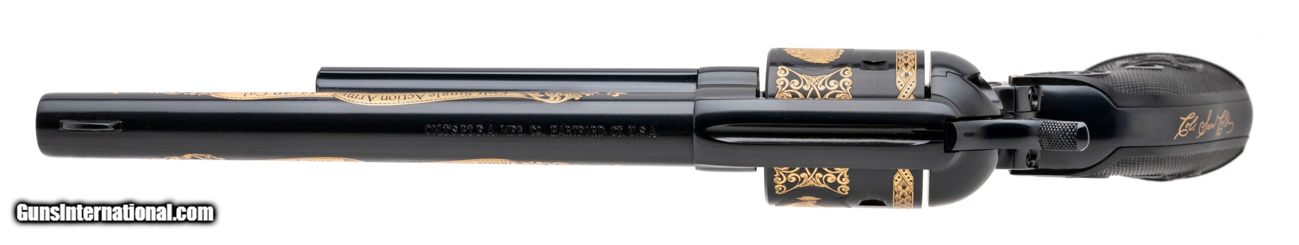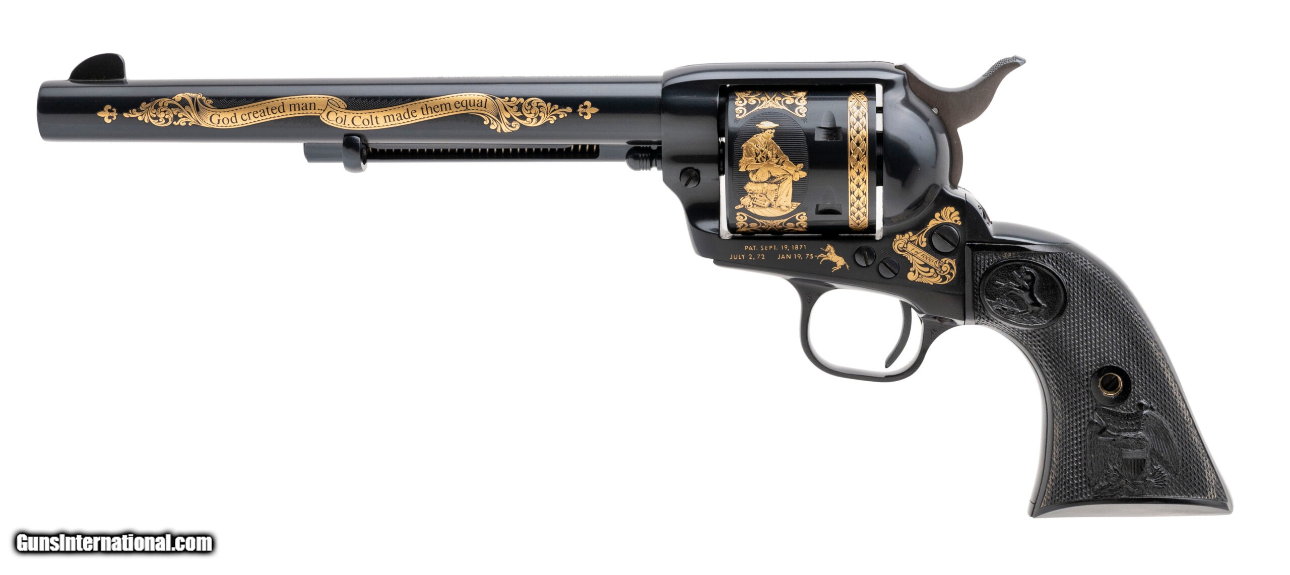 Description: "SN: SA50115. Made in 1981, .44-40 with a 7.5"" barrel. Sam Colt commemorative Single Action, decorated with gold and marked ""God created man, Col. Colt made them equal"". Called the ""Rusty Nail"" commemorative because it includes a nail pulled from the original Colt Armory during a restoration. Comes in a wooden presentation case with extra undecorated cylinder. SOLD |