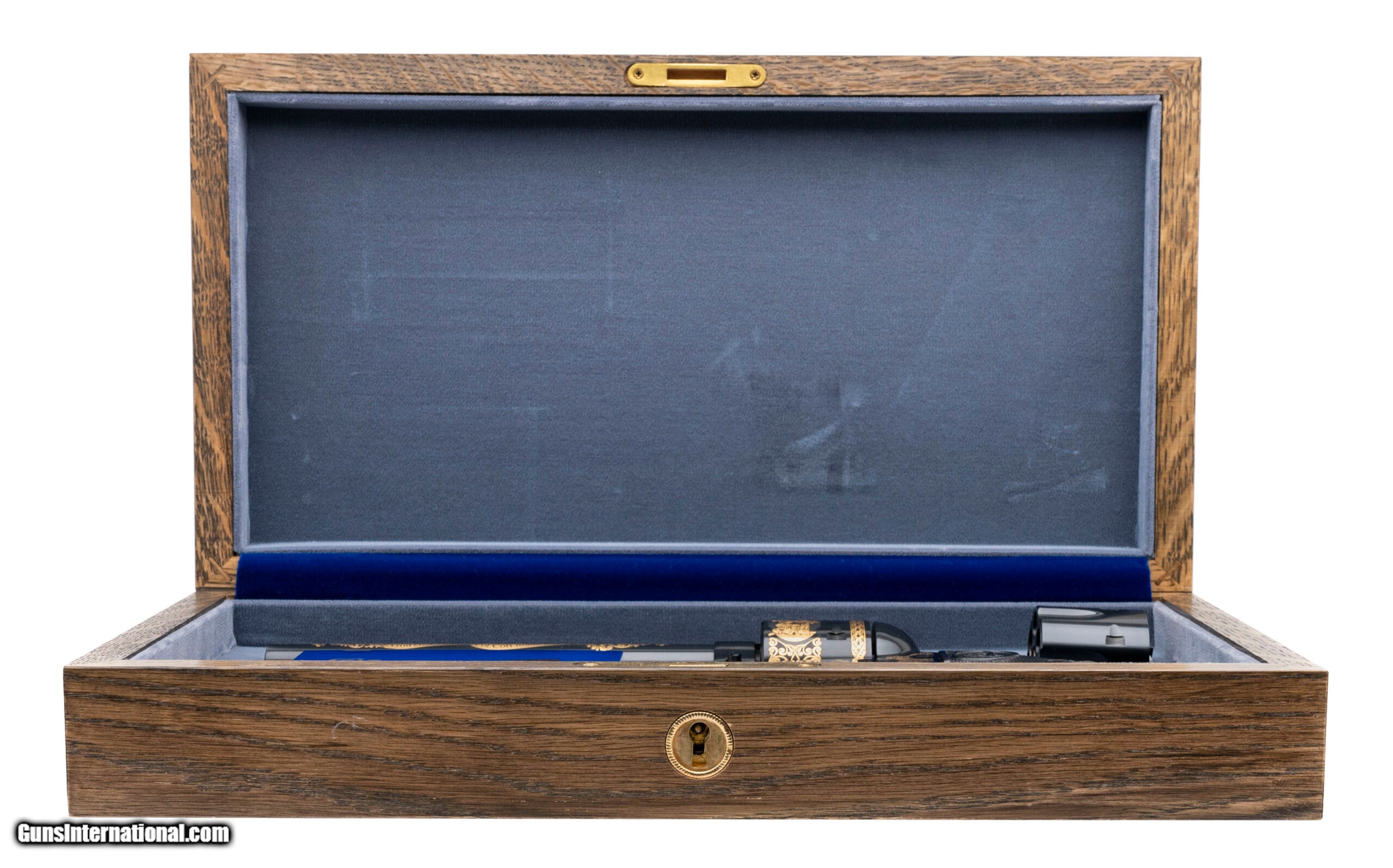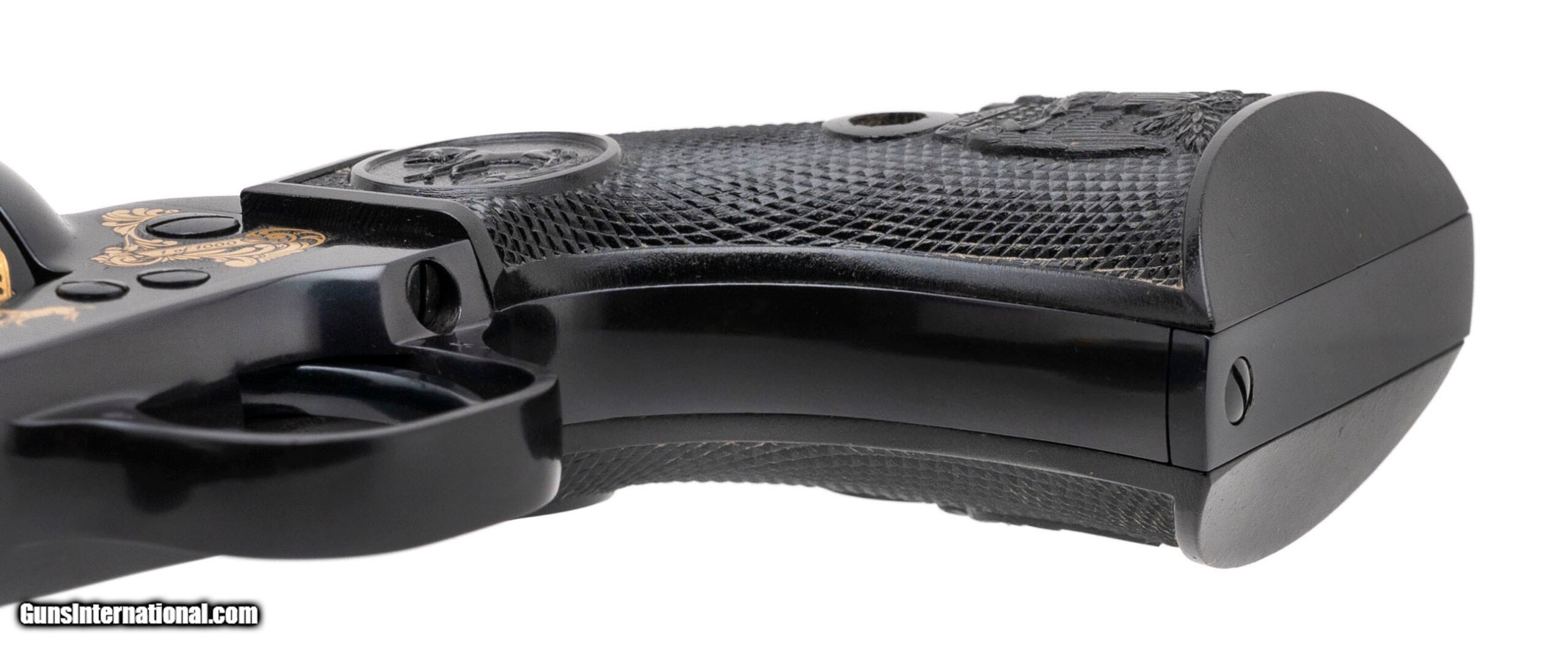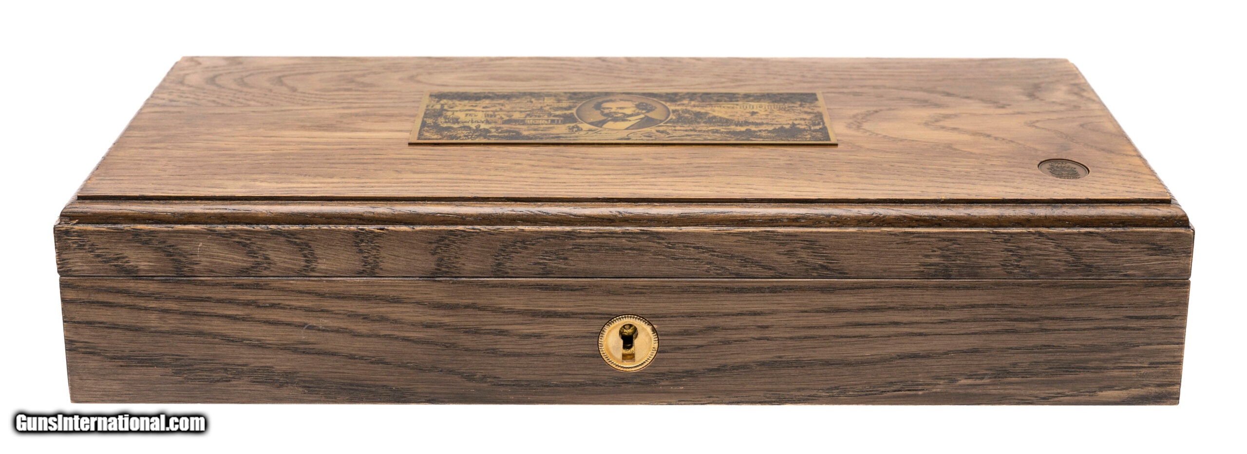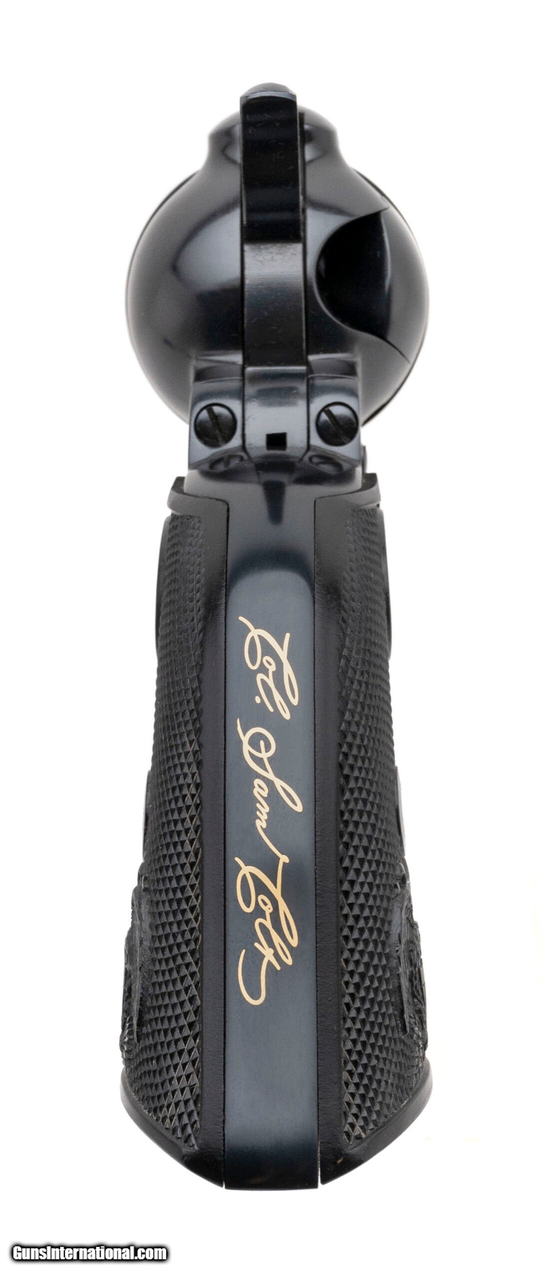 Description: "SN: SA50115. Made in 1981, .44-40 with a 7.5"" barrel. Sam Colt commemorative Single Action, decorated with gold and marked ""God created man, Col. Colt made them equal"". Called the ""Rusty Nail"" commemorative because it includes a nail pulled from the original Colt Armory during a restoration. Comes in a wooden presentation case with extra undecorated cylinder. SOLD |