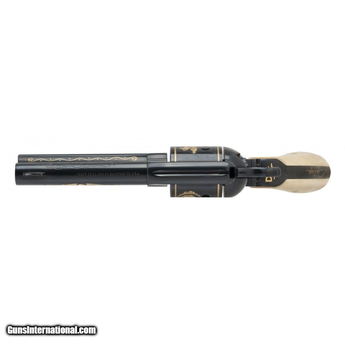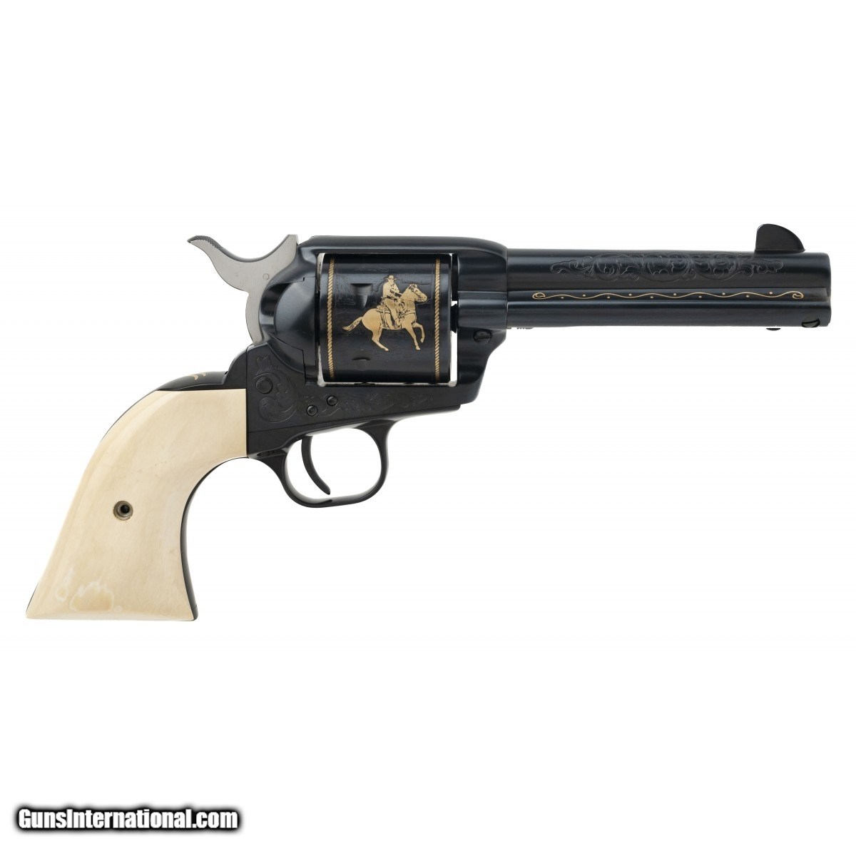 Description: " Commemorative Single Action revolver, 1982 issue, decorated with Gold etchings and Ivory grips. Comes with case, boxes and shipping carton. A complete set. SOLD |