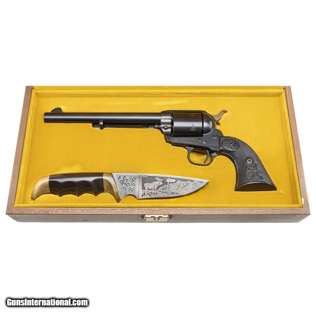 Trans Alaska Pipeline Colt Single Action .45LC commemorative revolver. 1977 issue, only 802 made. This is No. 471, with etched Kershaw Knife and presentation case.