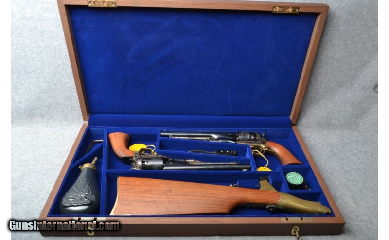 Description: This is a NIB, Colt US Cavalry Commemorative set marking the 200th anniversary of the US Cavalry 1777-1977 consisting of two pistols and accoutrements. One pistol is serial No. 1922US, the other US1922. This set includes (2) Model 1860 Army Revolvers; both pistols are 44 cap & ball. These guns are beautiful: color case hardened receivers and bullet rammers. The trigger guards are brass. The barrels, cylinders and backstraps are blue. Cylinder is roll engraved with a Naval engagement scene, saying engaged 16 May 1843, w/ Colt's patent numbers. The unturned cylinders are unfluted, 8 inch barrels read “United States Cavalry Commemorative”. Has “MJH” cartouche on the black walnut grips. Also included in this set are: (1) powder flask, (2) bullet mold, (3) nipple wrench, (4) cap can, (5) one piece walnut shoulder stock and (6) the walnut English fitted display case with blue velvet lining. This set was one of 3000 sets made in 1977. SOLD Manufacturer: 1977 Caliber Info: .44 cap & ball Chambers: 6 Shot Barrels: 8 Extras: (1) powder flask, (2) bullet mold, (3) nipple wrench, (4) cap can, (5) one piece walnut shoulder stock and (6) the walnut English fitted display case with blue velvet lining. Item Location: Cheektowaga, NY |