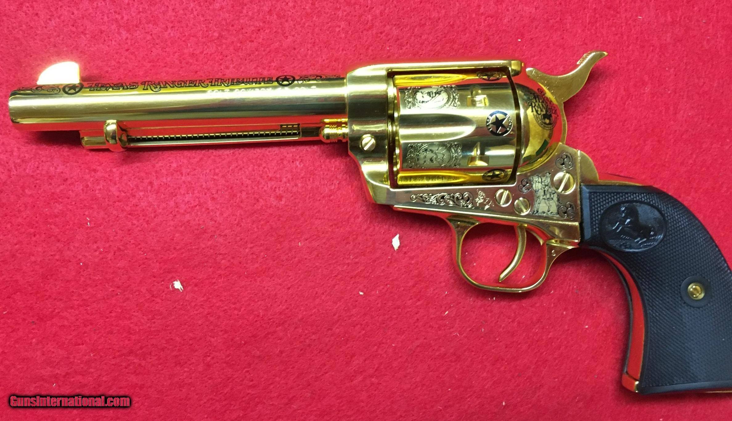 Description: ( THIS GUN WAS AUTHORIZE BY TEXAS RANGER HALL OF FAME AND MUSEUM IN WACO TEXAS) Here is a unturned 24kt Gold Plated Revolver number 18 of 300 made . Engraved and just a good looking gun in a display case she has images of some of the most famous Texas Rangers on the cylinder . She is price to sell . THIS GUN IS A REAL COLT 45 (NOT A UBERTI FIREARM ) P.S. Guy's you can't buy a new Colt at this price this gun would be a better buy and if you want a shooter then for the money this would be one great shooter at less cost then a new gun.People would not understand why you would shoot this gun . But it's because you can for the price. SOLD |