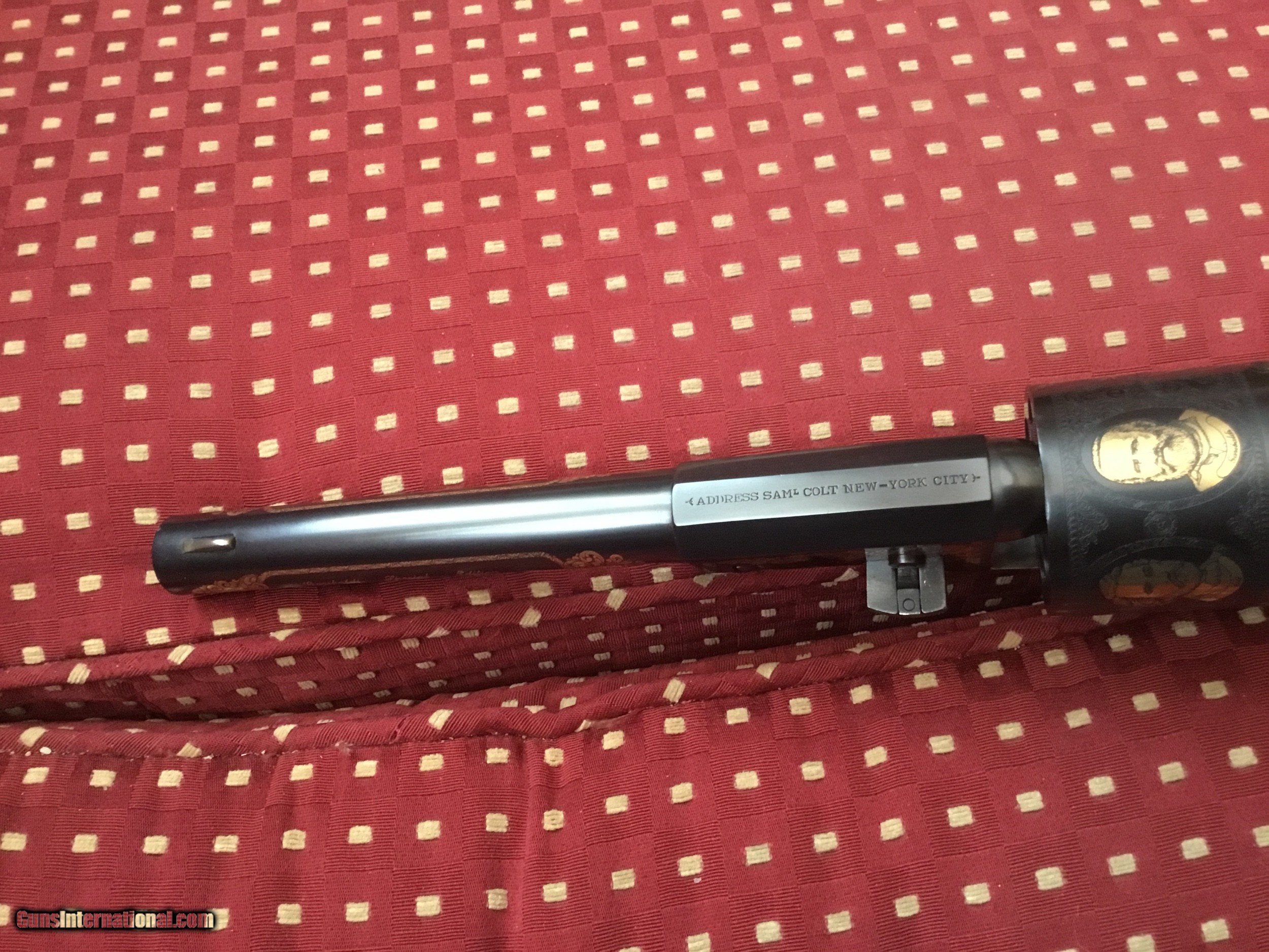 Description: Very rare 2nd generation 3rd model Dragoon complete Garabaldi set. Samuel Colt developed a close relationship with Garabaldi, the famous revolutionary leader in South America, which led to a very large arms contact for Colt. Only 106 finished sets were ever completed out of the 200 that Colt intended to produce. The remaining 94 were were unfinished or "left in the white". This set includes the factory letter and paperwork. The gun is unfired and in excellent condition. The case is also excellent. The original glass etched top lid was etched, but broken and has been replaced with the present glass. This is one of the rarest 2nd generation production models made. Shipping costs $35. SOLD |