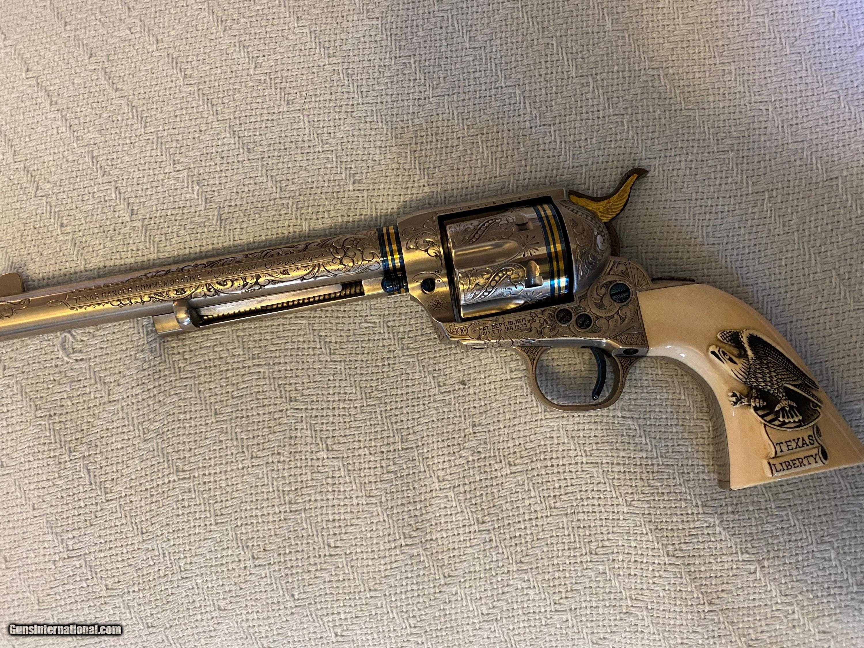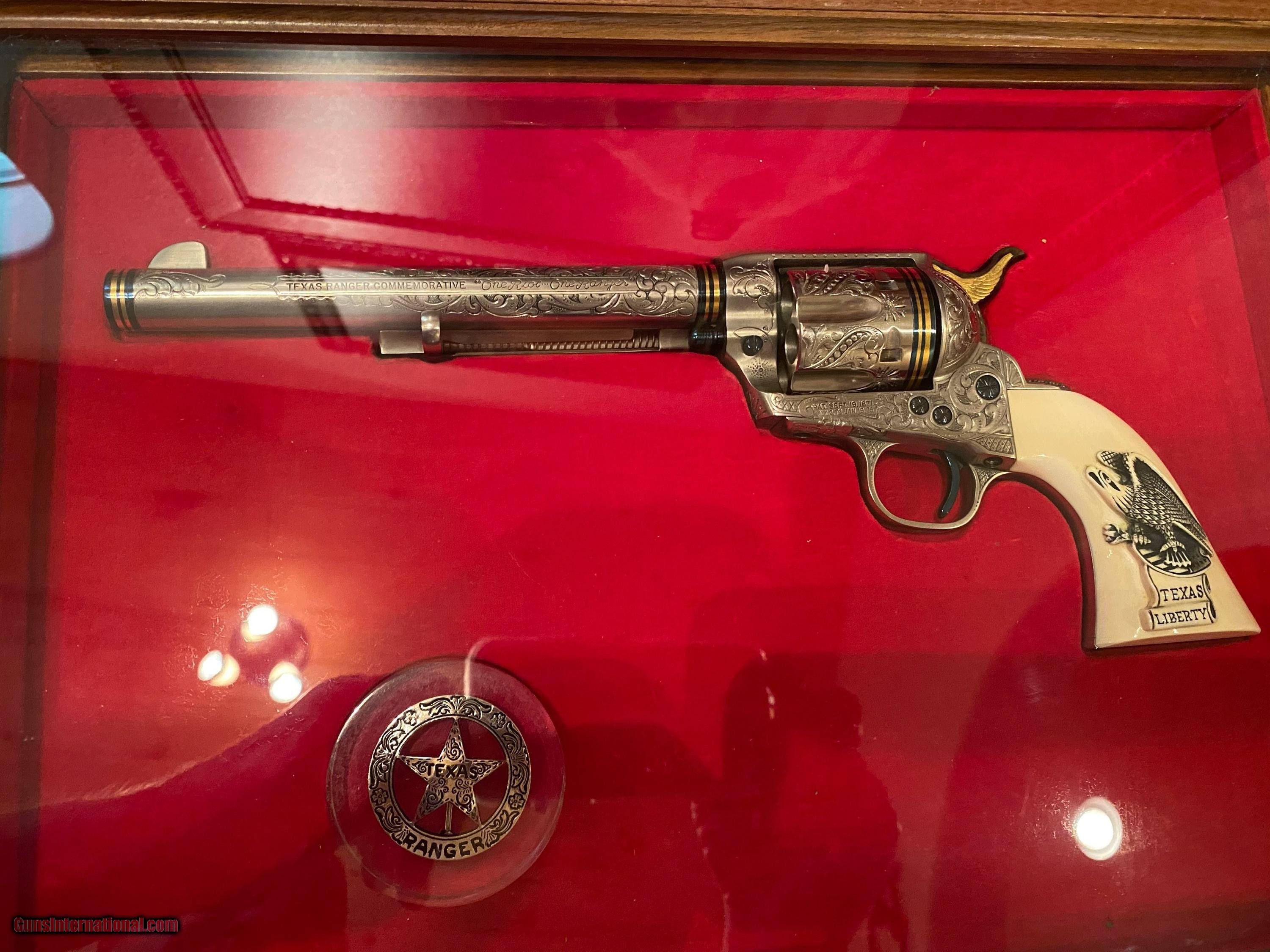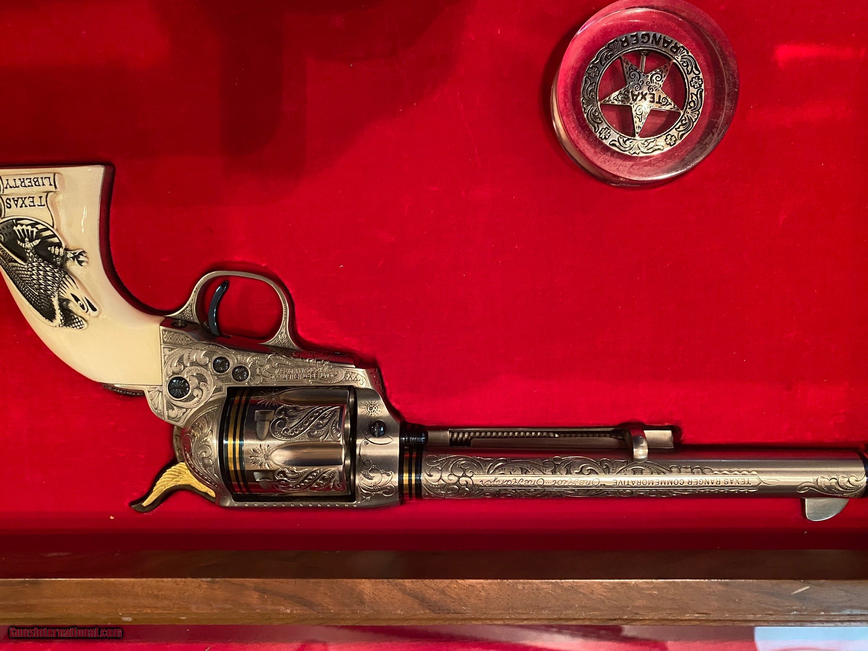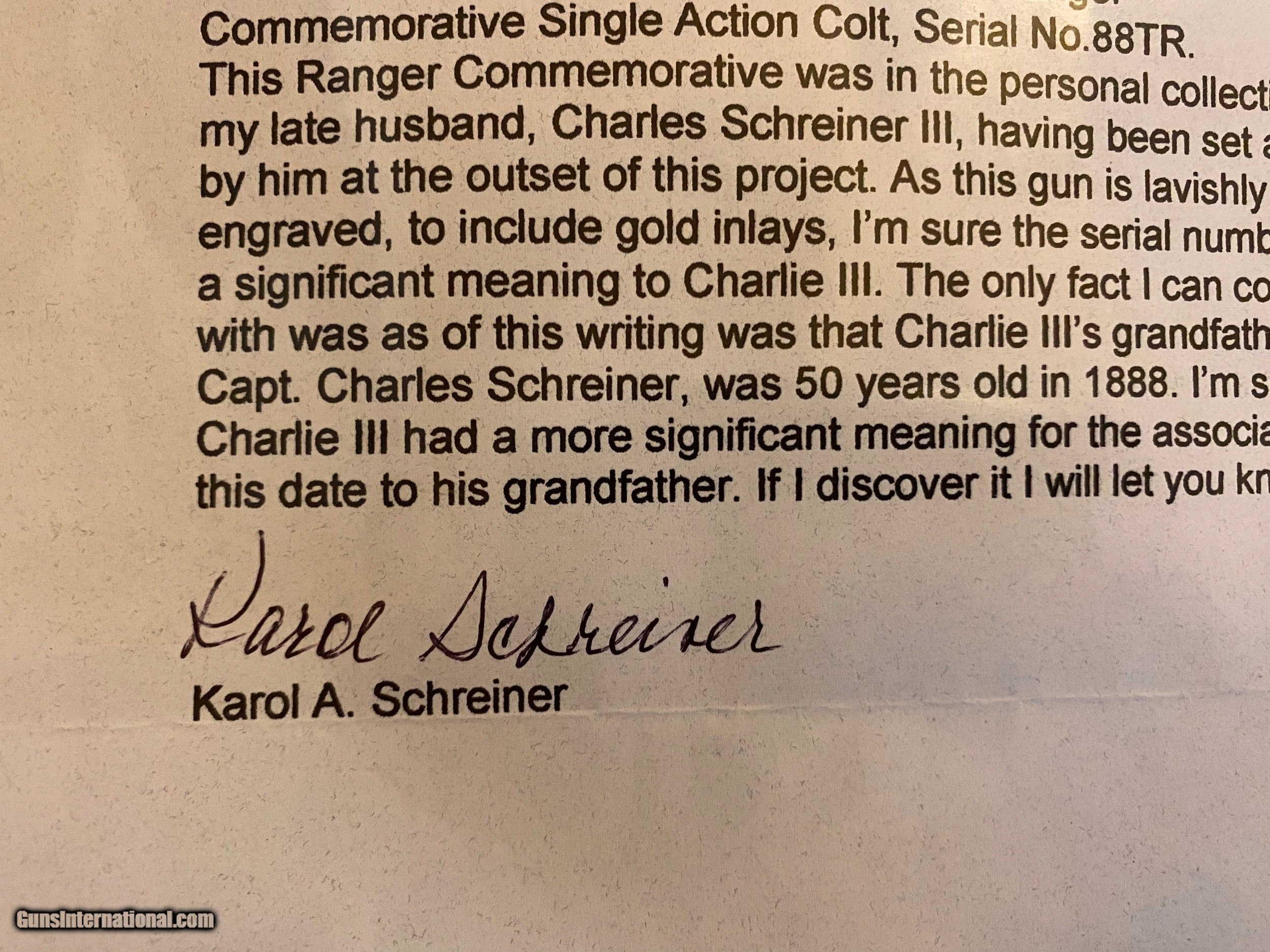 Description: TR*88 This Gun is from Charles Schreiner 111 personal collection, he held TR*88 and TR*1 back for himself TR*88 A DELUXE CASED, ENGRAVED AND GOLD-INLAID TEXAS RANGER COMMEMORATIVE COLT SINGLE ACTION ARMY REVOLVER Charles Schreiner, III's personal gun A DELUXE CASED, ENGRAVED AND GOLD-INLAID TEXAS RANGER COMMEMORATIVE COLT SINGLE ACTION ARMY REVOLVER CHARLES SCHREINER, III'S PERSONAL GUN Serial no. 88TR, .45 caliber, circa 1963. 7 1/2 inch barrel with gold and fire-blued bands at breech and muzzle and extensive scroll-engraved coverage; signed by the engraved WEL, Weldon E. Lister. Silver-plated finish. Cylinder with scroll-engraved panels, the rear with gold and fire-blued bands. Scroll-engraved frame. Fire-blued cylinder pin, trigger and screws. Hammer inlaid on both sides with an engraved gold eagle's head. Backstrap engraved with scrollwork, borders and inscribed Texas Rangers; apron inlaid with a silver Texas star within an oak wreath. Original elephant ivory grips, left side relief-carved with an eagle perched on a Federal shield above a scroll inscribed Texas/Liberty Complete with two-drawer figured walnut display case, the red velour-lined top draw with fitted compartment for revolver and Texas Ranger badge in lucite. Bottom draw contains cowhide bound copy of A Pictorial History of the Texas Rangers by Charles Schreinger III, et al, YO Press, 1969, the cover with YO brand. Autographed by nearly 200 Texas Rangers. Ken 480-380-7875 SOLD Handgun Caliber: .45 Colt Manufacturer: Colt Model: Colt Texas Ranger Serial Number: TR*88 Condition: New old stock Metal Condition: Engraved Gold Silver Bore Condition: New Old Stock Action: Single action Finish: Engraved, Gold, Silver Engraving: Engraved Gold Rings, Silver Plated Extras: Walnut Case containing real Texas Longhorn Hide covered Book about The Texas Rangers Item Location: Florence Arizona |