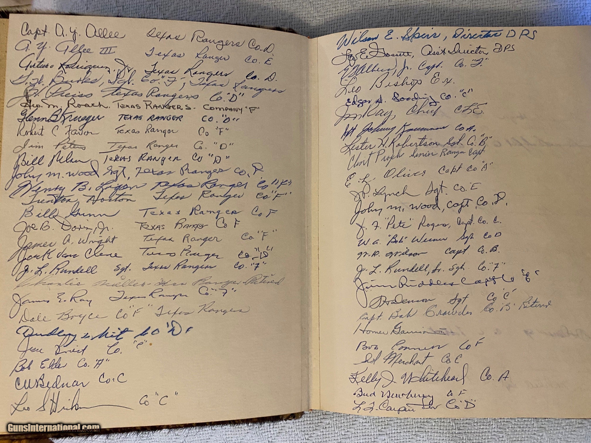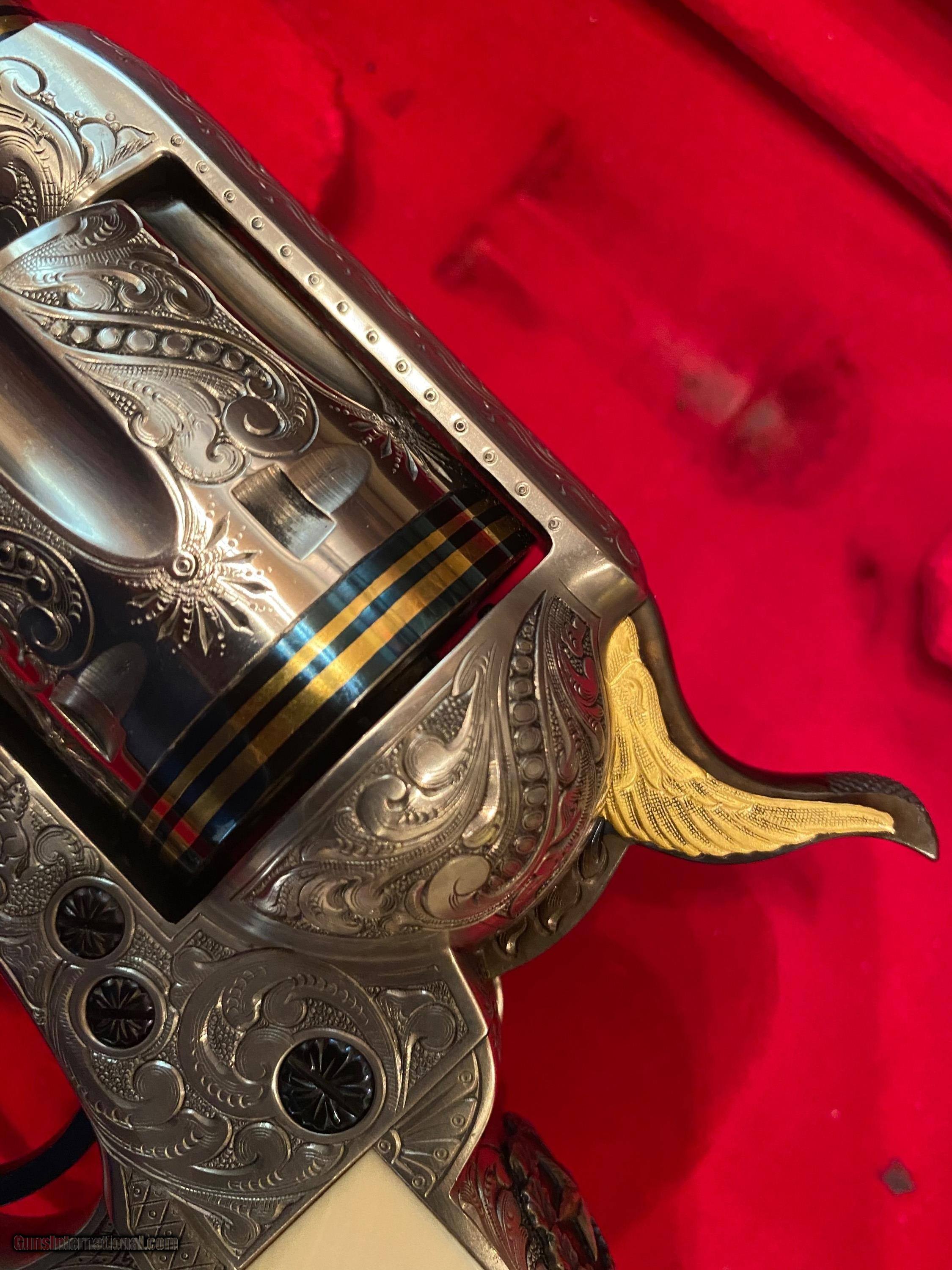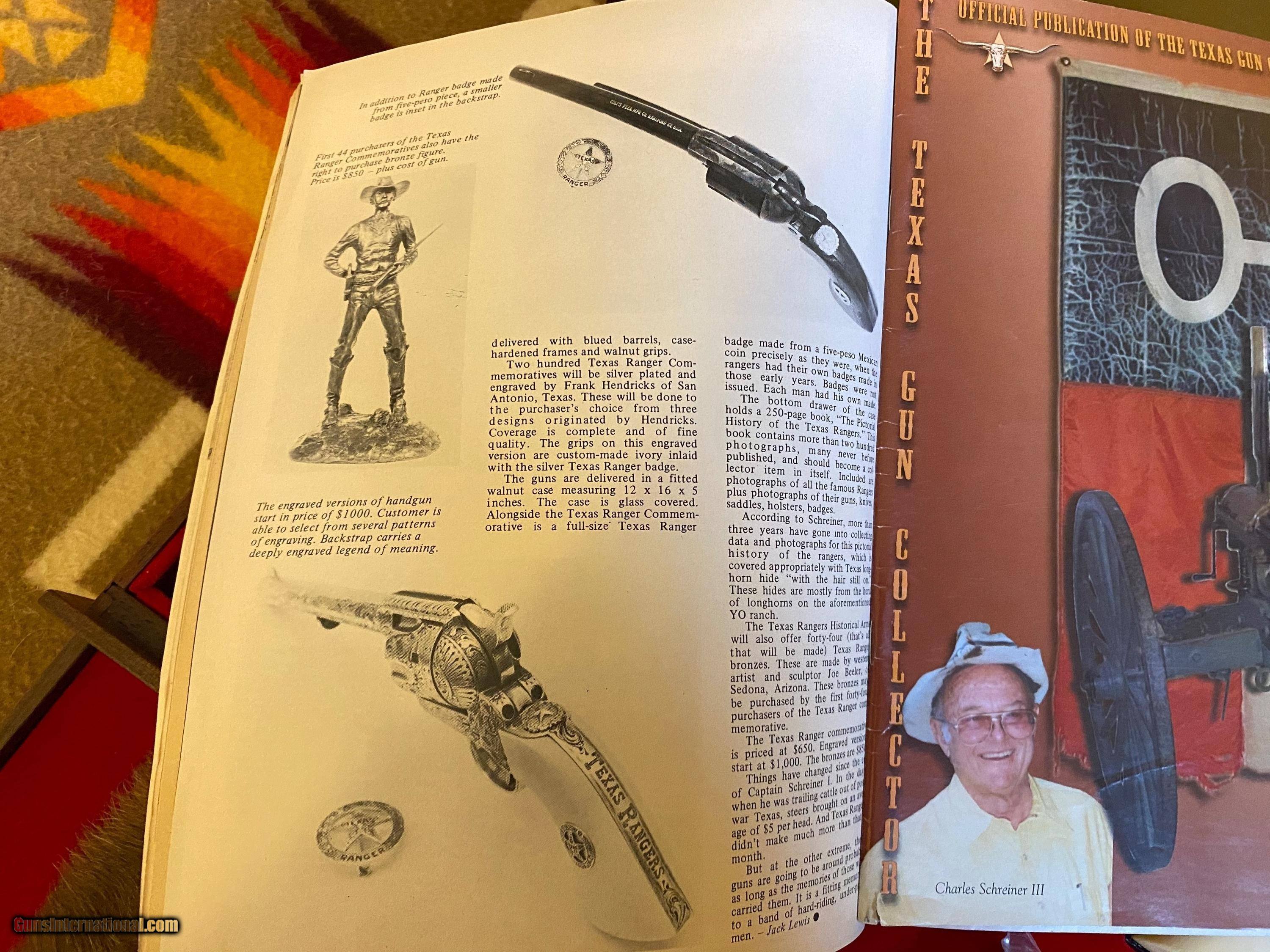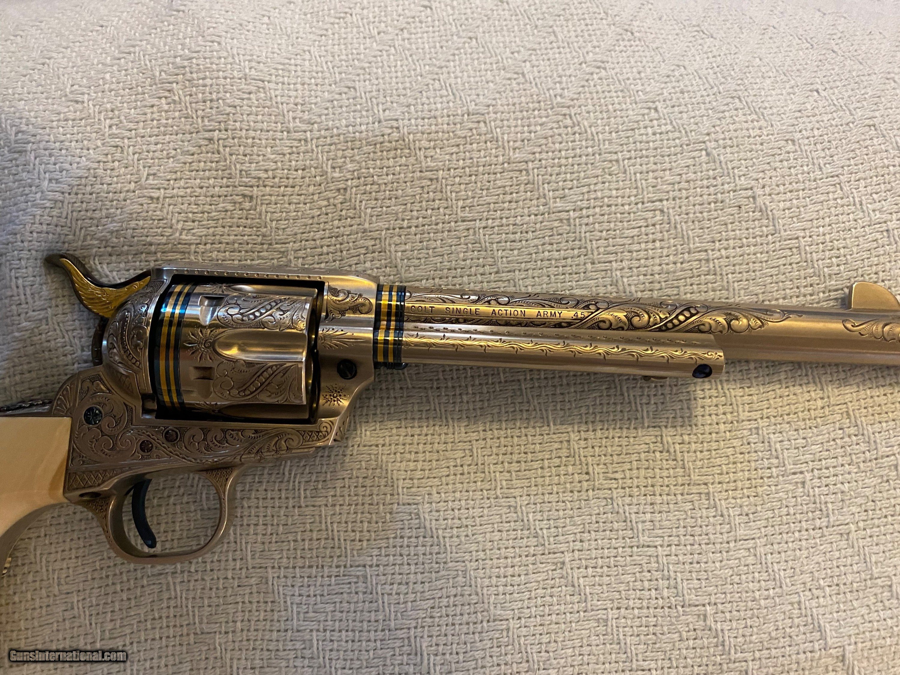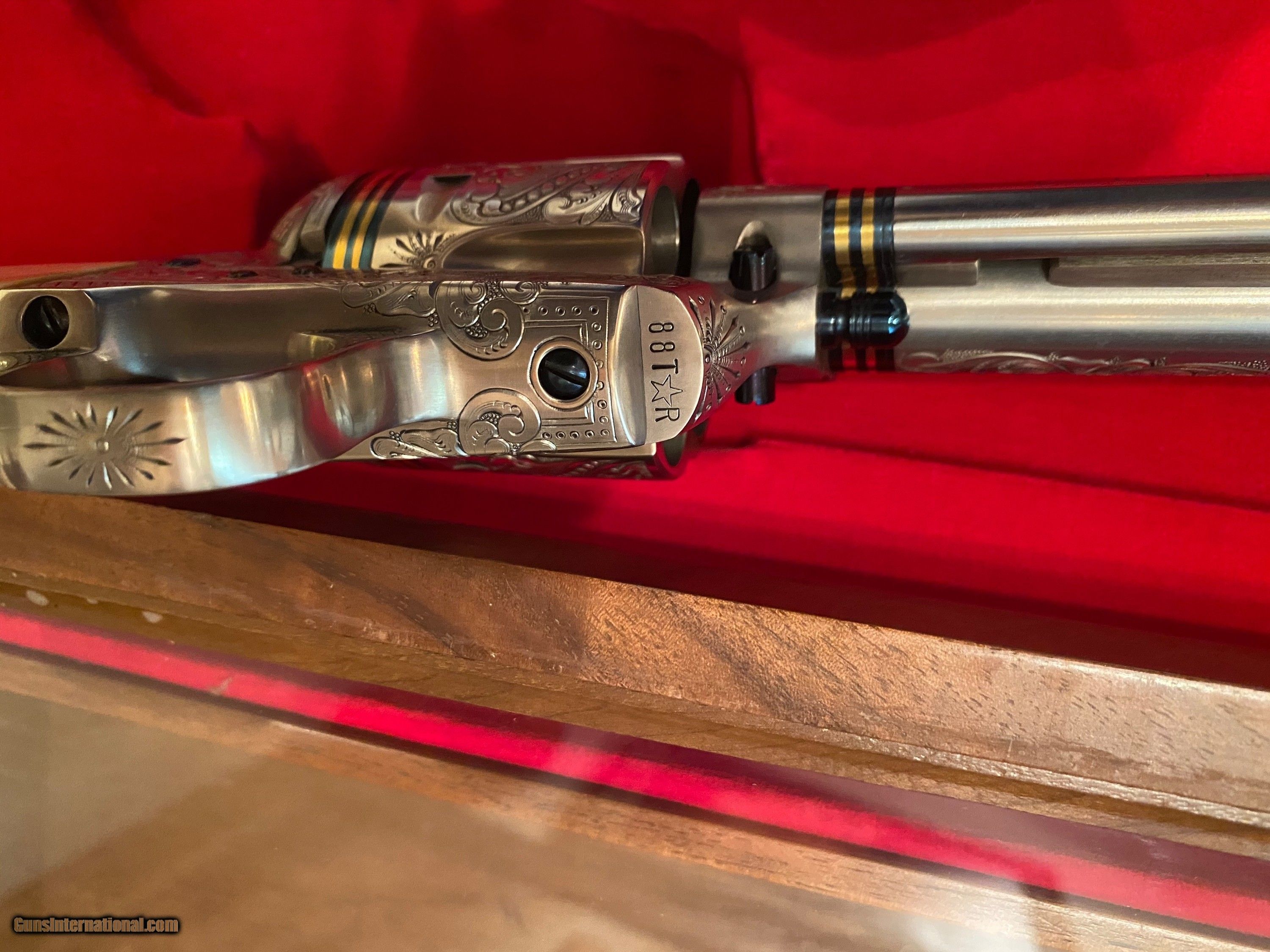 Description: TR*88 This Gun is from Charles Schreiner 111 personal collection, he held TR*88 and TR*1 back for himself TR*88 A DELUXE CASED, ENGRAVED AND GOLD-INLAID TEXAS RANGER COMMEMORATIVE COLT SINGLE ACTION ARMY REVOLVER Charles Schreiner, III's personal gun A DELUXE CASED, ENGRAVED AND GOLD-INLAID TEXAS RANGER COMMEMORATIVE COLT SINGLE ACTION ARMY REVOLVER CHARLES SCHREINER, III'S PERSONAL GUN Serial no. 88TR, .45 caliber, circa 1963. 7 1/2 inch barrel with gold and fire-blued bands at breech and muzzle and extensive scroll-engraved coverage; signed by the engraved WEL, Weldon E. Lister. Silver-plated finish. Cylinder with scroll-engraved panels, the rear with gold and fire-blued bands. Scroll-engraved frame. Fire-blued cylinder pin, trigger and screws. Hammer inlaid on both sides with an engraved gold eagle's head. Backstrap engraved with scrollwork, borders and inscribed Texas Rangers; apron inlaid with a silver Texas star within an oak wreath. Original elephant ivory grips, left side relief-carved with an eagle perched on a Federal shield above a scroll inscribed Texas/Liberty Complete with two-drawer figured walnut display case, the red velour-lined top draw with fitted compartment for revolver and Texas Ranger badge in lucite. Bottom draw contains cowhide bound copy of A Pictorial History of the Texas Rangers by Charles Schreinger III, et al, YO Press, 1969, the cover with YO brand. Autographed by nearly 200 Texas Rangers. Ken 480-380-7875 SOLD Handgun Caliber: .45 Colt Manufacturer: Colt Model: Colt Texas Ranger Serial Number: TR*88 Condition: New old stock Metal Condition: Engraved Gold Silver Bore Condition: New Old Stock Action: Single action Finish: Engraved, Gold, Silver Engraving: Engraved Gold Rings, Silver Plated Extras: Walnut Case containing real Texas Longhorn Hide covered Book about The Texas Rangers Item Location: Florence Arizona |