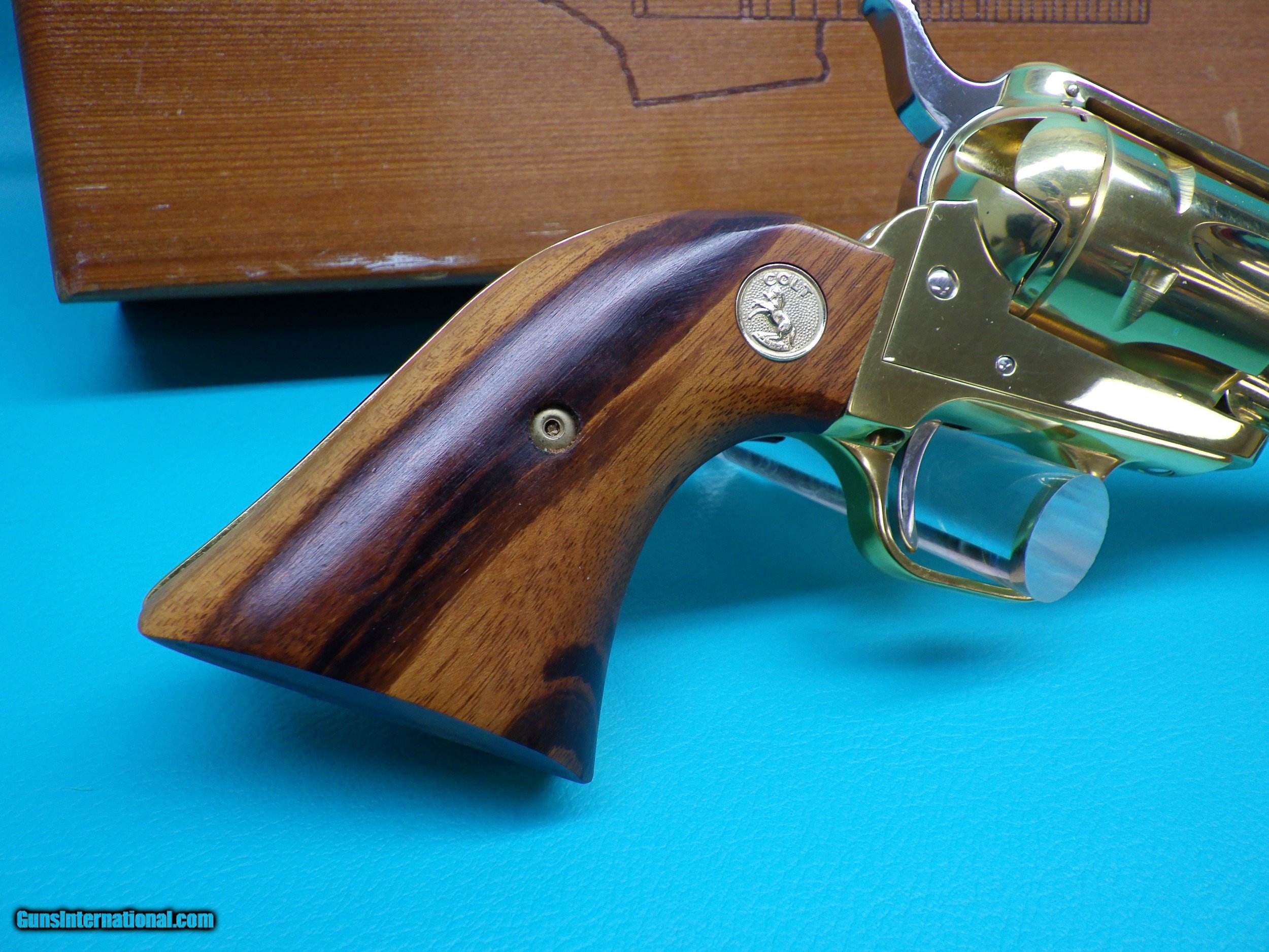Description: ***SOLD***Colt Frontier Scout .22LR single action revolver, dated to 1969. This revolver is a California Bicentennial commemorative, number 4326 of 5000. This revolver features a classic single action mechanism with an all-gold finish, and a silver hammer and trigger. The grips are an attractive figured hardwood. The pistol is in excellent condition with only minor handling wear in small areas. The pistol includes the factory display case and a California trinket. Please refer to the photos for overall condition. A very nice collectible! No handgun sales in MA. Shipping $30.00.***SOLD*** SOLD Handgun Caliber: .22 Long Rifle Manufacturer: Colt Model: Frontier Scout Serial Number: 4326CBI |