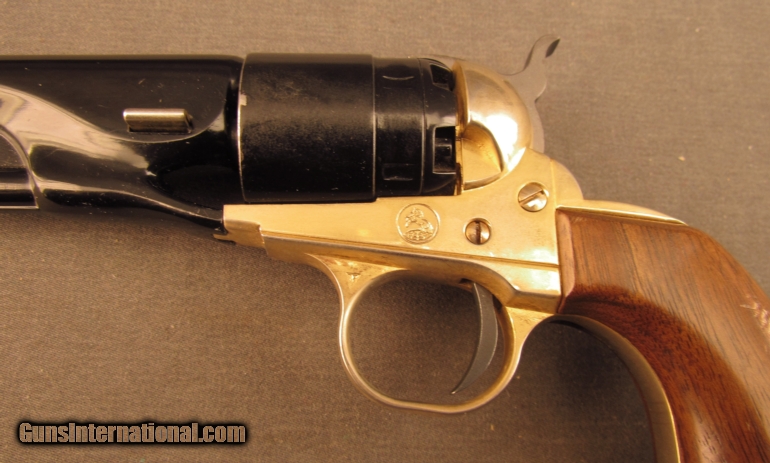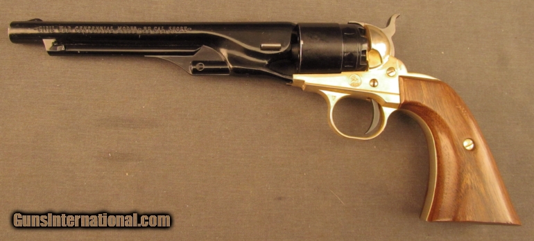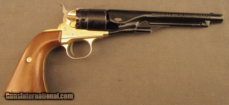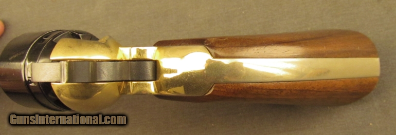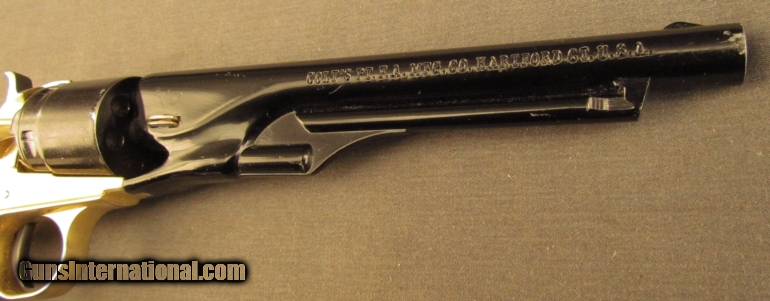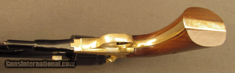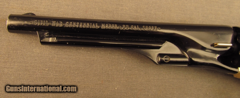 Description: S# 23673W, 22 Short, 6 inch barrel, bright excellent bore. This 1961 issued commemorative single shot remains in very good condition with over 90% black Japanned finish showing wear and scratches on barrel and on cylinder sides. The gold torn triggerguard shows wear on right side above trigger. Grips have a few dings, most on right side. Action works smoothly. An interesting colt, this was their third commemorative released. FFL or C+R SOLD Curio/Relic: Yes Manufacturer: Colt Model: Civil War Centennial Serial Number: 23673W Caliber Info: .22 Short Gauge Info: .22 Short |