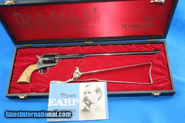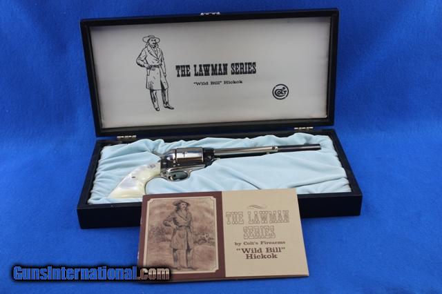 Description: These firearms are sold as a set: Colt Lawman Series in presentation cases with appropriate documentation paperwork. The Lawman series consists of the following commemorating famous lawmen of the American West. All firearms have same serial number with appropriate suffix. Wyatt Earp SAA 1964 Buntline with metal skeleton shoulder stock. 16” barrel. Bat Masterson SAA 1967 4 5/8” barrel Pat Garret SAA 1968 5.5” Barrel Wild Bill Hickok SAA 1969 7.5” barrel SOLD AS SET OF FOUR COMMEMORATIVE REVOLVERS ONLY. ADD 3% FOR CREDIT CARDS SHIPPING $25.00 SOLD |