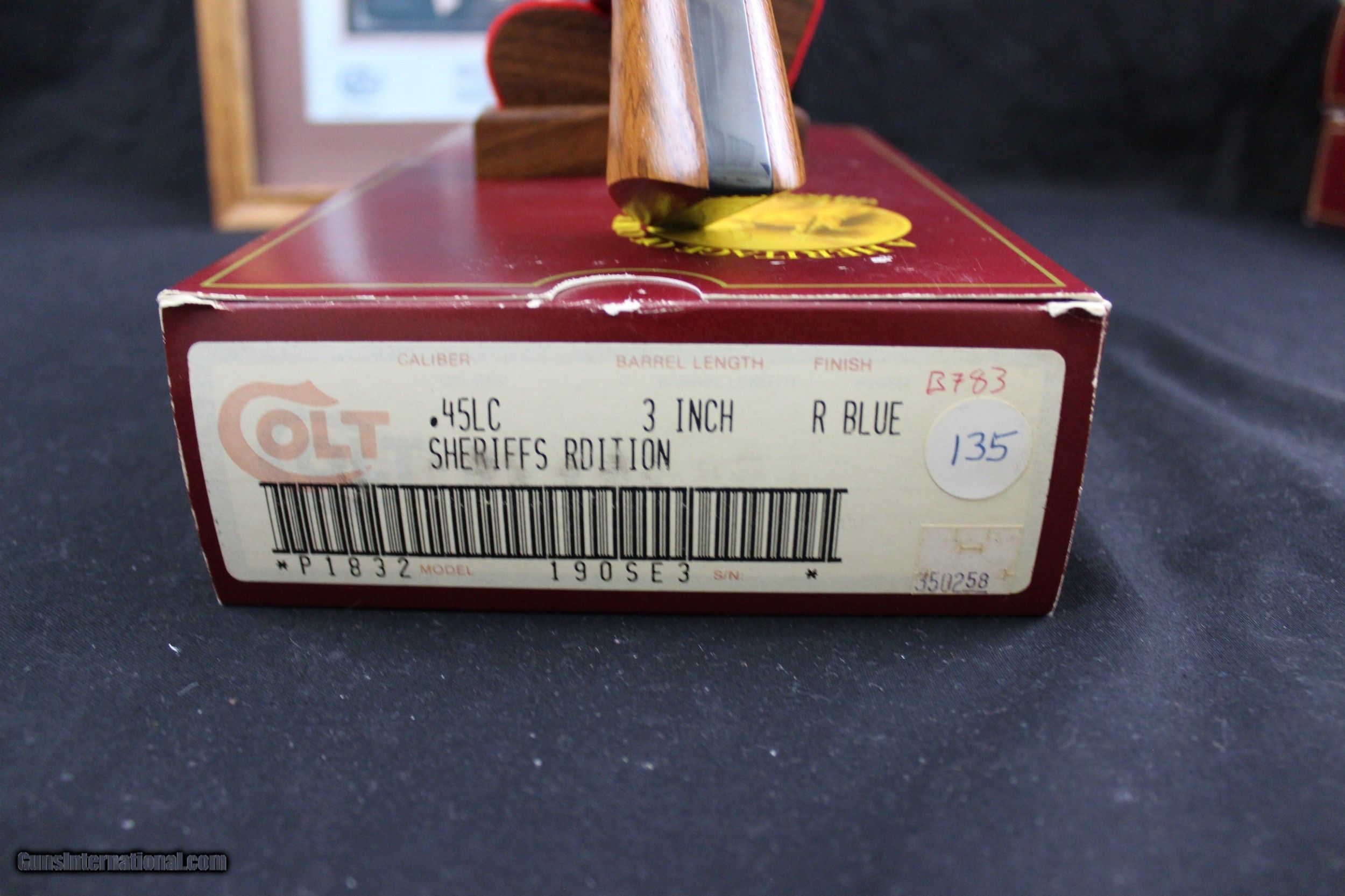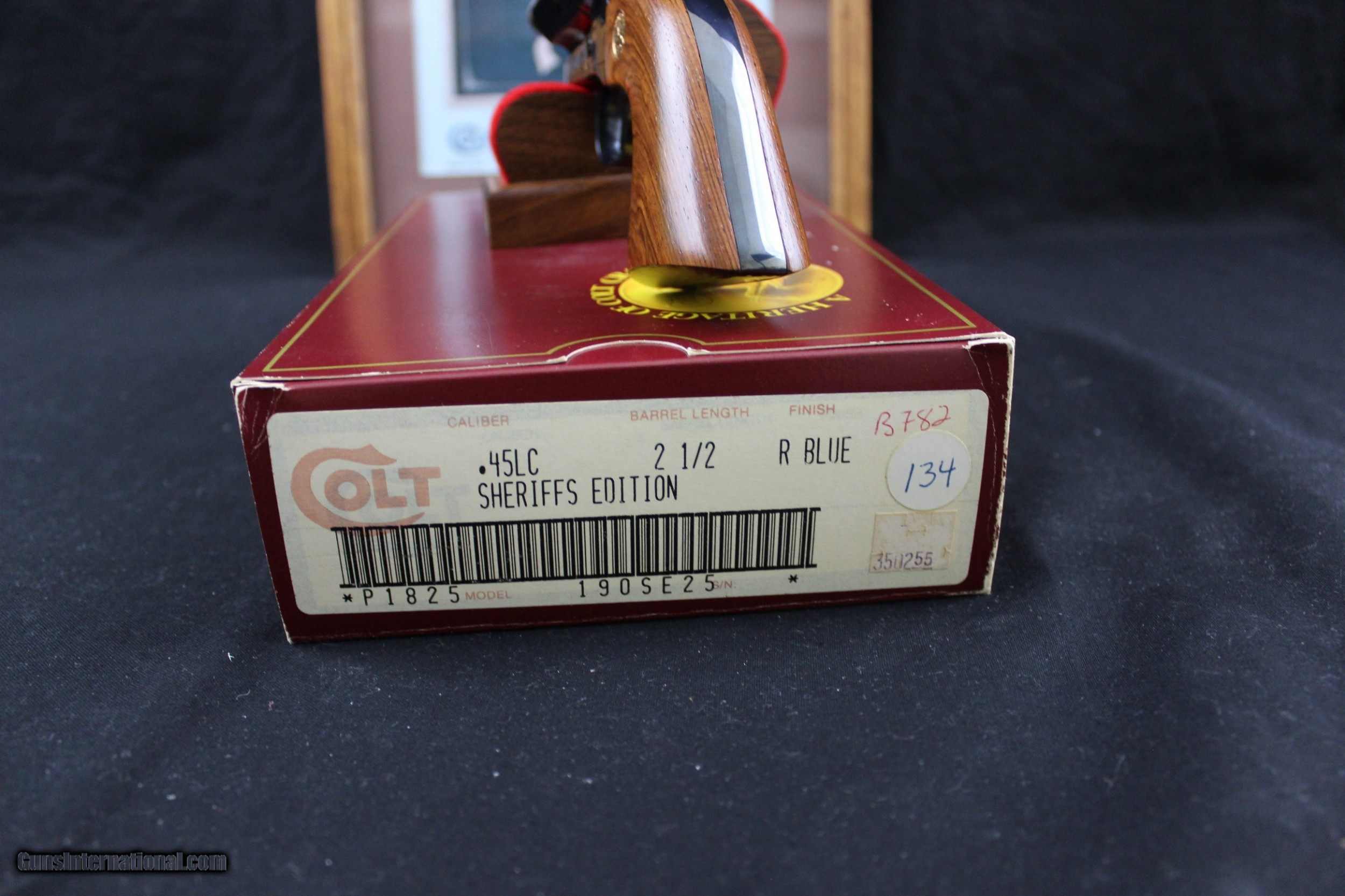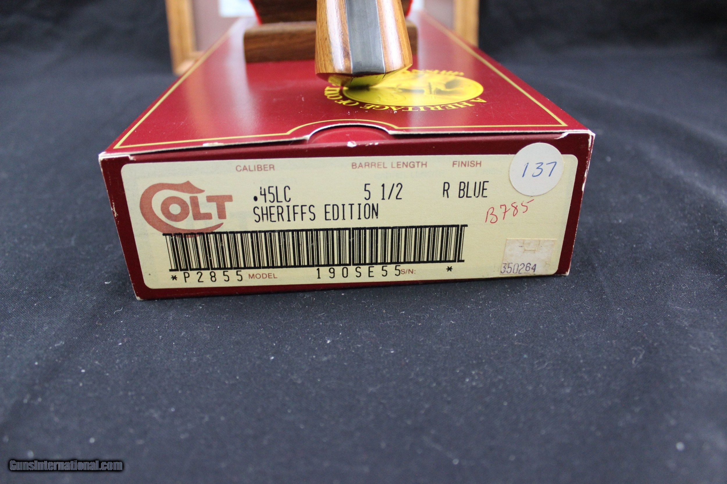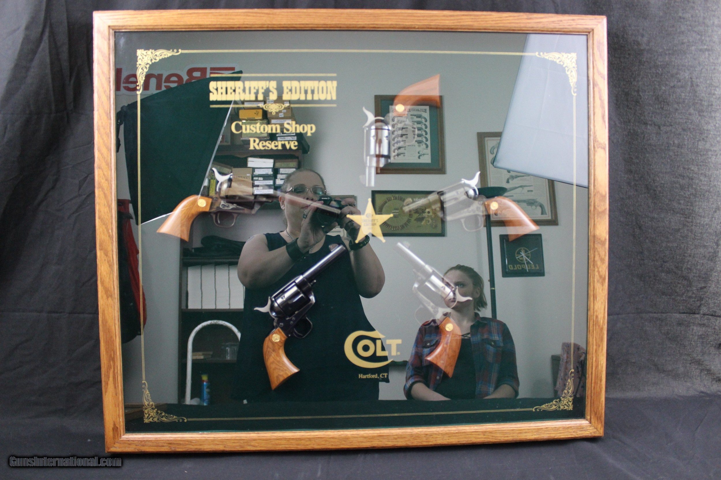 Description: Colt Custom Shop Reserve Cased Set Of Five Sheriff's Edition Single Action Revolvers barrels all with bright excellent bores. All of these revolvers are like new with the metal surfaces retaining 99% plus original blue, the 5 1/2" and 2 1/2" models showing faint signs of having been turned, likely only at the factory, and the remaining revolvers are unturned. The smooth walnut grips with gold Colt medallions all remain in excellent condition. The revolvers are housed in their original walnut and glass display case with accompanying 1987-dated brass badge. The case remains in near excellent condition showing some light handling marks. All five revolvers also include their original factory boxes correctly end-labeled and numbered to the guns as well as the display case key and a small framed informational sheet regarding this limited edition set. The display case measures about 32 1/2" x 28" x 3 1/4" and includes its original cardboard shipping sleeve. This is a wonderful set of revolvers that is a must-have display for the serious Colt collector. Note: due to the size of the display case extra shipping will apply. SOLD |