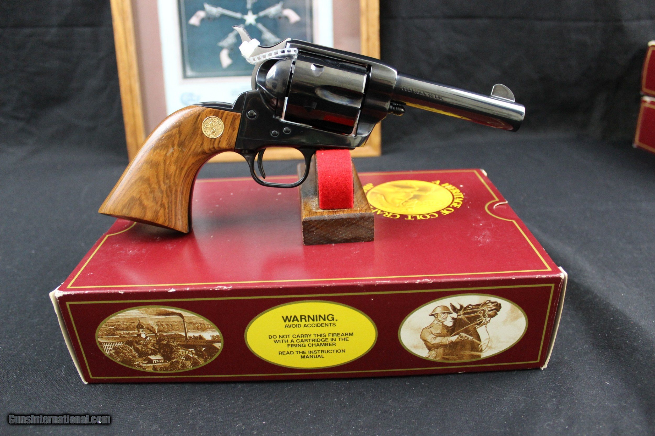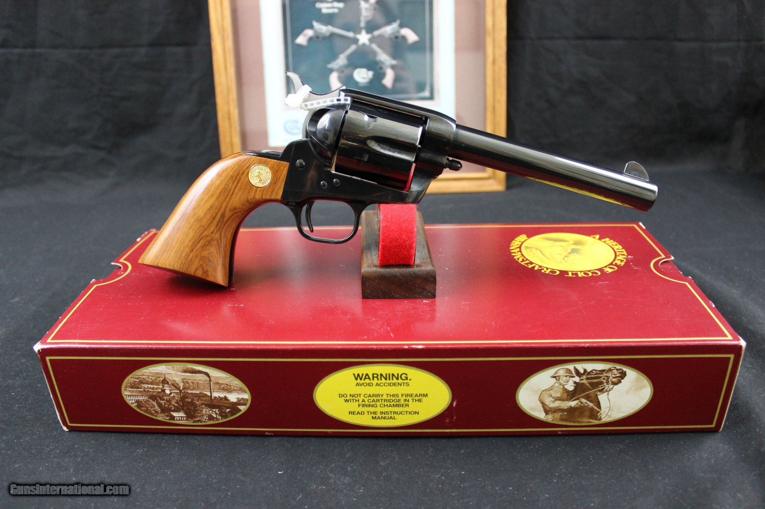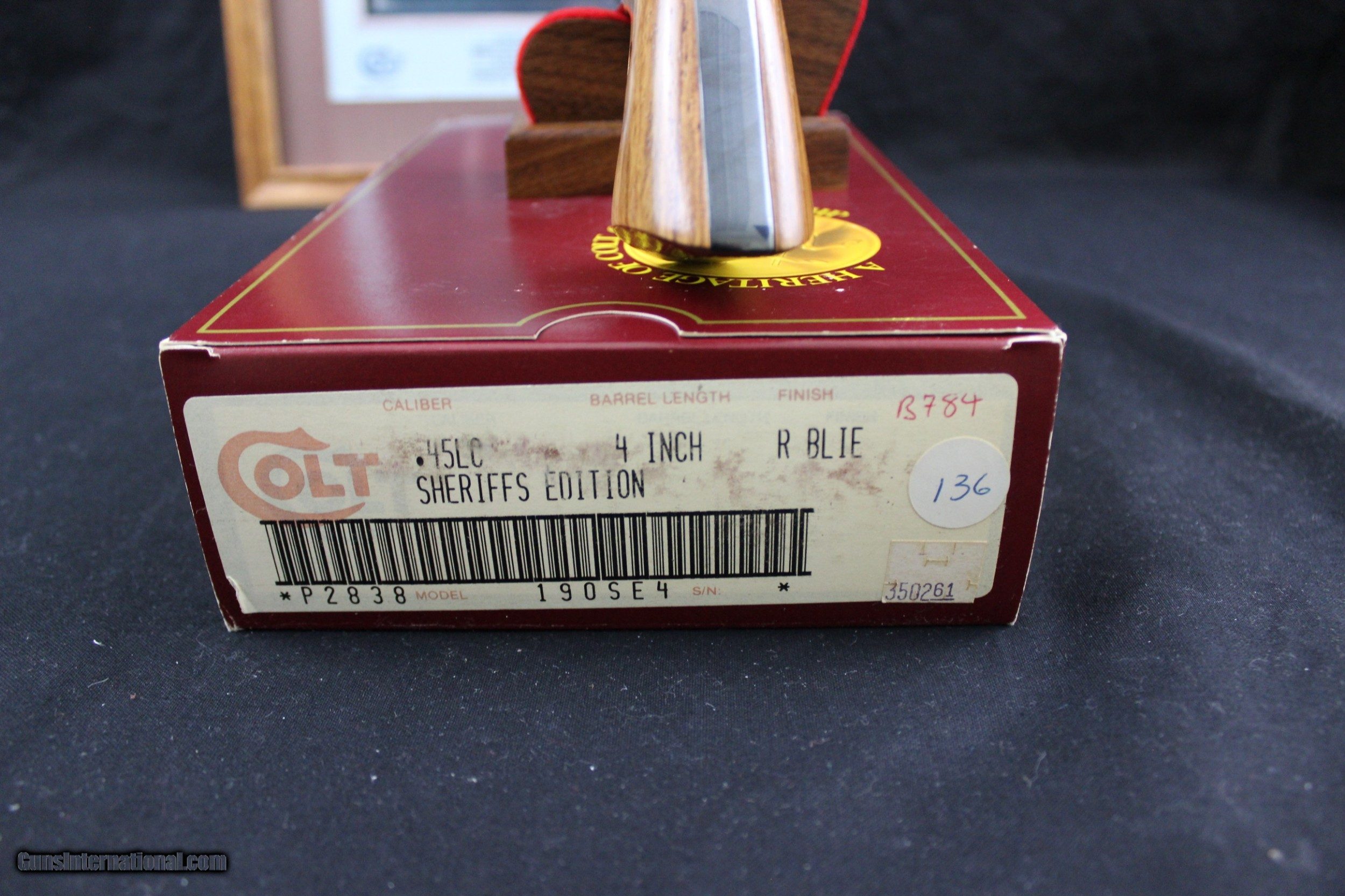 Description: Colt Custom Shop Reserve Cased Set Of Five Sheriff's Edition Single Action Revolvers barrels all with bright excellent bores. All of these revolvers are like new with the metal surfaces retaining 99% plus original blue, the 5 1/2" and 2 1/2" models showing faint signs of having been turned, likely only at the factory, and the remaining revolvers are unturned. The smooth walnut grips with gold Colt medallions all remain in excellent condition. The revolvers are housed in their original walnut and glass display case with accompanying 1987-dated brass badge. The case remains in near excellent condition showing some light handling marks. All five revolvers also include their original factory boxes correctly end-labeled and numbered to the guns as well as the display case key and a small framed informational sheet regarding this limited edition set. The display case measures about 32 1/2" x 28" x 3 1/4" and includes its original cardboard shipping sleeve. This is a wonderful set of revolvers that is a must-have display for the serious Colt collector. Note: due to the size of the display case extra shipping will apply. SOLD |