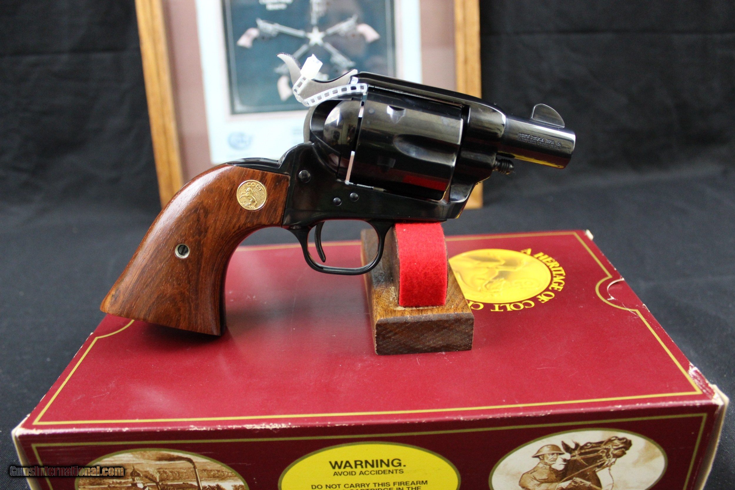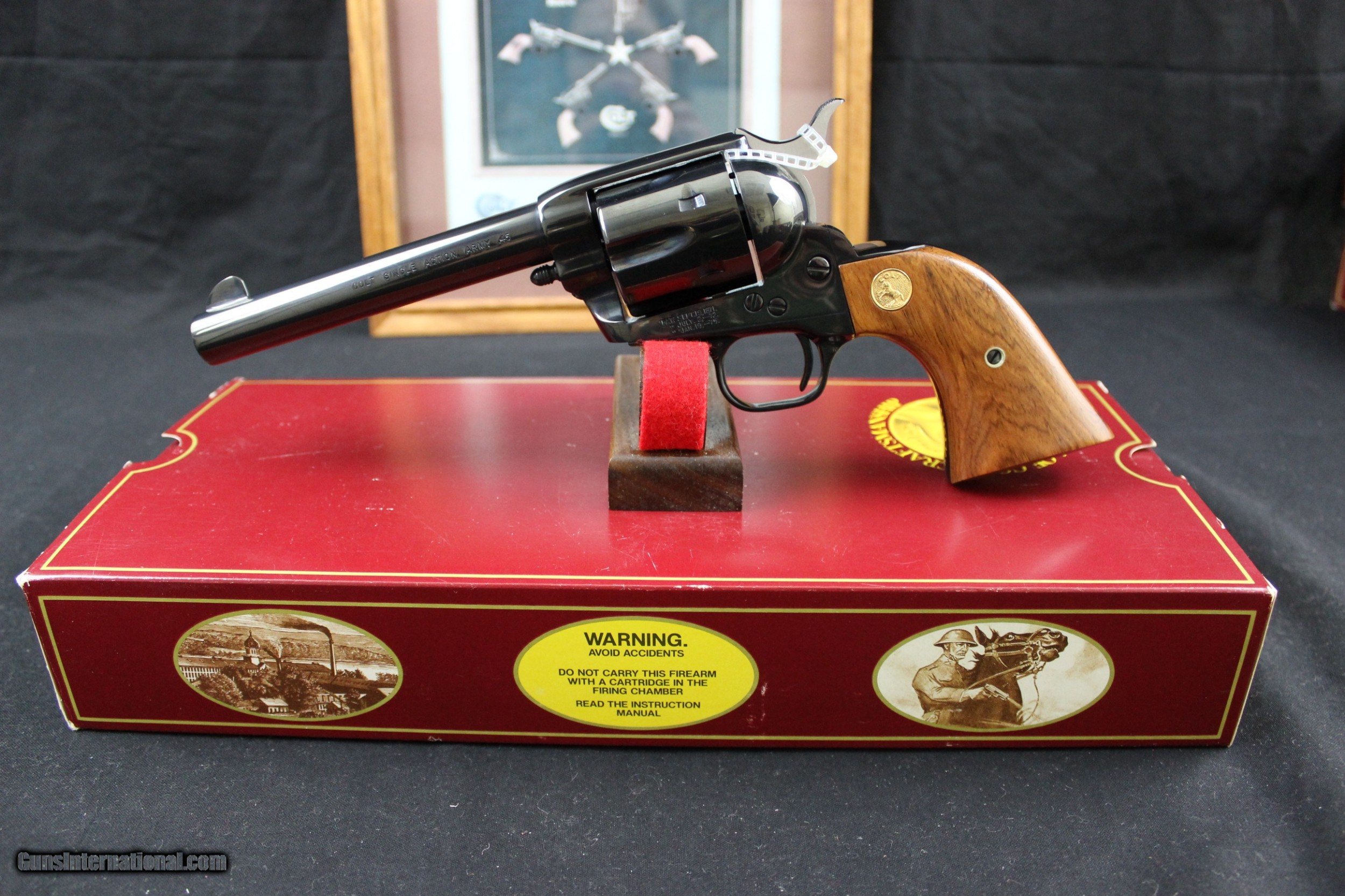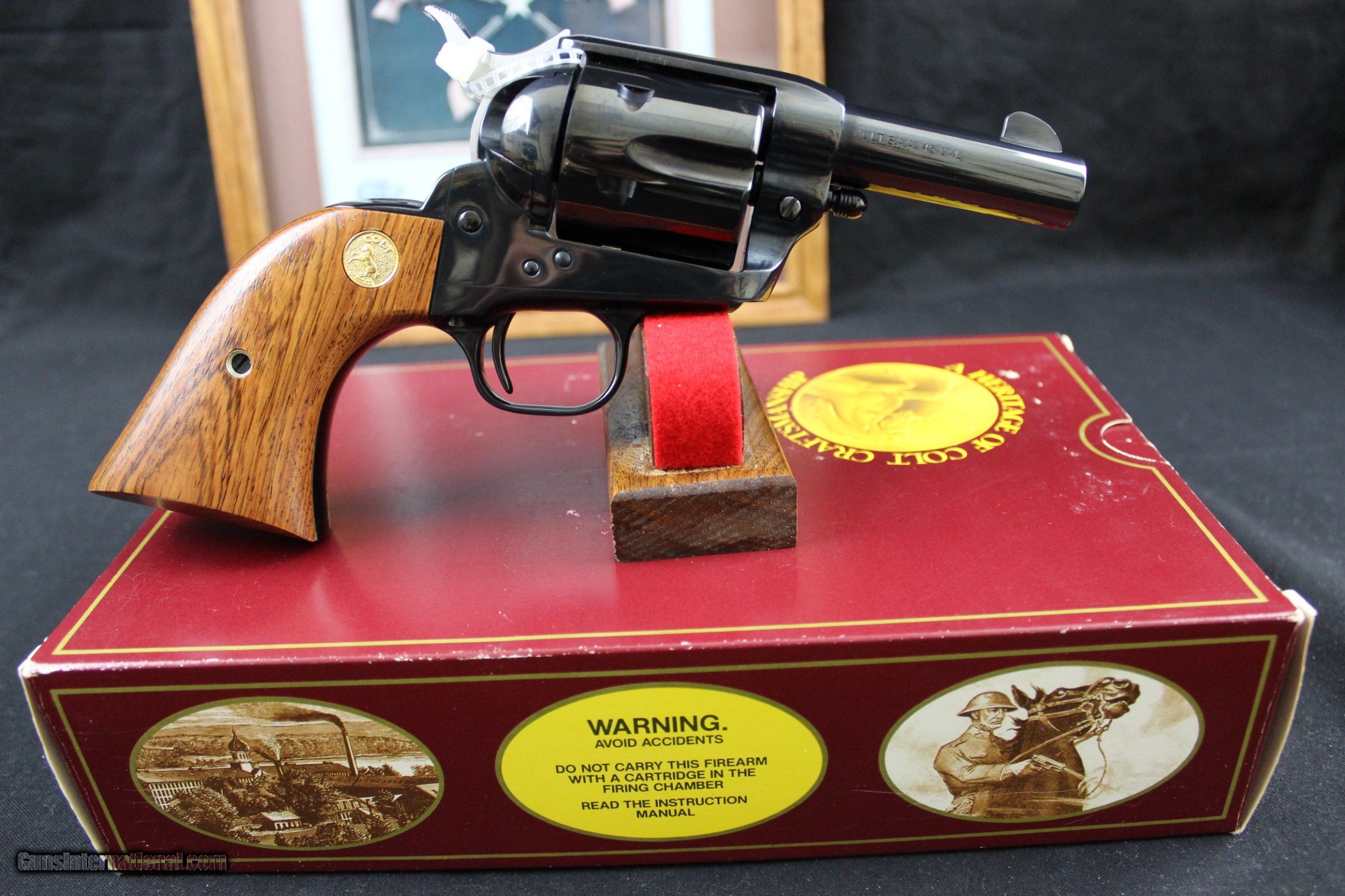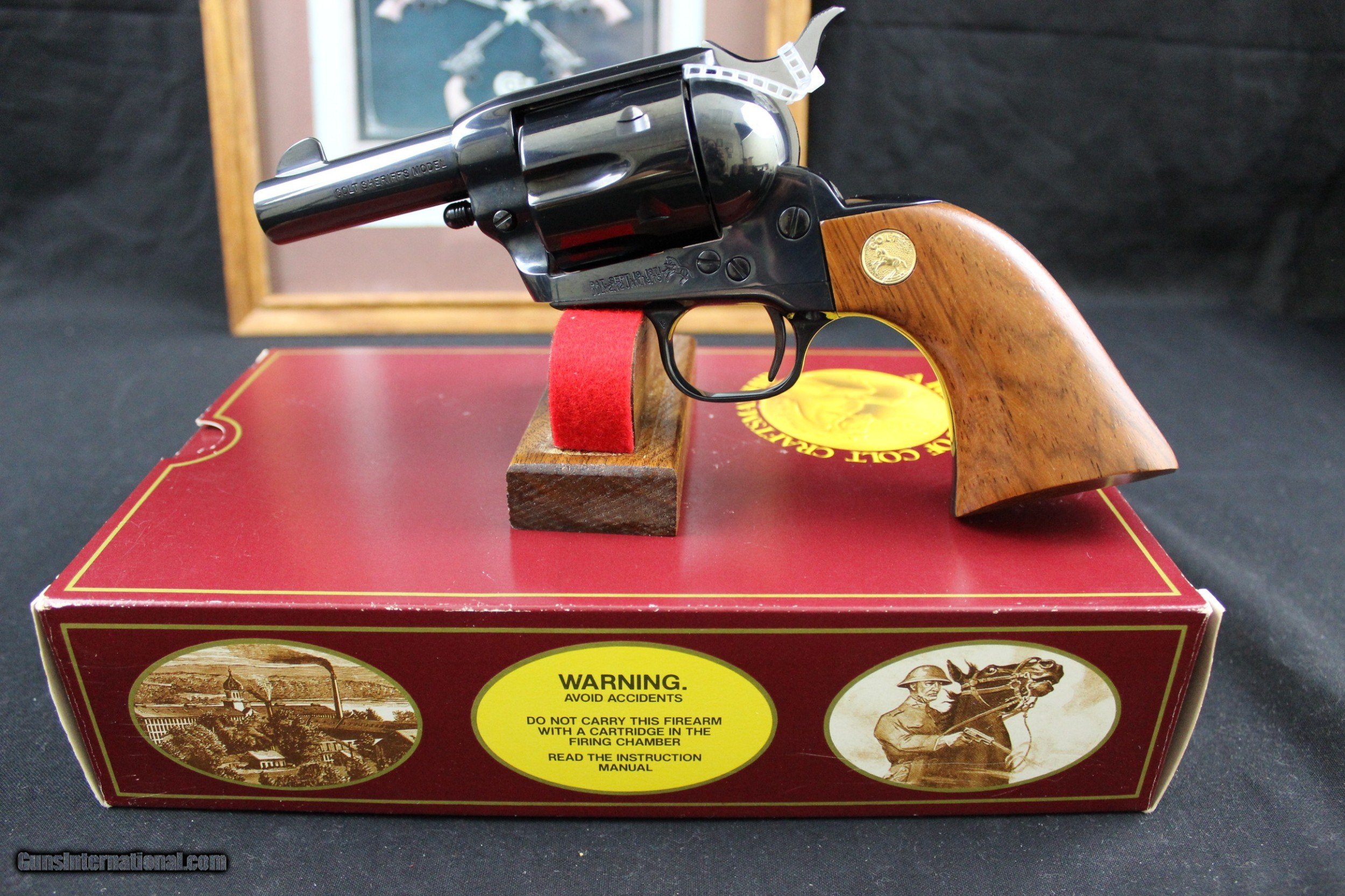 Description: Colt Custom Shop Reserve Cased Set Of Five Sheriff's Edition Single Action Revolvers barrels all with bright excellent bores. All of these revolvers are like new with the metal surfaces retaining 99% plus original blue, the 5 1/2" and 2 1/2" models showing faint signs of having been turned, likely only at the factory, and the remaining revolvers are unturned. The smooth walnut grips with gold Colt medallions all remain in excellent condition. The revolvers are housed in their original walnut and glass display case with accompanying 1987-dated brass badge. The case remains in near excellent condition showing some light handling marks. All five revolvers also include their original factory boxes correctly end-labeled and numbered to the guns as well as the display case key and a small framed informational sheet regarding this limited edition set. The display case measures about 32 1/2" x 28" x 3 1/4" and includes its original cardboard shipping sleeve. This is a wonderful set of revolvers that is a must-have display for the serious Colt collector. Note: due to the size of the display case extra shipping will apply. SOLD |