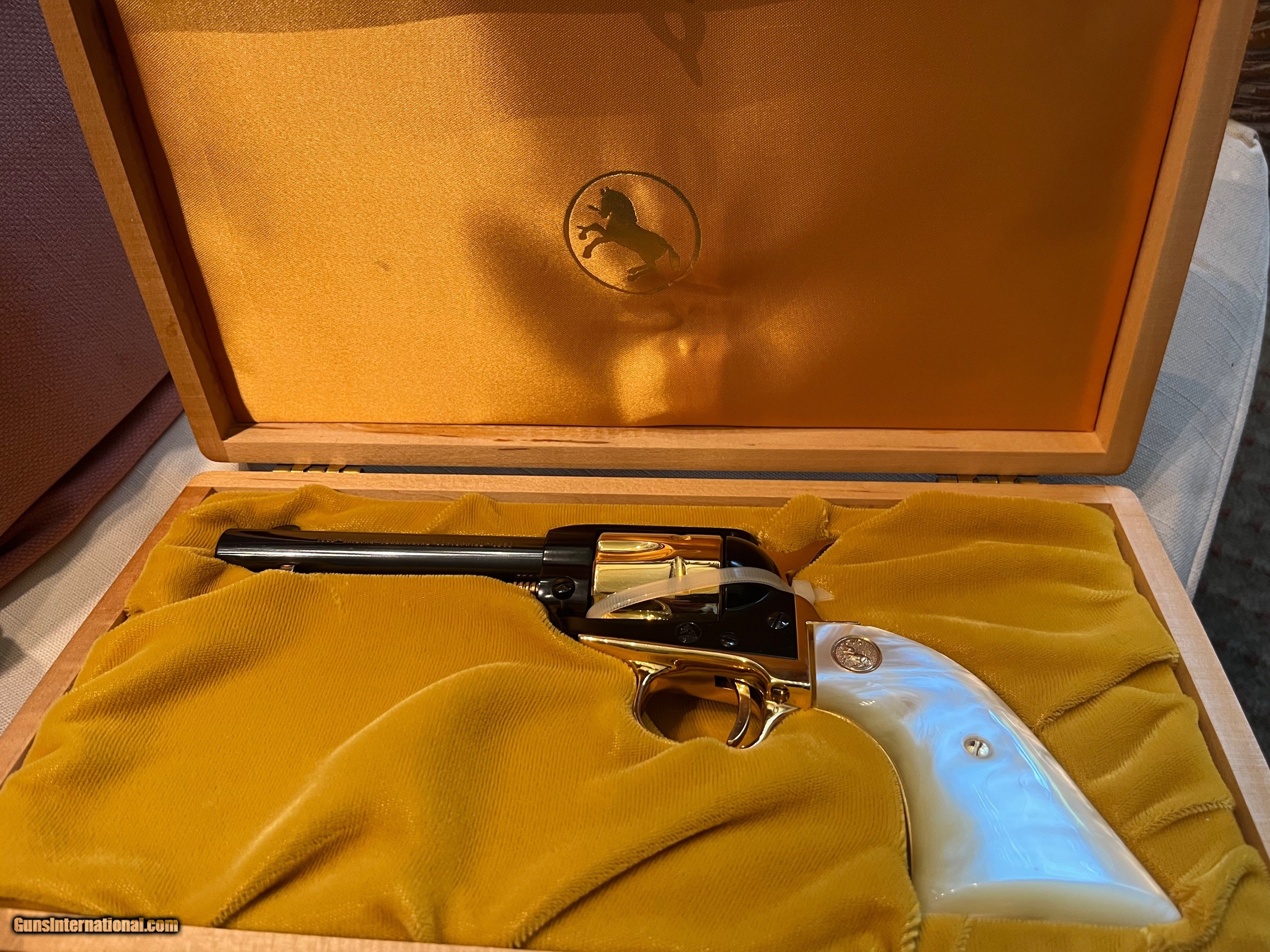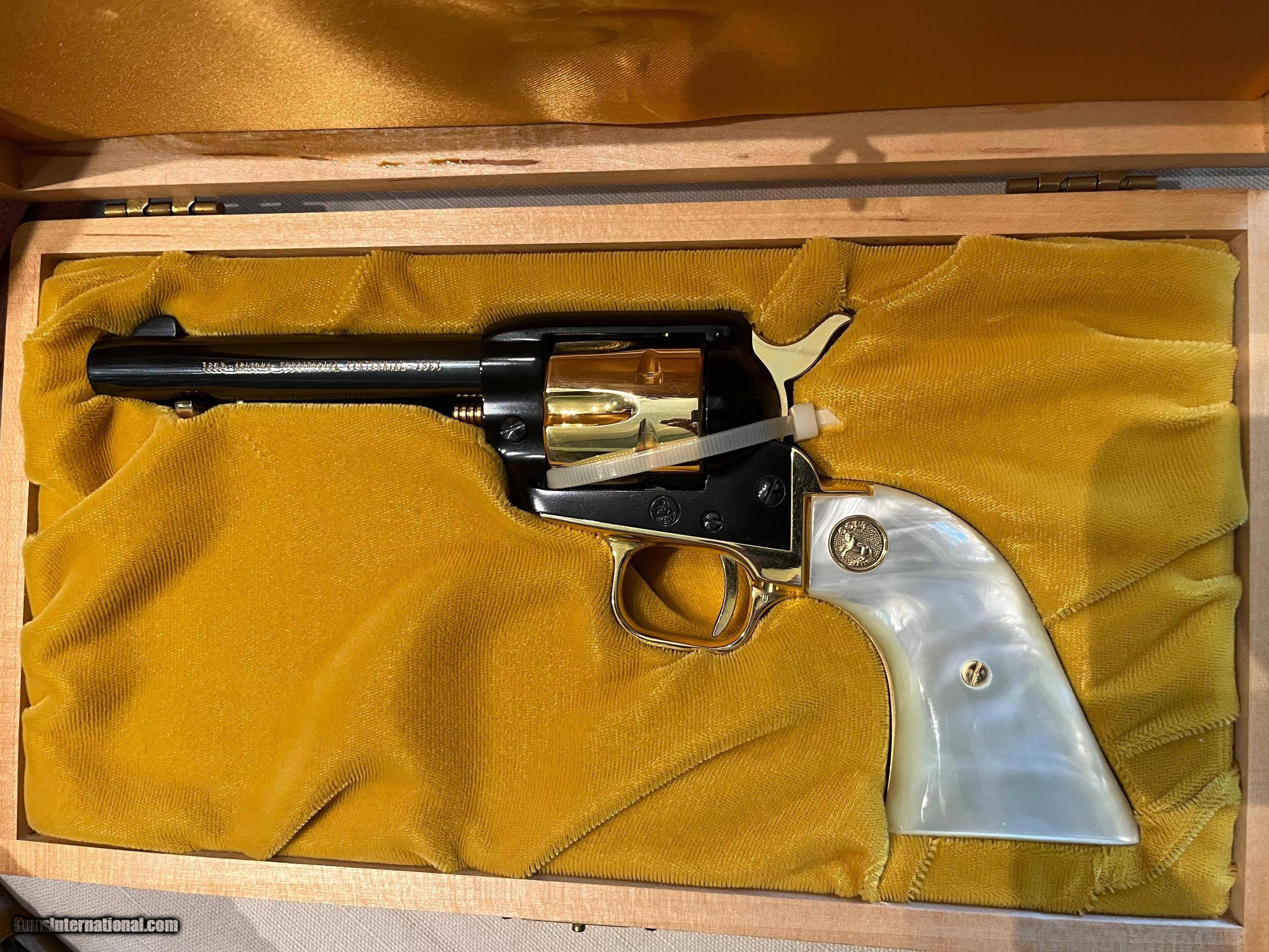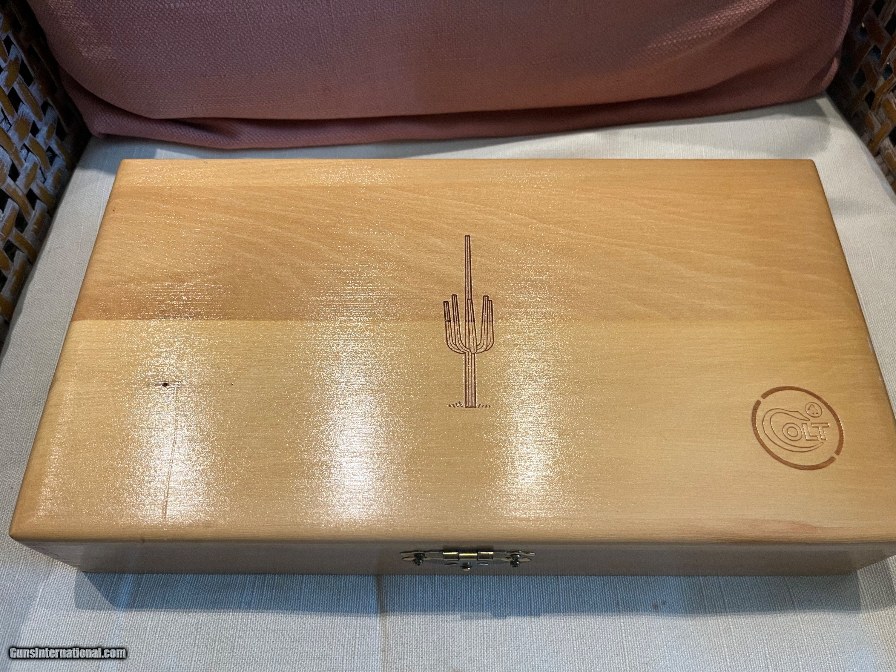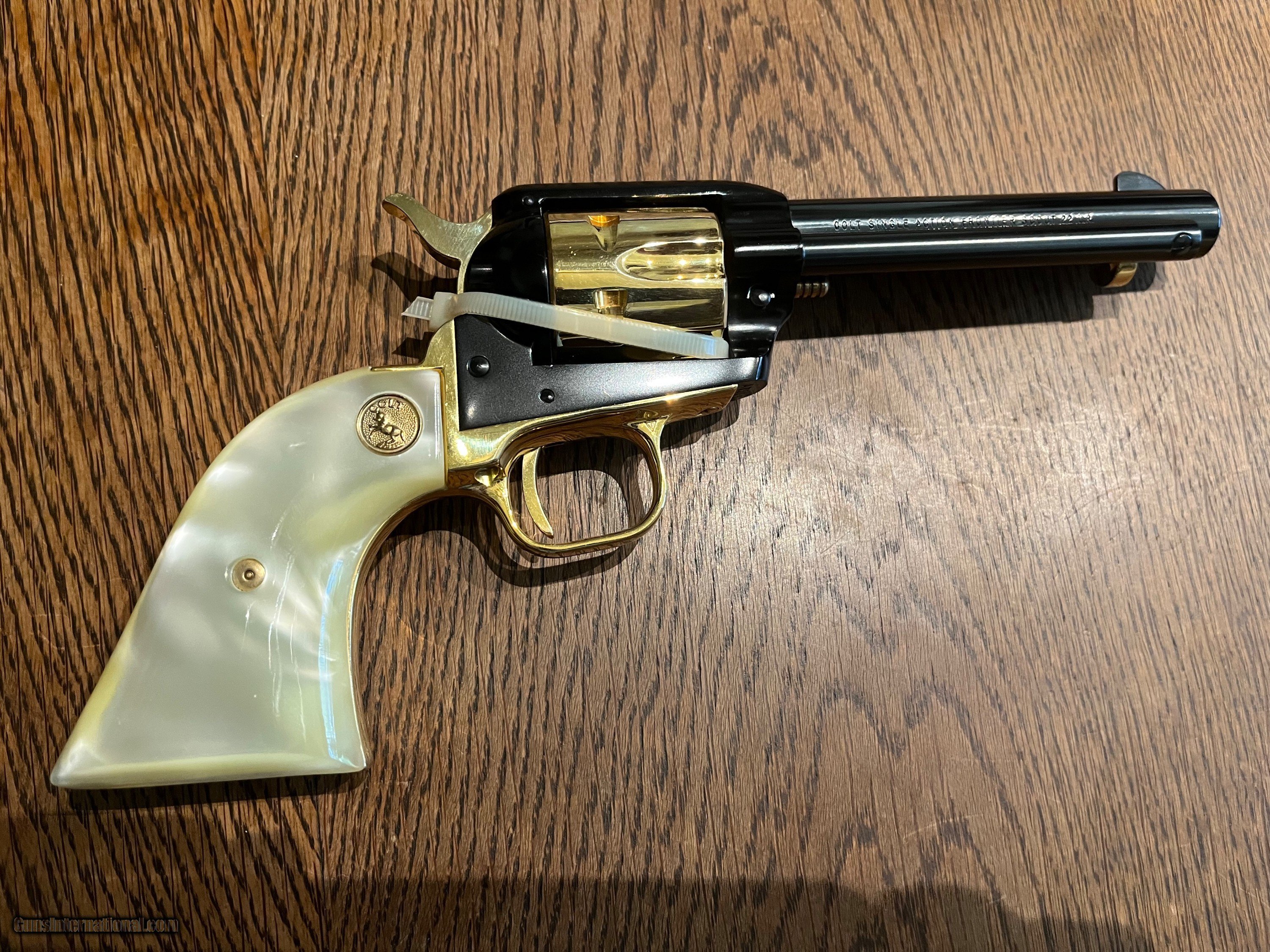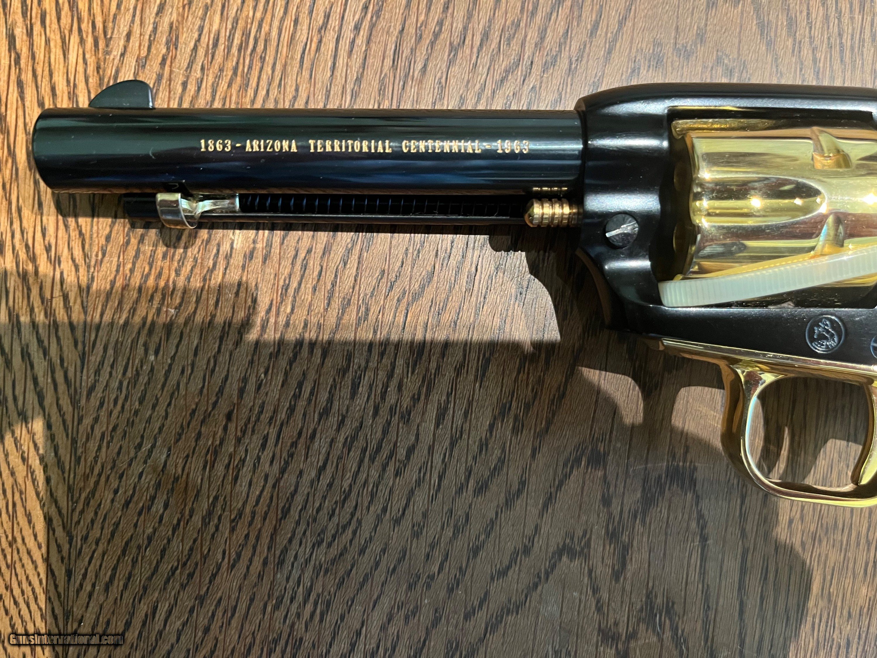 Description: $950 Colt Single action Frontier Scout, Arizona Territorial Centennial 1863-1963, new in wood display box. Unturned cylinder, black frame & barrel, gold grip & cyl. A beautiful piece in a very nice blonde box. Shipping to lower 48 states is included in price. SOLD Curio/Relic: Yes Handgun Caliber: .22 Long Rifle Manufacturer: Colt Model: Frontier Scout Serial Number: AT505 Barrel Length: 4 3/4 Condition: NEW Item Location: Ca. |