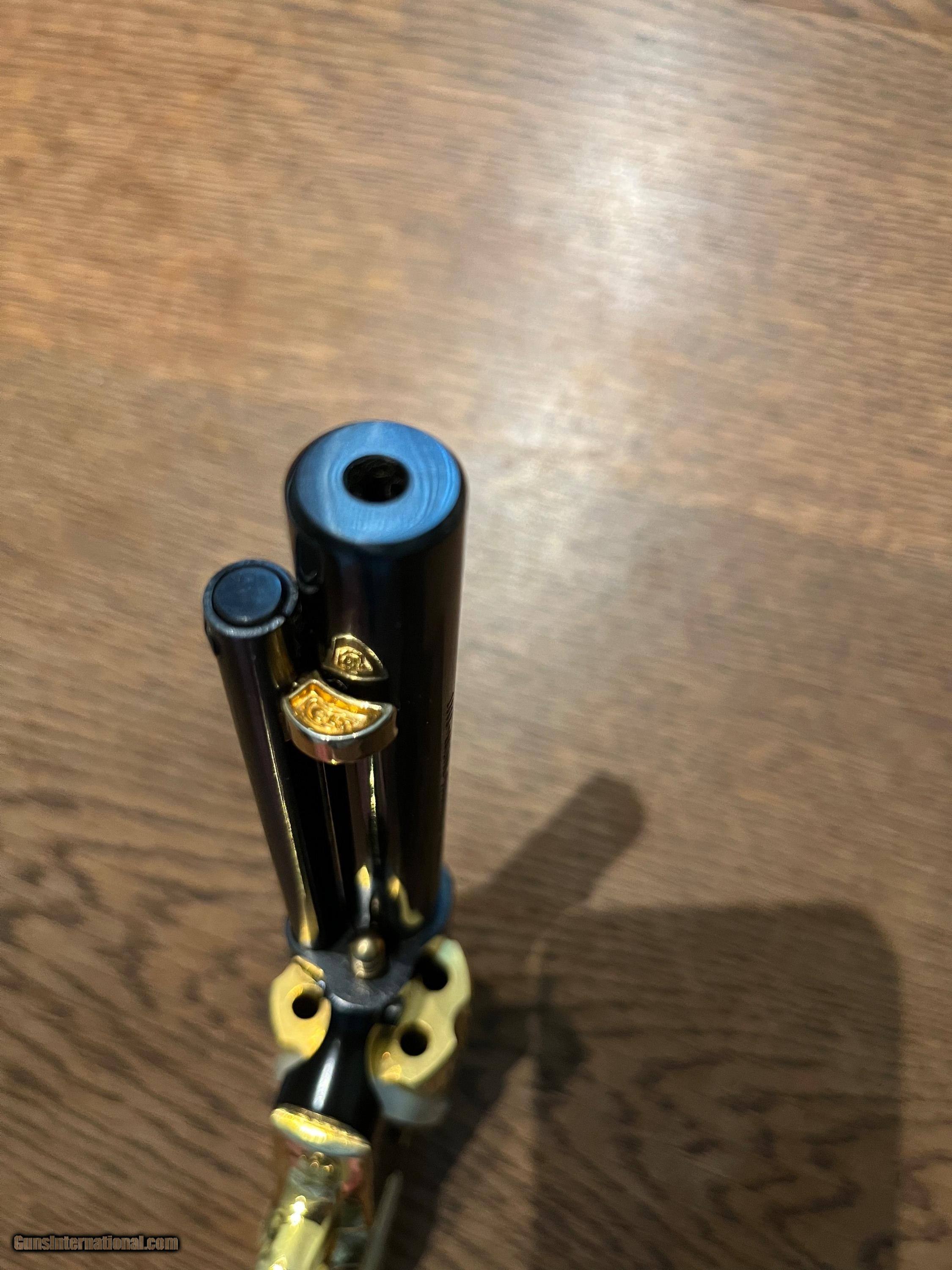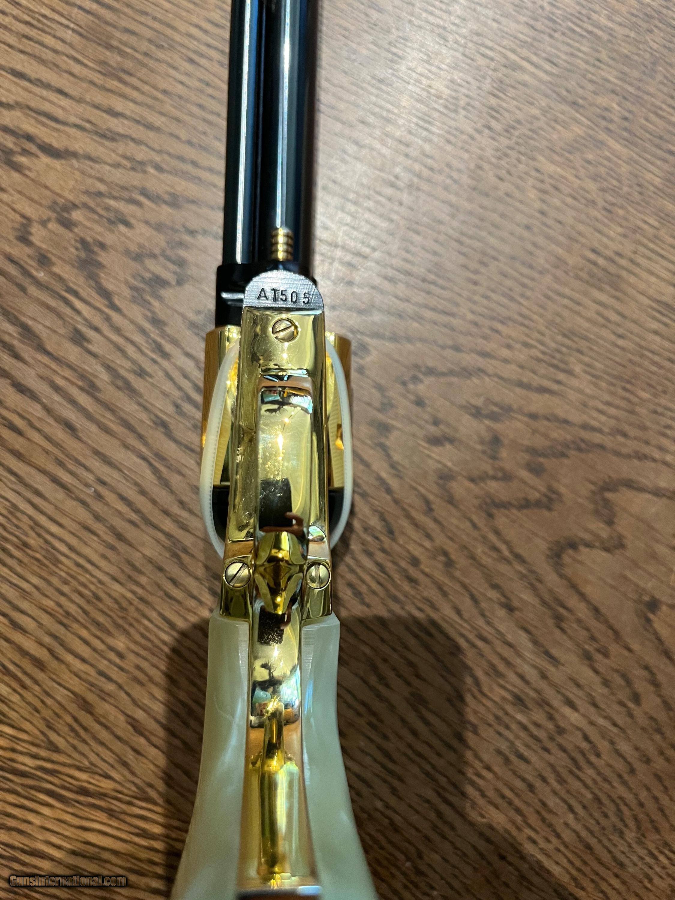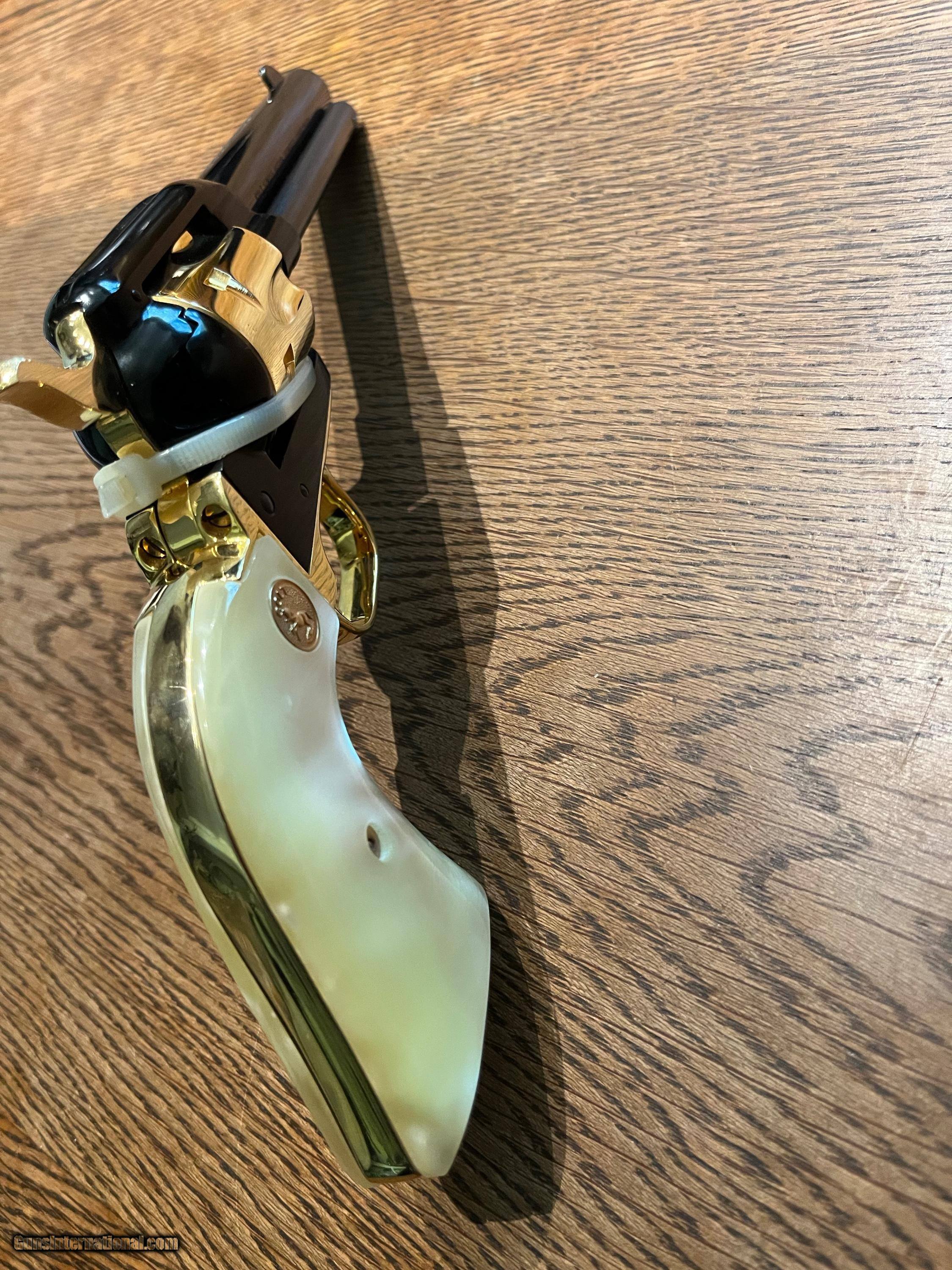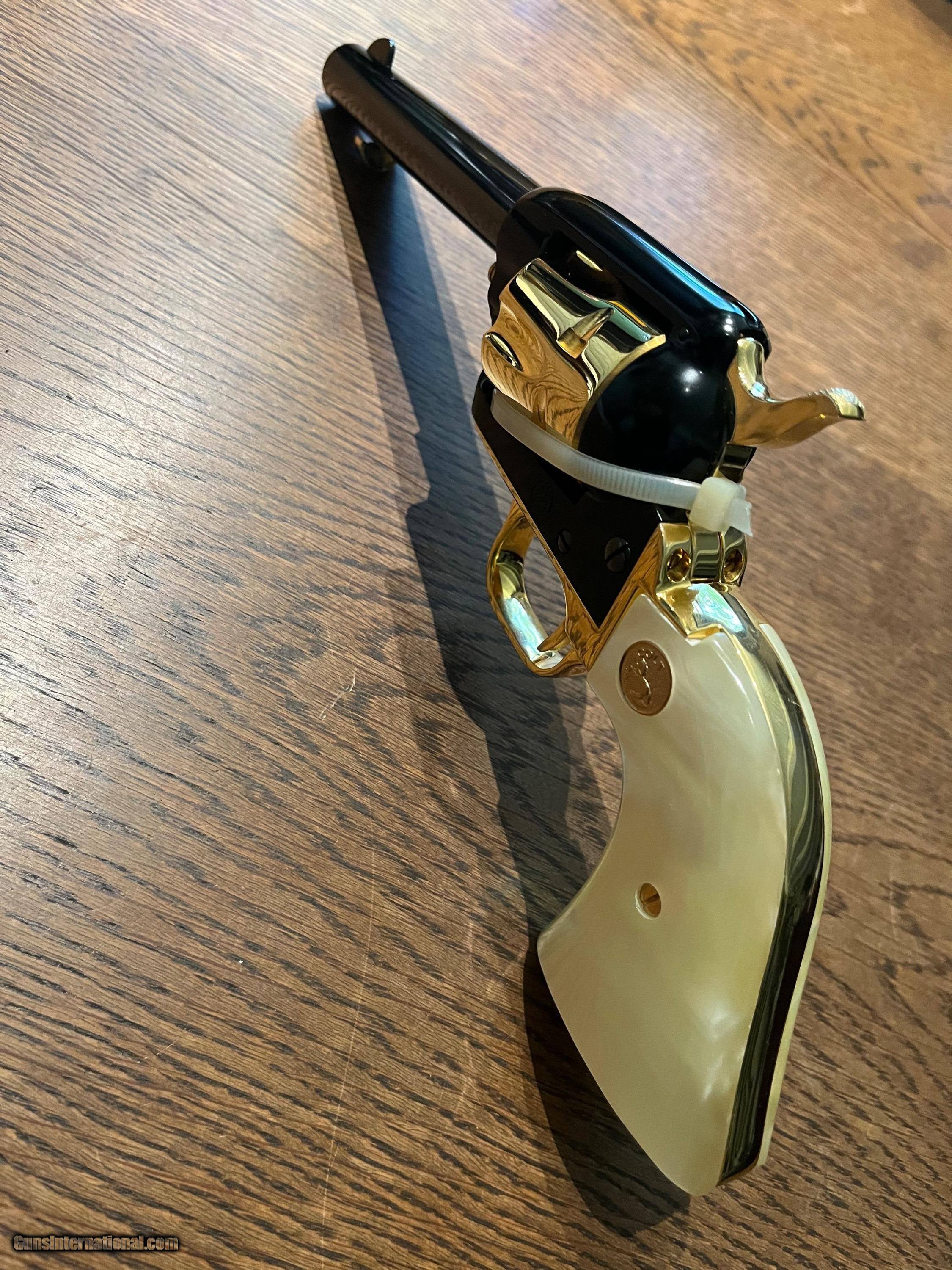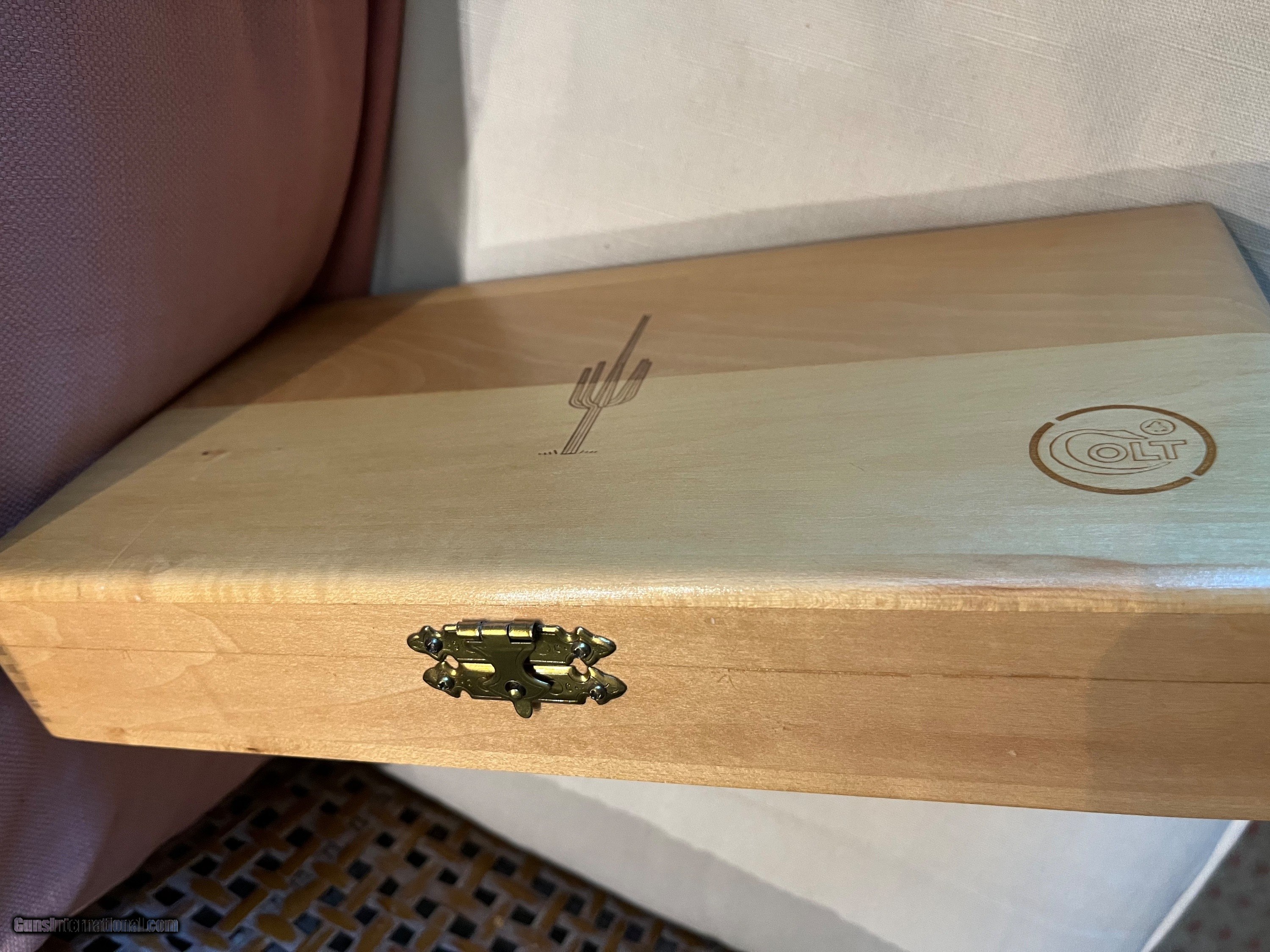 Description: $950 Colt Single action Frontier Scout, Arizona Territorial Centennial 1863-1963, new in wood display box. Unturned cylinder, black frame & barrel, gold grip & cyl. A beautiful piece in a very nice blonde box. Shipping to lower 48 states is included in price. SOLD Curio/Relic: Yes Handgun Caliber: .22 Long Rifle Manufacturer: Colt Model: Frontier Scout Serial Number: AT505 Barrel Length: 4 3/4 Condition: NEW Item Location: Ca. |