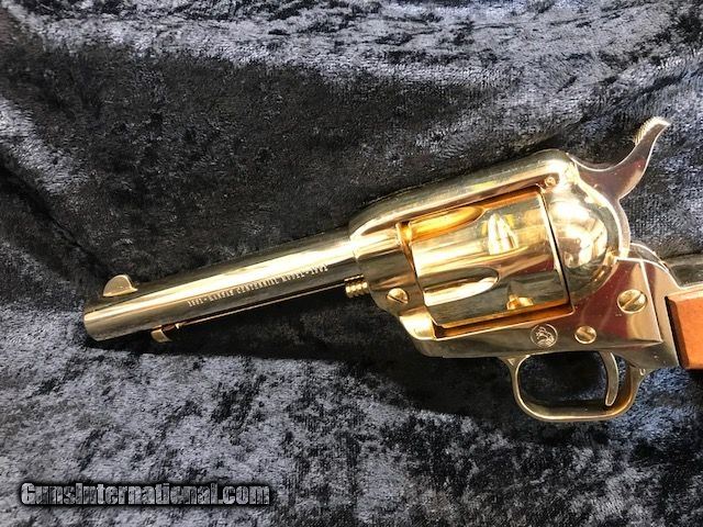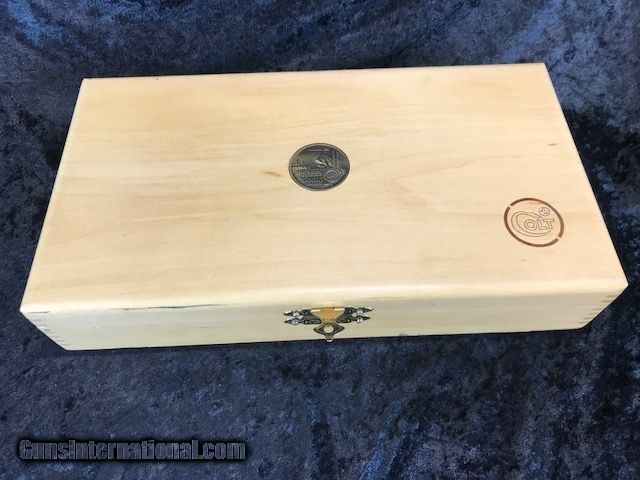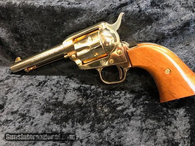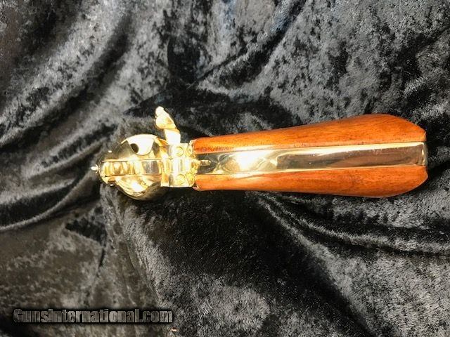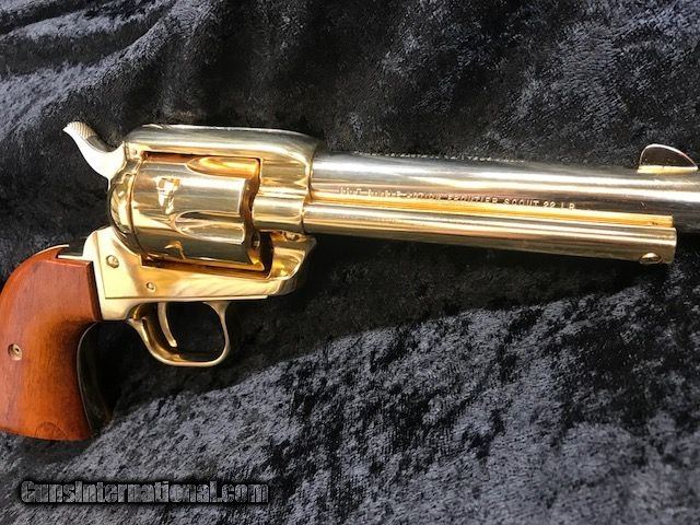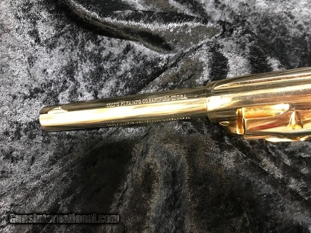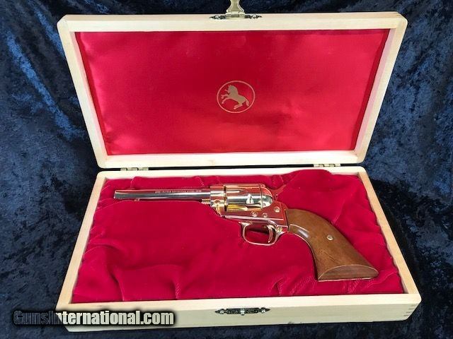 Description: Here is an immaculate Colt Frontier Scout commemorating the Kansas Centennial. Entire gun is gold plated, and the original smooth wood grips are perfect. Complete with hardwood, velvet lined display case. No turn line on cylinder, and no fouling on face of cylinder. Barrel is marked, "1861 - Kansas Centennial Model - 1961." Butt of grip frame nicely engraved as well. A real beauty of a commemorative single action. SOLD Manufacturer: Colt Model: Frontier Scout - Kansas Centennial Model Caliber Info: 22 LR |