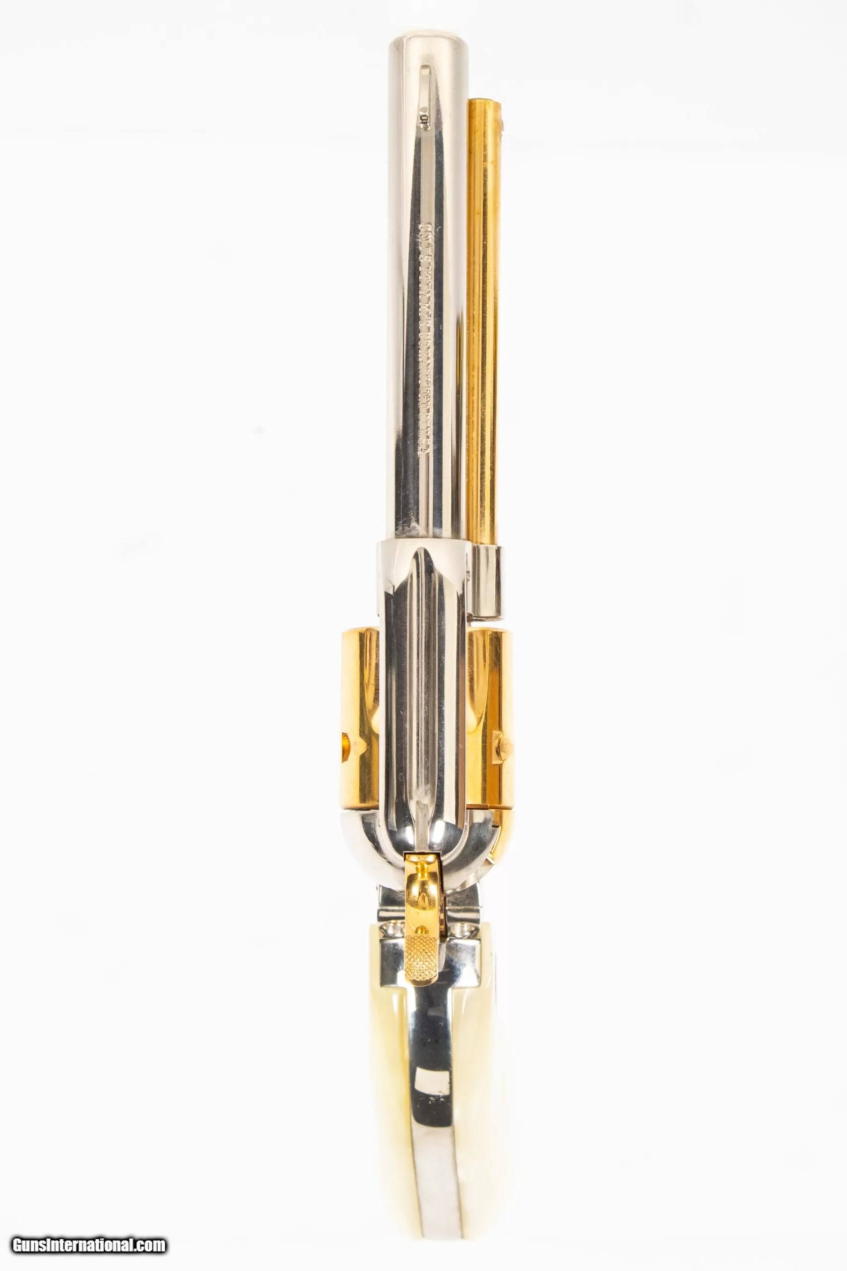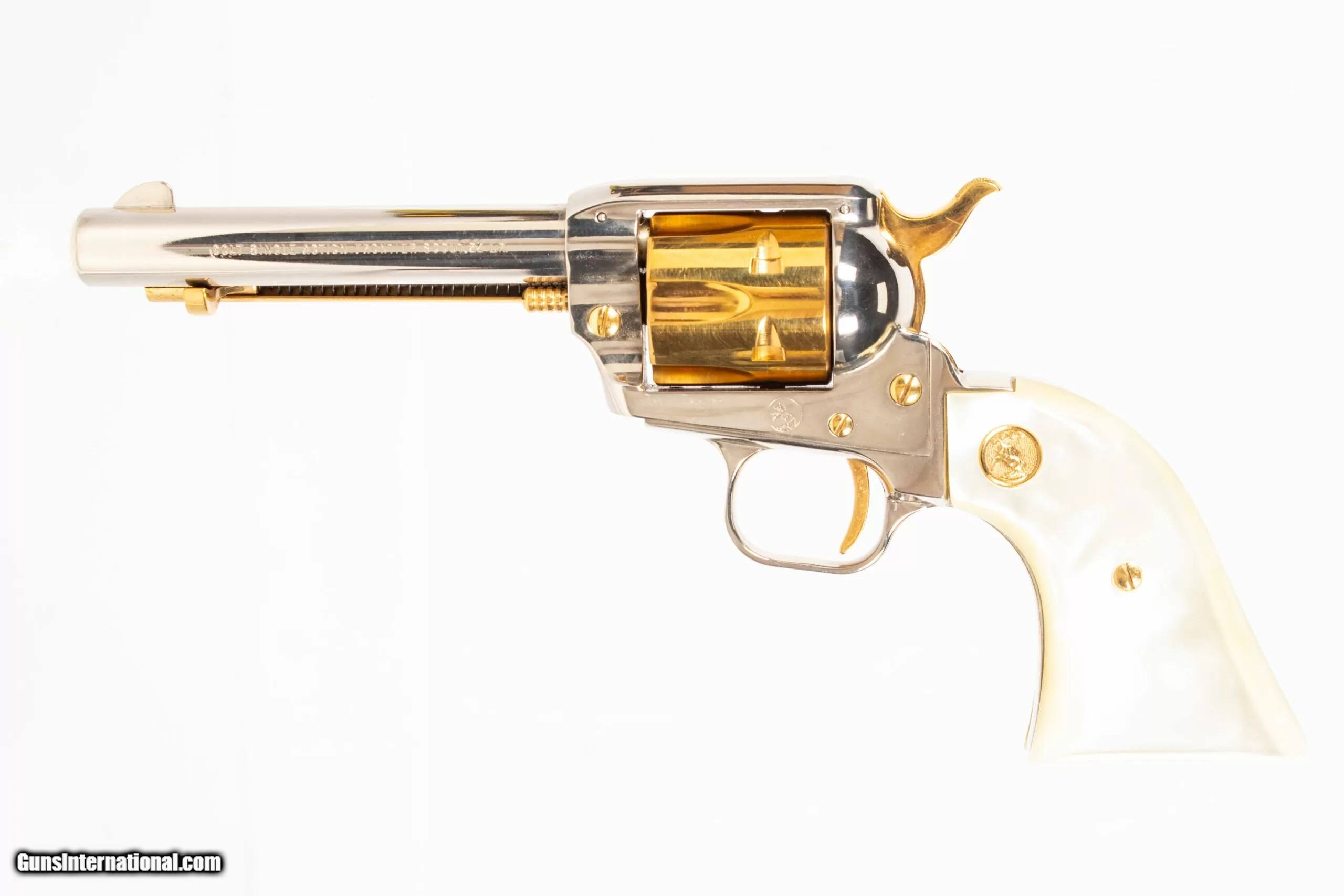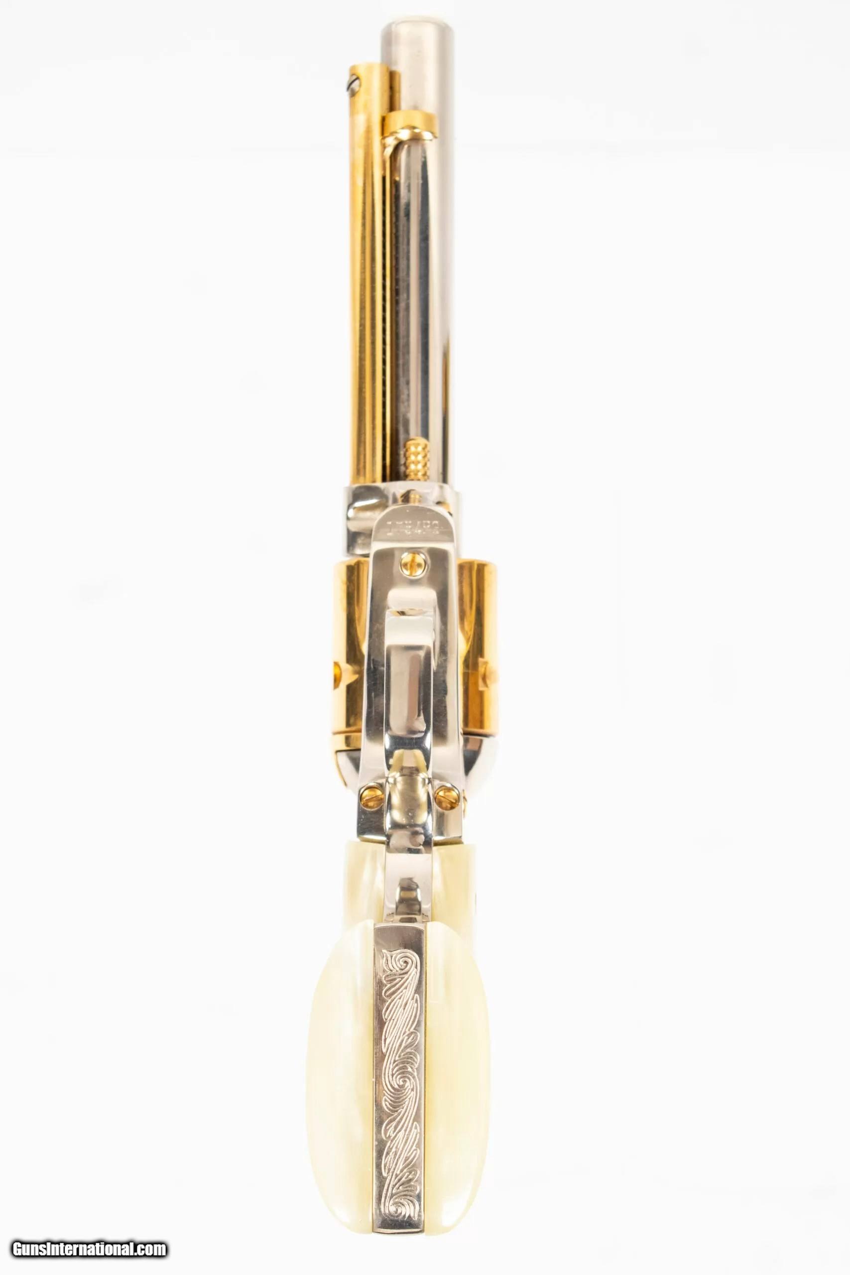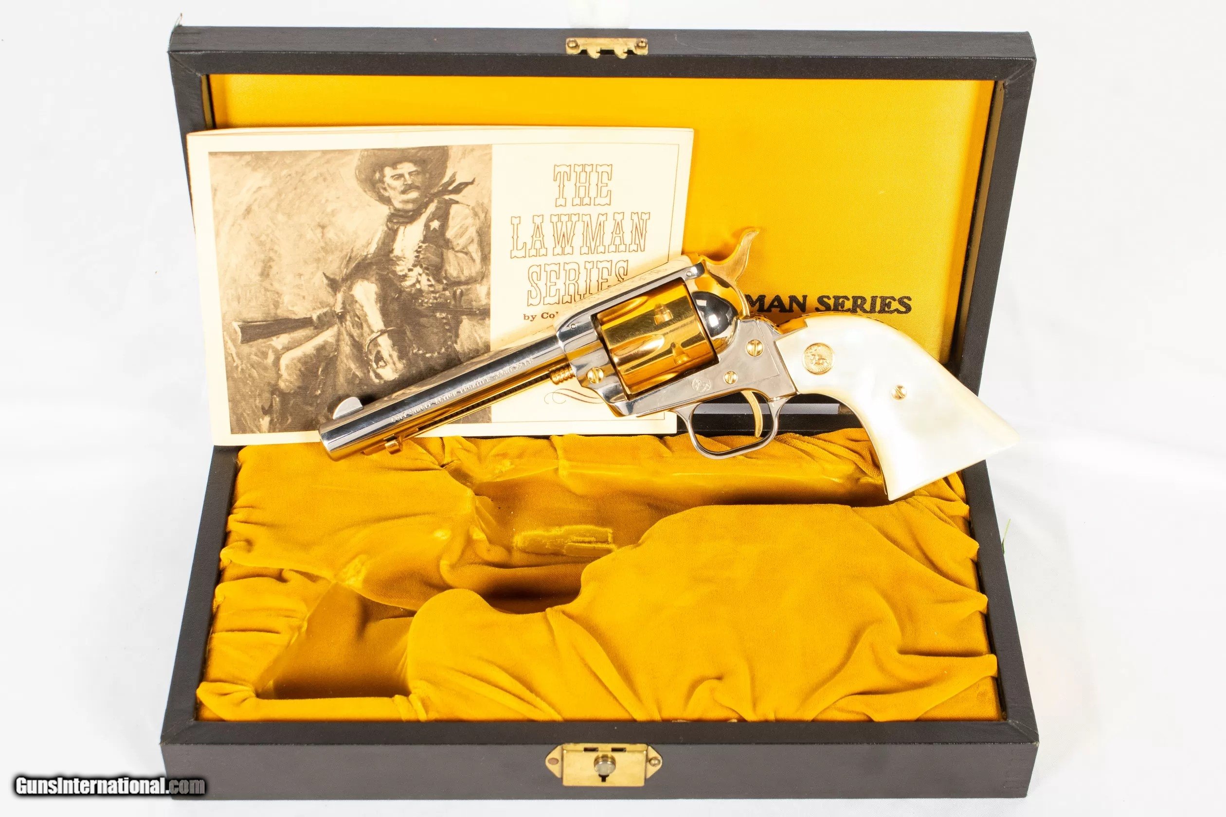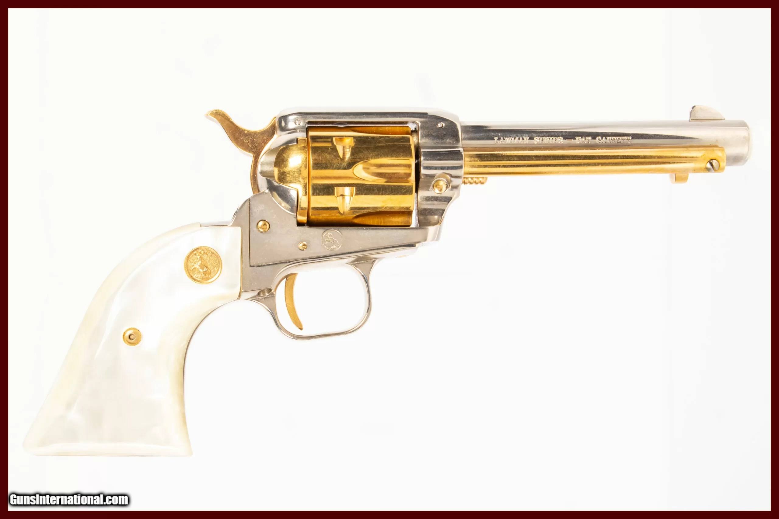 Description: Colt Frontier Scout Lawman series, Pat Garrett edition chambered for .22 Long Rifle with 4.75-inch barrel, nickel with gold ejector assembly, six-shot fluted cylinder, hammer, trigger, and detail, white marble-'Pearlite' grips with Colt medallions, barrel special edition mark, and heel flourish engraving. Includes vinyl-bound display case with gold velvet bed and exterior embossing and associated special edition pamphlet. The NRA grading condition for this USED firearm is Very Good. We ship domestically in the United States. Additional shipping rates apply to Alaska and Hawaii. Dury’s Lifetime Warranty: All firearms purchased from Dury’s Gun Shop, NEW or USED, are covered by a lifetime warranty. We will repair or replace, at our discretion, any firearm purchased from Dury’s Gun Shop, Inc. for as long as it is owned by the purchaser. This warranty is not transferable. WE BUY GUNS! NO COLLECTION TOO BIG OR SMALL FOR OUR GUNS INTERNATIONAL CUSTOMERS ALL OF OUR FIREARMS CAN BE PURCHASED DIRECTLY FROM OUR DURY’S GUNS SITE ! SOLD Manufacturer: Colt Model: Frontier Scout Caliber Info: 22 Long Rifle Barrels: 5inches |