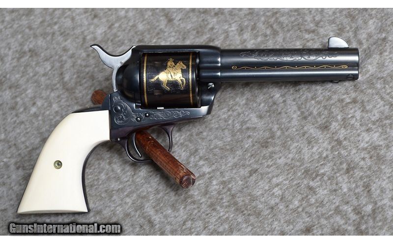 Description: Colt John Wayne Commemorative 3rd Generation Single Action Army (SAA) Standard Edition revolver in .45 Long Colt. The John Wayne Commemorative SAA is in a furniture-grade presentation oak fitted display box. Manufactured in 1982, Colt only made 3,100. A portrait of John Wayne etched in gold is on left side of cylinder and John Wayne on horseback is etched in gold on right side of cylinder. The left side of the barrel has a gold etched American Eagle holding a banner with the inscription "John Wayne." The back strap has John Wayne's signature etched in gold. This pistol appears new and unfired. .45 Colt SOLD Metal Condition: Excellent Bore Condition: Excellent Barrels: 4.75 Weight: 2 lb 4 oz Item Location: Boise, ID |