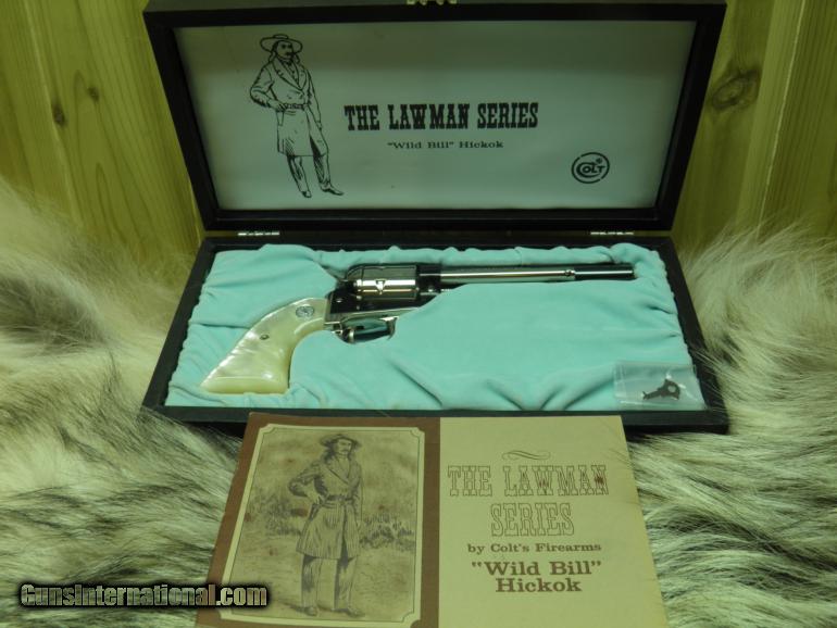 Description: COLT LAWMAN SERIES WILD BILL HICKOK SA/SCOUT 22LR MANF: 1969 3RD GUN OF SERIES OF FOUR,MADE AND ASSEMBLED IN THE SECOND GENERATION ERA: BARREL LENGTH 6". BRIGHT BLUE FINISH ON FRAME AND BARREL, BRIGHT NICKEL FINISH ON CYLINDER, LOADING GATE, TRIGGER GUARD, BACKSTRAP,EJECTOR ROD HOUSING,HAMMER, TRIGGER, AND SCREWS. WHITE PEARL LITE GRIPS, WITH COLT SILVER MEDALLIONS. GUN REST IN A FITTED CASE THATS TRIMMED IN A LIGHT BLUE VELVET,EXTERIOR OF CASE IS OF BLACK LEATHER TYPE MATERIAL THAT MEASURES 13 3/4" WIDE X 7" DEEP. INCLUDES KEY, COLT WARRANTY PAPERS, AND WILD BILL HICKOK BOOKLET. "CONDITION" NEW AND UNFIRED WITH NO TURN MARKS. SOLD |