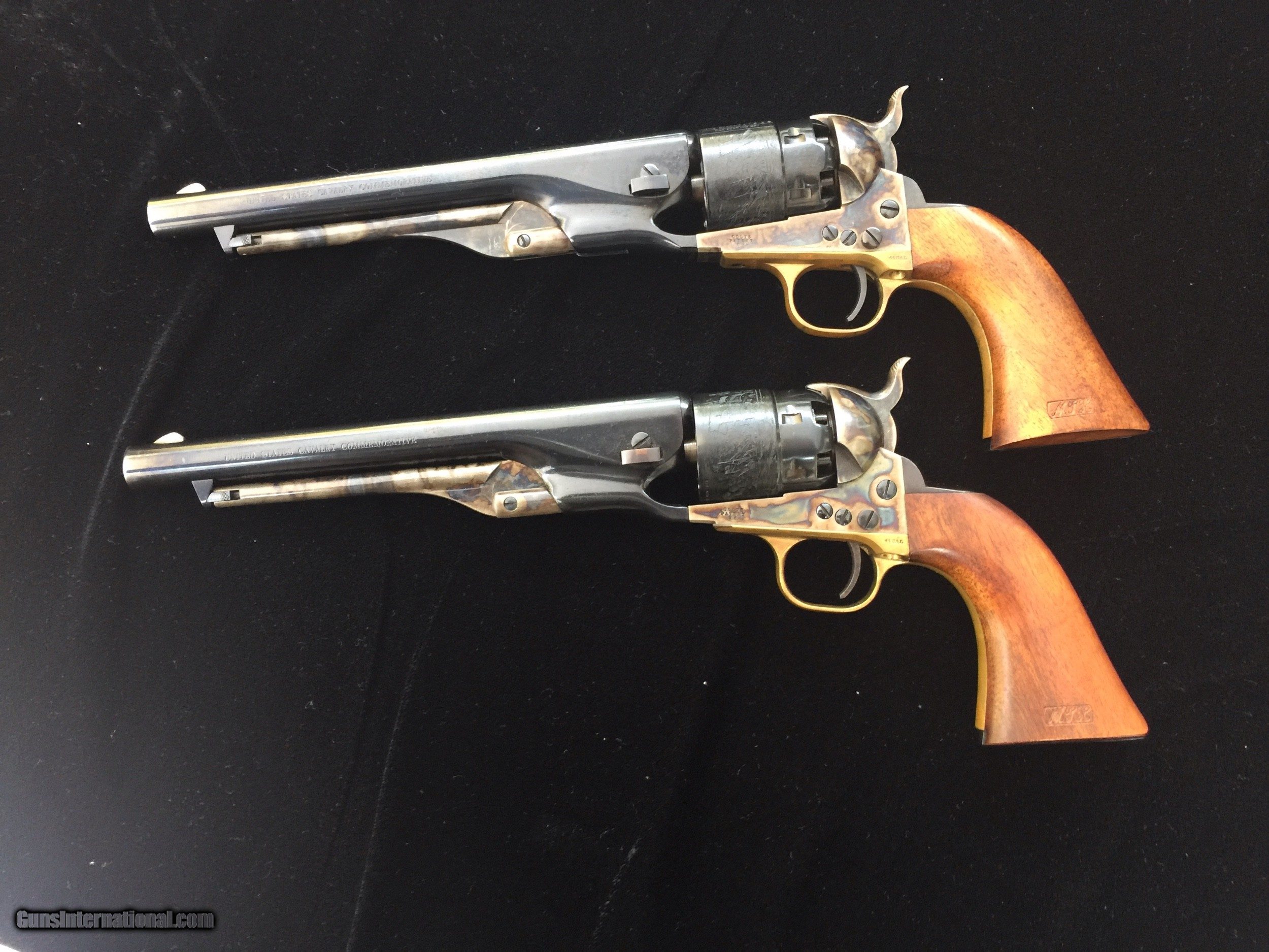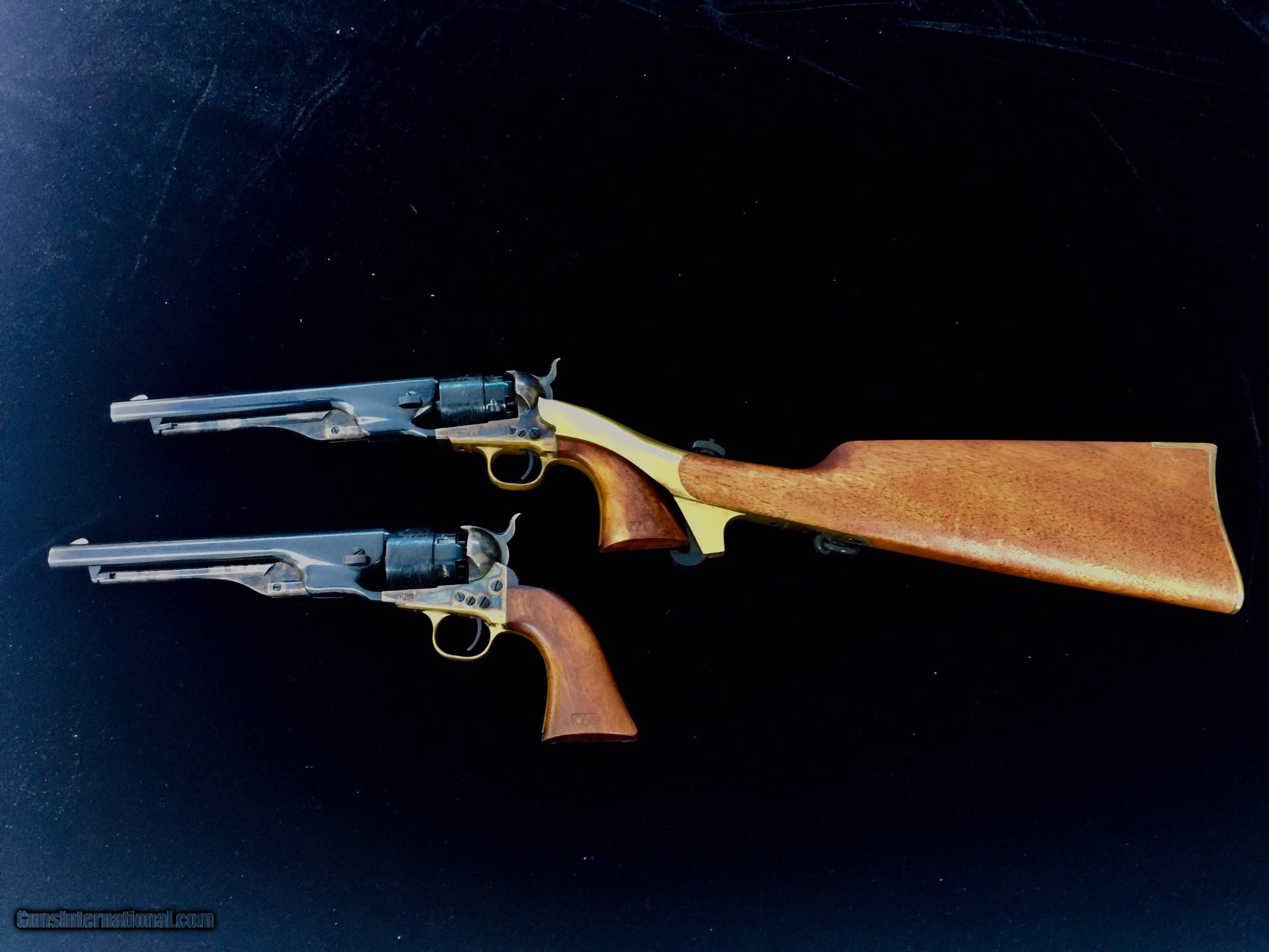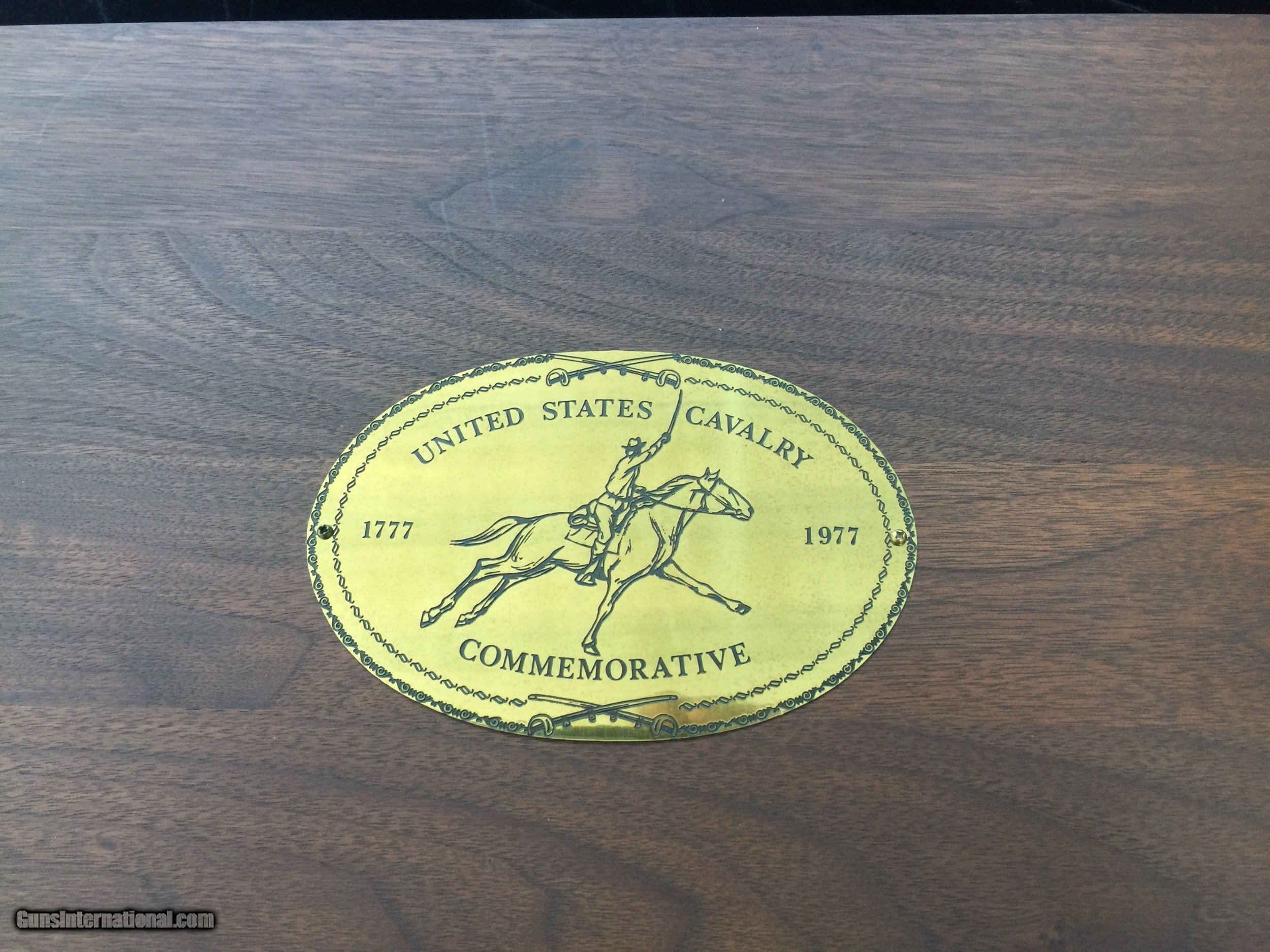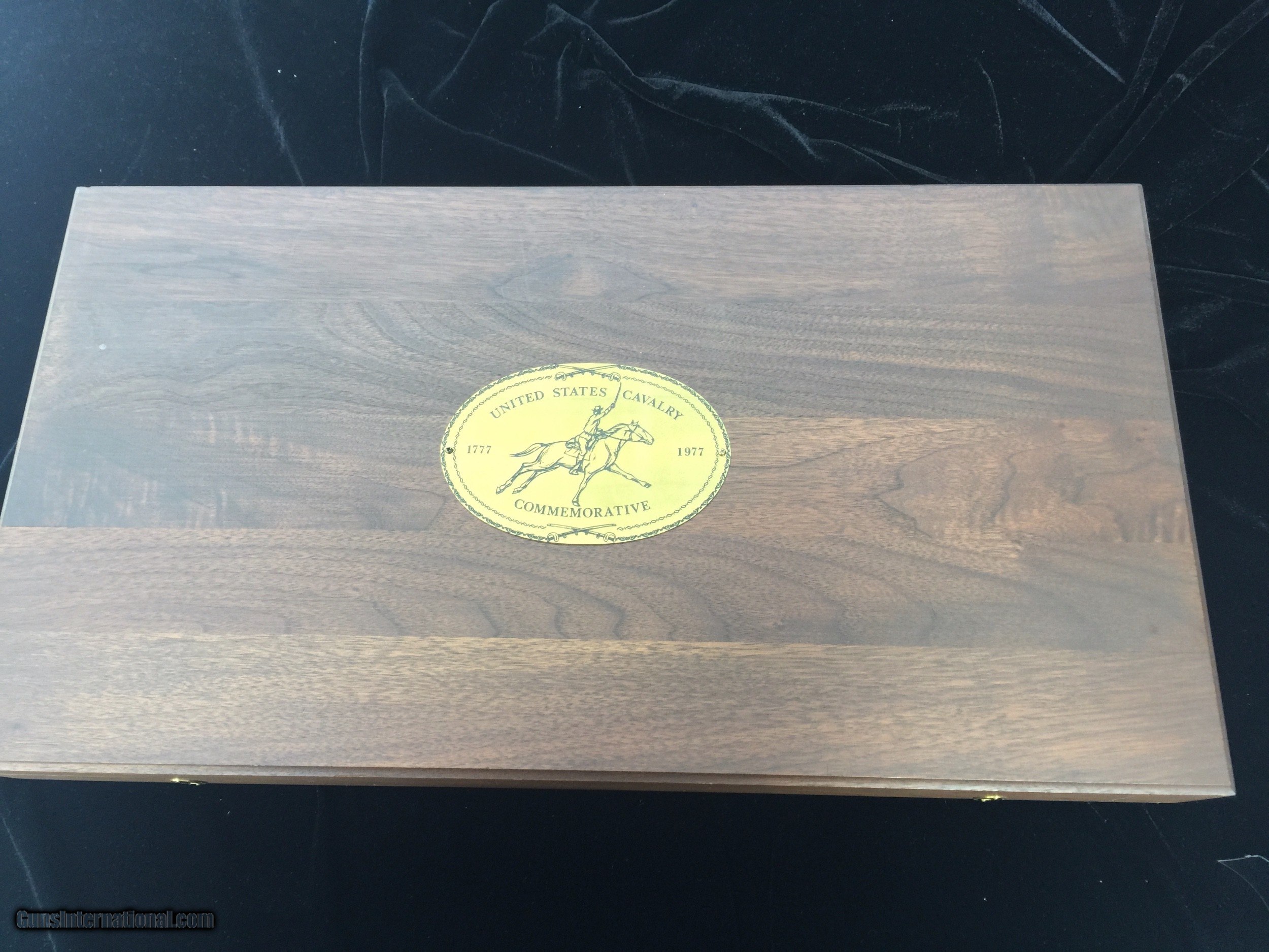 Description: COLT M1860 US CALVERY COMERATIVE SET. CASED PAIR MODEL 1860 PERCUSSIO 2ND GENERATION. MATCH SET -- REVOLVER SERIAL # US 2546 & US2546 44 CALIBER 8 INCH BARRELS UNFIRED. ABSOLUTLY NO TURN RINGS . BARREL SIDES MARKED UNITED STATES . CASE HARDENED COLOR ON HAMMER , FRAME, AND LOADING ARE COLT STRAW COLORS. NEW CONDITION. SMOOTH WALNUT GRIPS WITH CARTOUCHE ON BOTH SIDES NEW . ALL NUMBERED PARTS AND GRIPS ARE CORRECTLY SERIAL NUMBERED TO REVOLVERS. BEAUTIFUL SET IS DISPLAYED IN A WALNUT PRESENTATION CASE WITH A BRASS PLAQUE ON THE COVER DEPICTING A CHARGING CALVERY MAN MARKED " UNITED STATES CALVERY COMMERATIVE / 1777-1977. ALSO INCLUDED IN THE BLUE VELVET PRESENTATION IS A WOOD SHOULDER STOCK WITH BRASS MOUNTED HARDWARE NUMBERED # US 2546. DUAL CAVITY STEEL BULLET MOLD FOR ROUND AND CONICAL BALL SPURE CUTTER MARKED COLTS PATTEN, POWDER FLASK, COMBINATION NIPPLE WRENCH AND SCREW DRIVER. " COLT" MARKED METAL CAP TIN, MANUAL AND PAPER WORK. THIS SET IS NEW , WILL MAKE A GREAT ADDITION TO ANY COLT COLLECTION. SOLD Manufacturer: Colt Model: 1860 2nd Generation Percussion Revolver Commemorative Set Serial Number: # US 2546 and # 2546 US Caliber Info: .44 Chambers: 6 Ejectors: 1 Condition: New Metal Condition: Pristine Wood Condition: Pristine Bore Condition: Pristine Barrels: 1 Barrel Type: Round Action: 6 cylinder Triggers: 1 Stock: 1 Engraving: Cylinder Extras: YES Case: Wood Item Location: Canada |