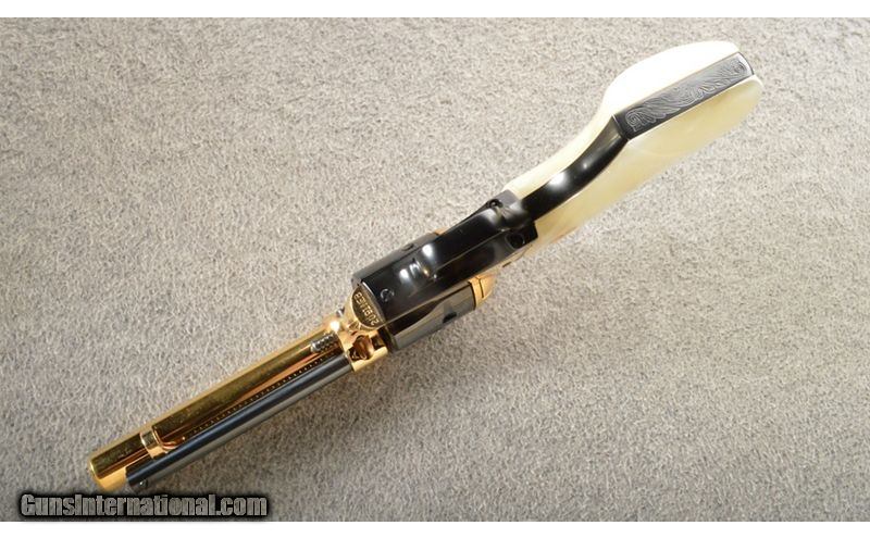 Description: The left of the barrel is marked "1867 — NEBRASKA CENTENNIAL — 1967". The top of the barrel is marked "COLT'S PT. FA. MFG. CO. HARTFORD CT. U.S.A.". The right of the barrel is marked "COLT SINGLE ACTION FRONTIER SCOUT 22 L.R.". The left of the frame is marked with a rampant colt in circle. The bottom of the frame, forward of the grip frame, is marked "5146NEB". The left of the trigger guard is marked "2". The butt of the grip frame has scroll engraving. The grips are two-piece Pearlite panels with gold colored Colt medallions. There are no chips or cracks. The grips are in about Excellent condition. Blue, Black & Gold Finish. The bore is bright, the rifling is sharp. The markings are clear. Overall, this revolver is in Excellent condition. This revolver comes in a blonde wood Colt presentation case with an outline of the state of Nebraska with a Nebraska Centennial medallion set in the center. The interior has gold satin on the lid and blue felt lined fitted tray for the revolver. The exterior of the case is in excellent condition. This is a limited edition Colt Frontier Scout revolver. .22 Long Rifle SOLD Chambers: 6 Shot Revolver. Metal Condition: New. Bore Condition: New. Barrels: 4 3/4" barrel. Triggers: "One, Single Action Gold Trigger. Weight: 2 lbs Sights: "Fixed Quarter-Round Front Sight, Rear Is a Square Notch In The Top strap Item Location: Owatonna, MN |