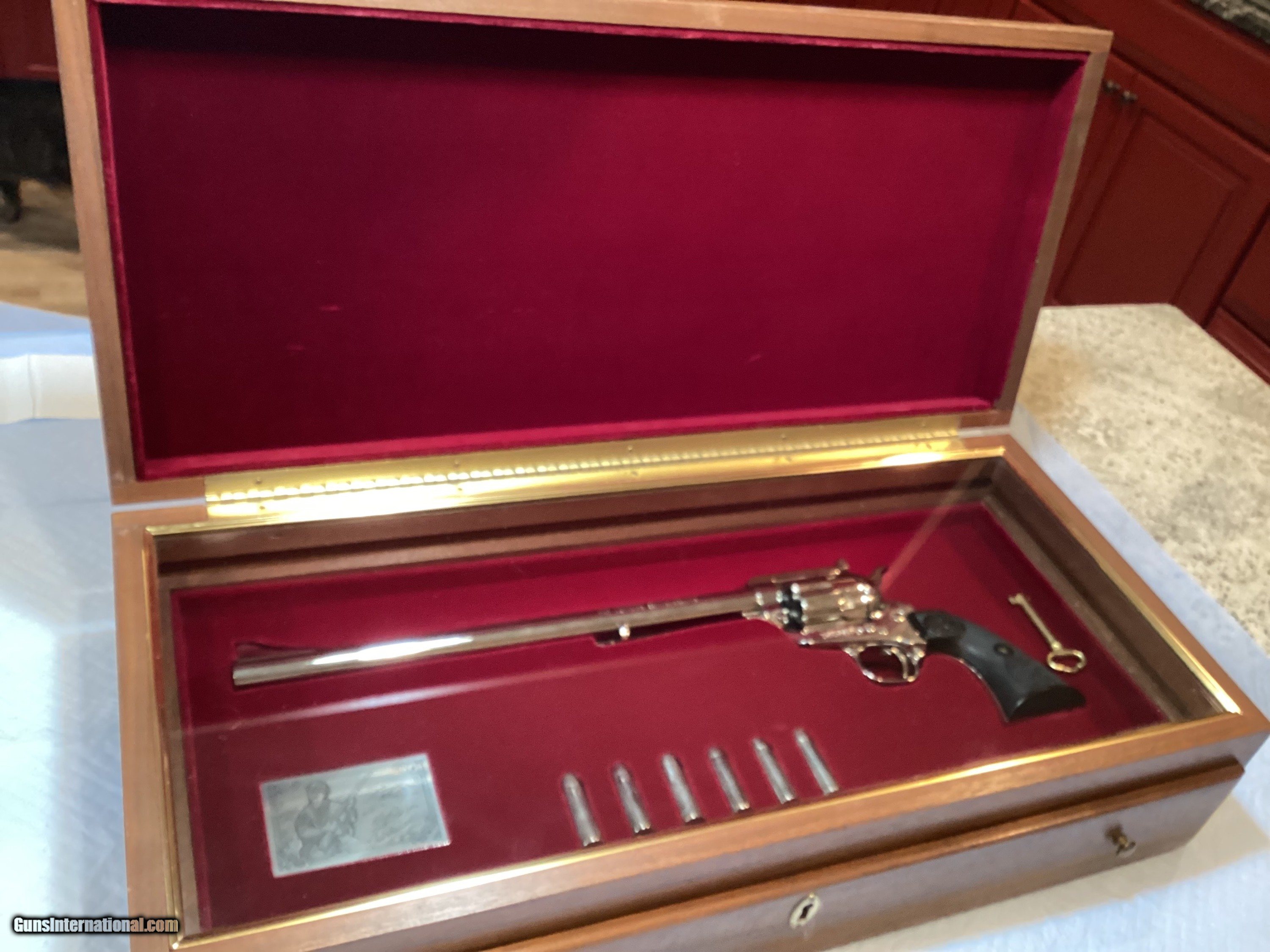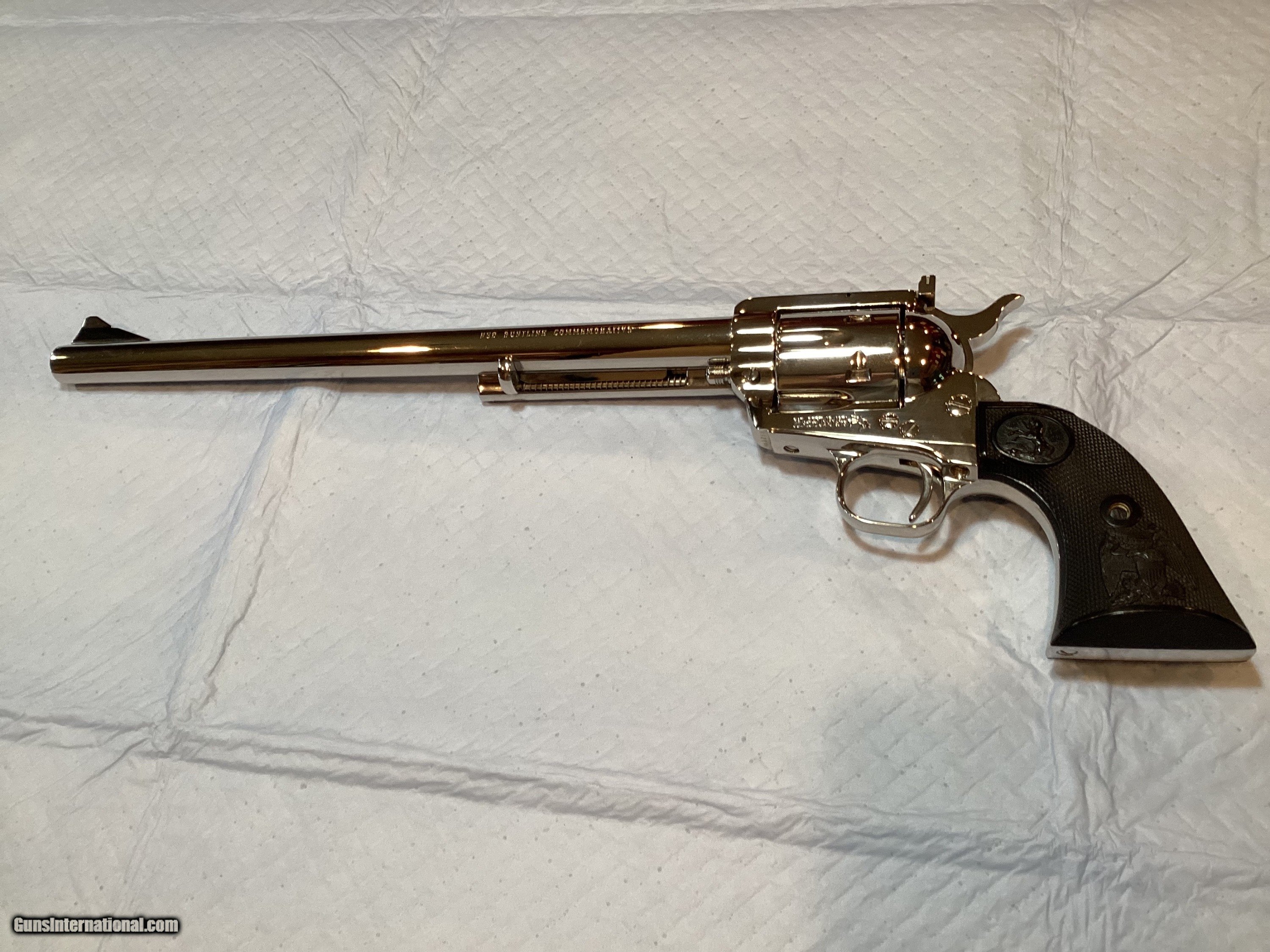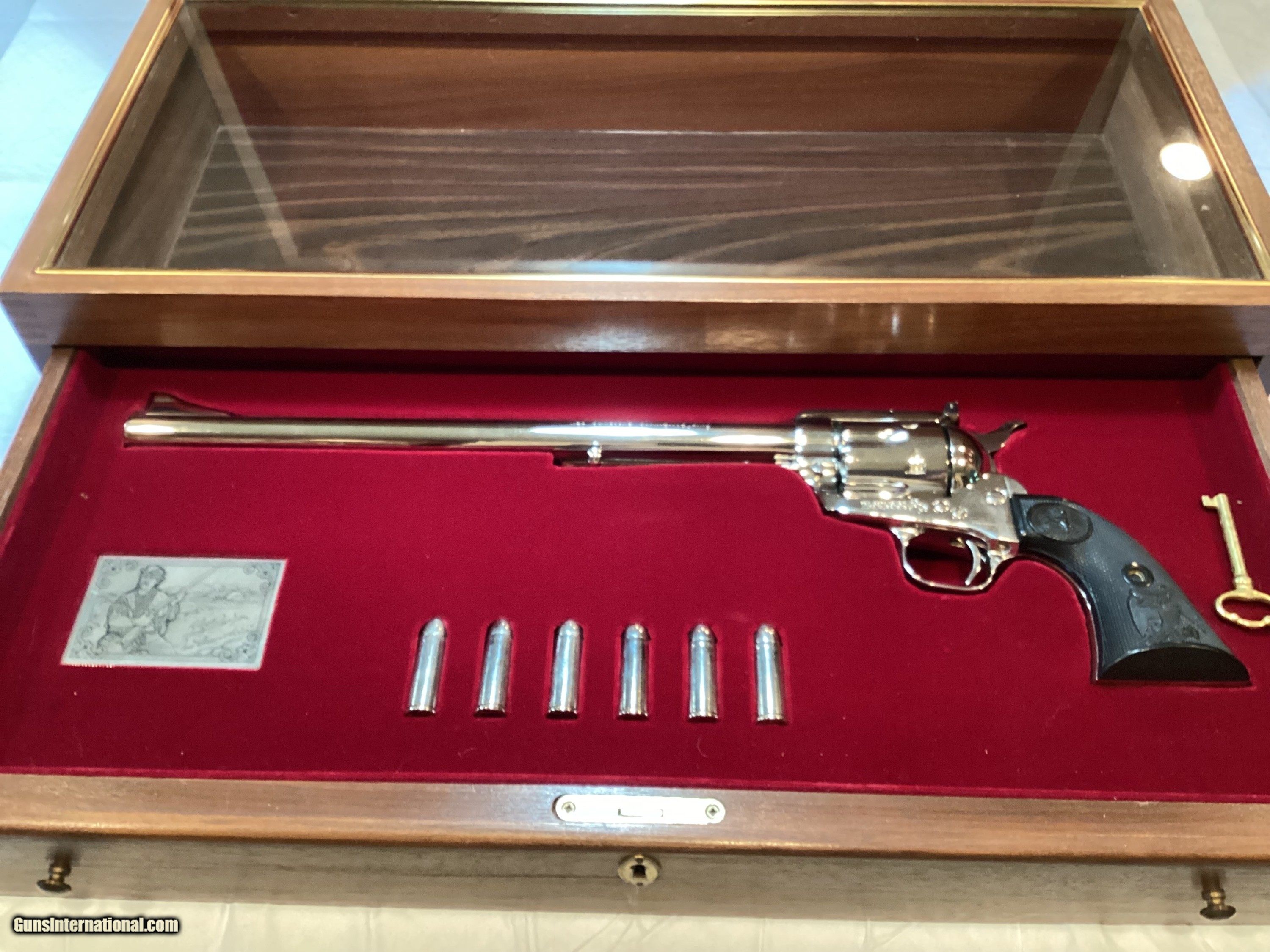 Description: 1 of 3000 with this firearm being #1739. What a beautiful 1979 Commemorative firearm in nickel plating with the popular Black Eagle grips. This stunner has 12" long barrel with adjustable rear sights. Shinning like a new nickel! This Colt comes in the original wooden presentation box (under glass) with a pull out drawer for further inspection. It is red felt line and locks with the case key. There is also a Ned Buntline presentation plaque along with six faux .45 Colt rounds. Will need to charge $60 shipping to lower 48 due to the large case and prep for both case and revolver. SOLD |