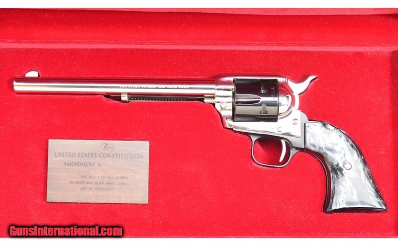 Description: For your consideration, a Colt Peacemaker Buntline chambered in .22 Long Rifle. This piece is a commemorative devoted to the Second Amendment to the Constitution. As such, the barrel bears the inscription, "The Right To Keep and Bear Arms." Included is a wooden, velvet-lined presentation case. This piece dates to 1977. .22 Long Rifle SOLD Chambers: 6 Metal Condition: Excellent Wood Condition: Excellent Bore Condition: Excellent Barrels: 7.5 Triggers: Smooth Face Weight: 2 lbs Sights: Iron Sights Item Location: Hamburg, PA |