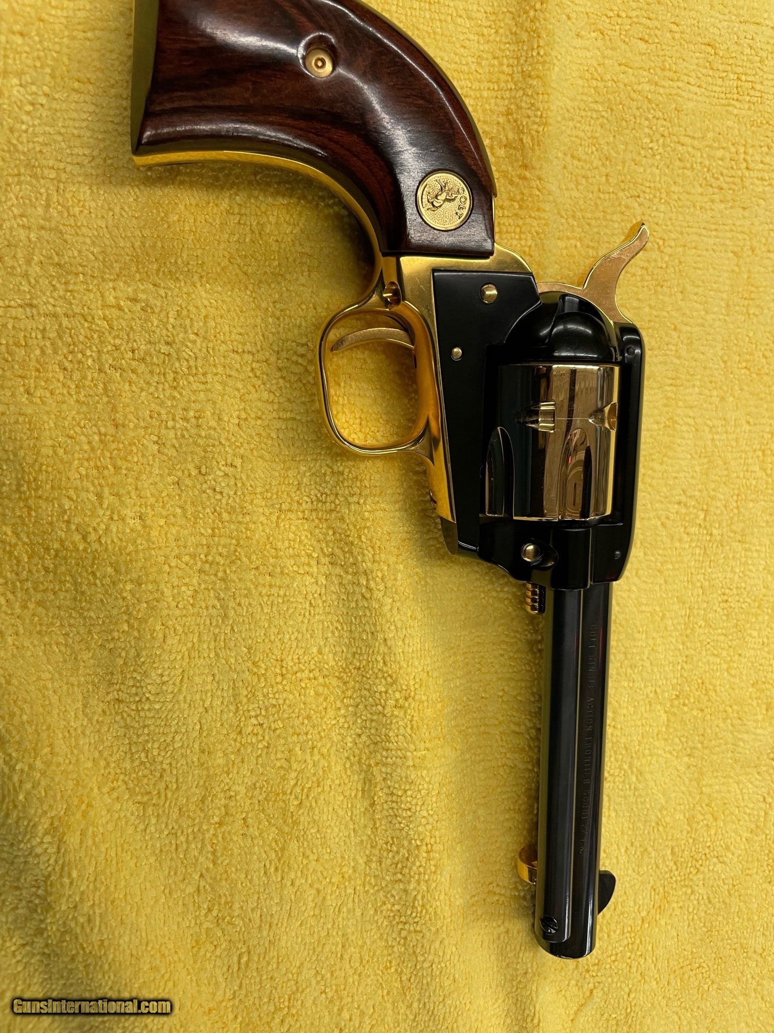 Description: Guns Listing ID: 415084 Manufactured 1965 for Oklahoma Diamond Jubilee. Six shot, single action Colt with black frame, barrel, and ejector. All other parts gold plated. Rosewood grips with gold medallion. Near new condition inside and out. Has never been fired . Original display case SOLD Manufacturer: COLT RIMFIRE Model: 1890 -oklahoma diamond jubilee-1965 Caliber Info: .22 CAL Condition: Used - Non-Certified Barrels: 5 BARREL Finish: BLACK AND GOLD |