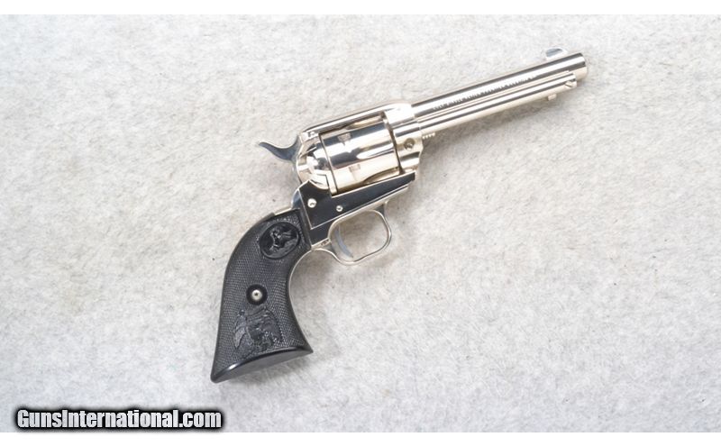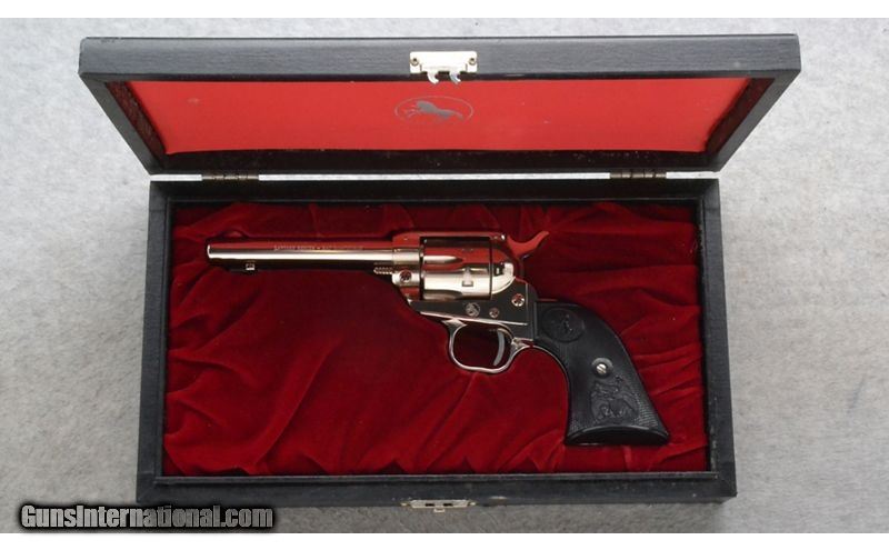 Description: This Colt Model Single Action Frontier Scout Lawman-Series Bat Masterson is a nickel plated 6 shot single action revolver in .22 Long Rifle Cal. It has a 4 5/8 inch barrel. A blade front sight and an integral notch rear sight. The grip is a checkered hard black plastic with an eagle with shield and the Colt horse logo. S/N 1346LM. Comes in a display case. .22 Long Rifle SOLD Chambers: 6 shot. Metal Condition: Excellent. Bore Condition: Excellent. Barrels: 4 5/8 inch nickel plated. Triggers: Single Action. Weight: 32 oz. Sights: Blade front. Integral notch rear. Item Location: Richfield, WI |