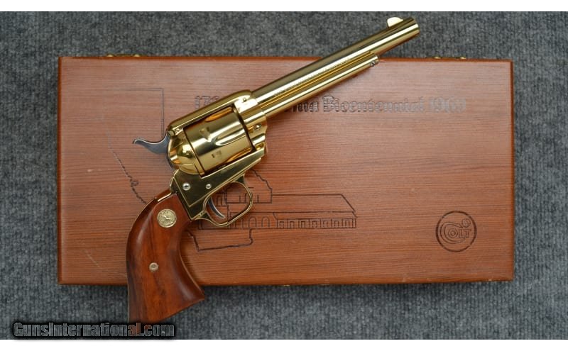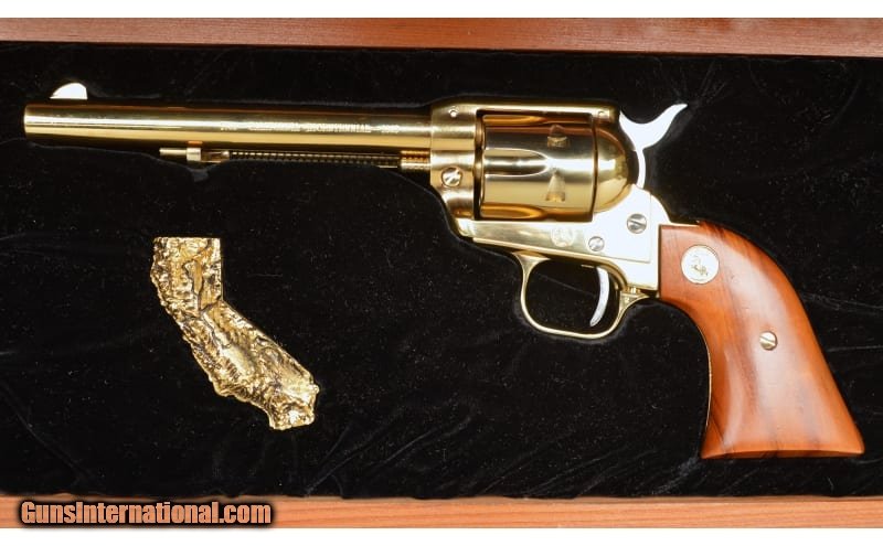 Description: For your consideration a Colt Single Action Frontier Scout chambered in .22 Long Rifle. This piece is a commemorative celebrating the 1969 Bicentennial of California. Besides contrasting nickeled small parts, the finish is a uniform gold plating. Of 5001 made, this is number 2588. The revolver is cased with a miniature representation of the topography of California. .22 Long Rifle SOLD Chambers: 6 Metal Condition: Excellent Wood Condition: Excellent Bore Condition: Excellent Barrels: 6 Triggers: Smooth Face Weight: 2 lbs Sights: Iron Sights Item Location: Hamburg, PA |
