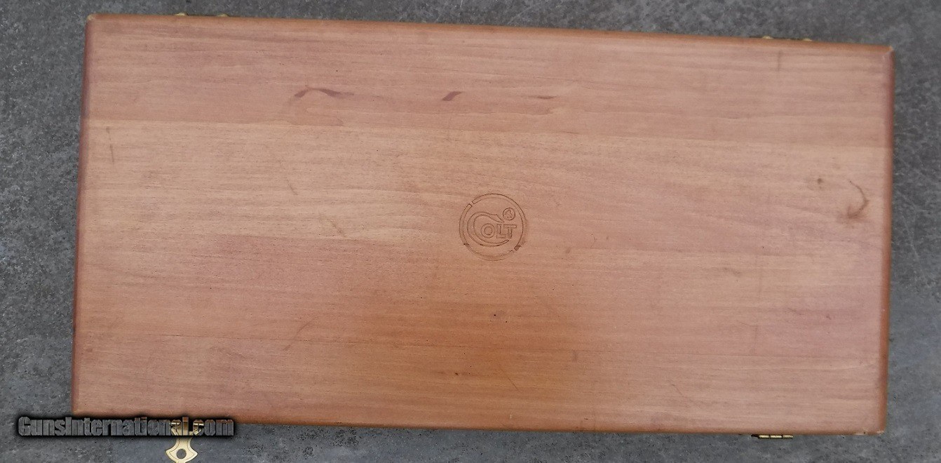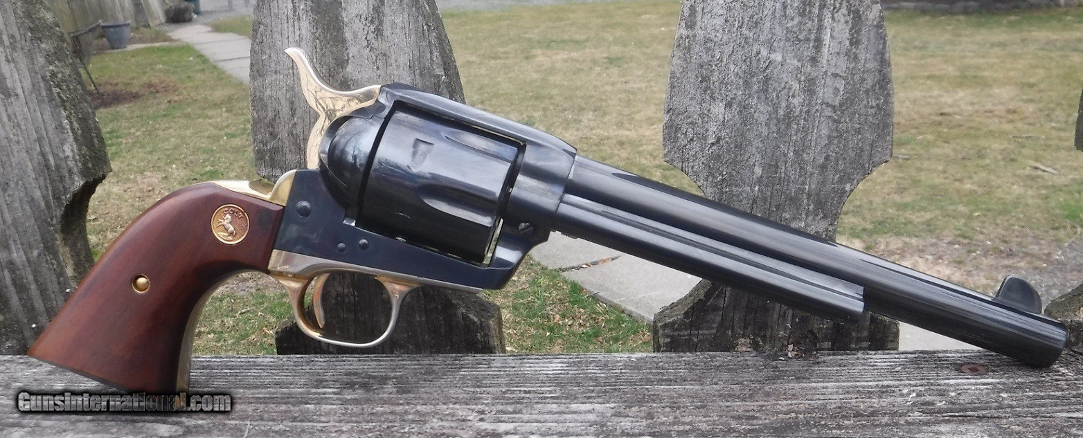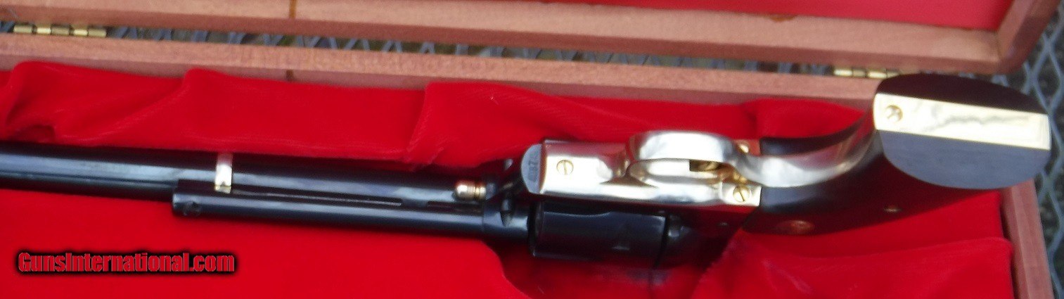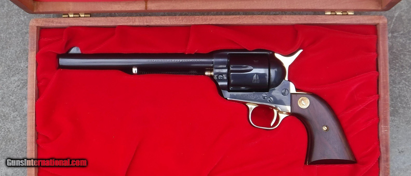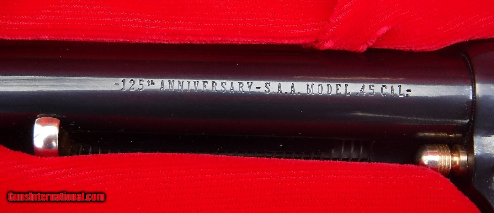 Description: COLT SAA - 3rd GENERATION - 125th ANNIVERSAY MODEL .45 CALIBER - BLUE WITH GOLD ACCENTS - WOOD GRIPS - 7 1/2" BARREL - COMES IN WOODEN PRESENTATION CASE - THIS GUN HAS BEEN FIRED - REMAINS IN 99.9% CONDITION SOLD |