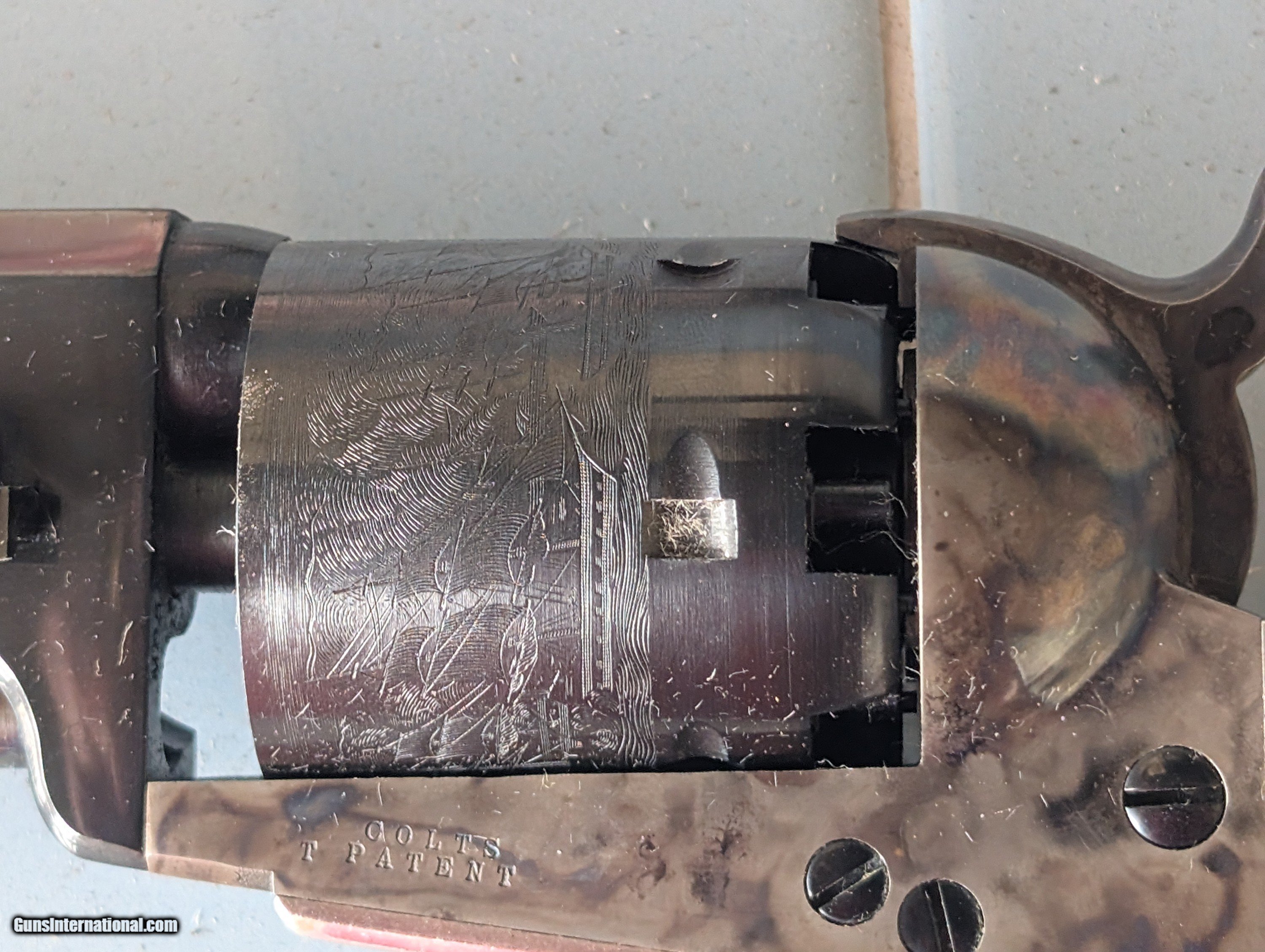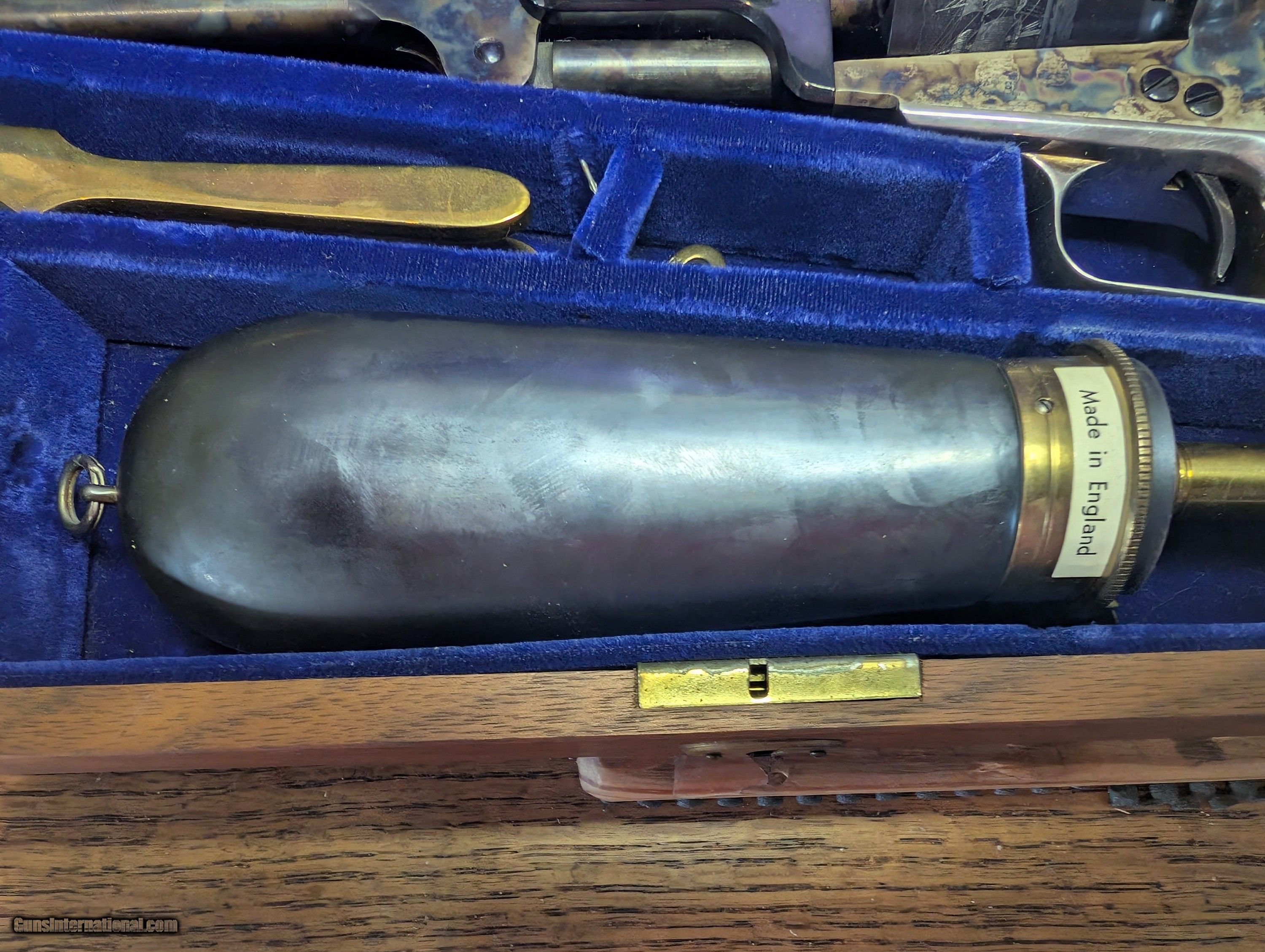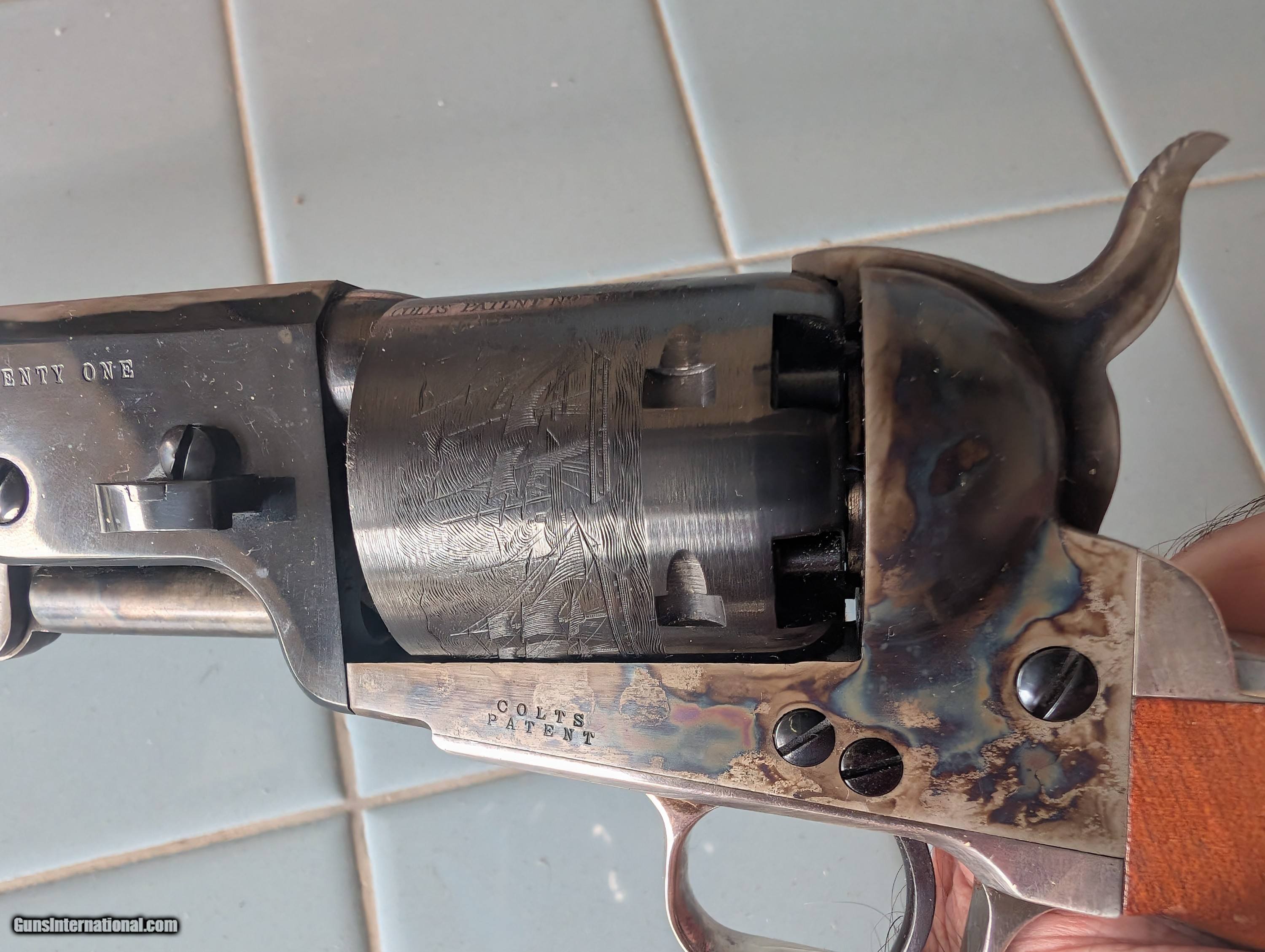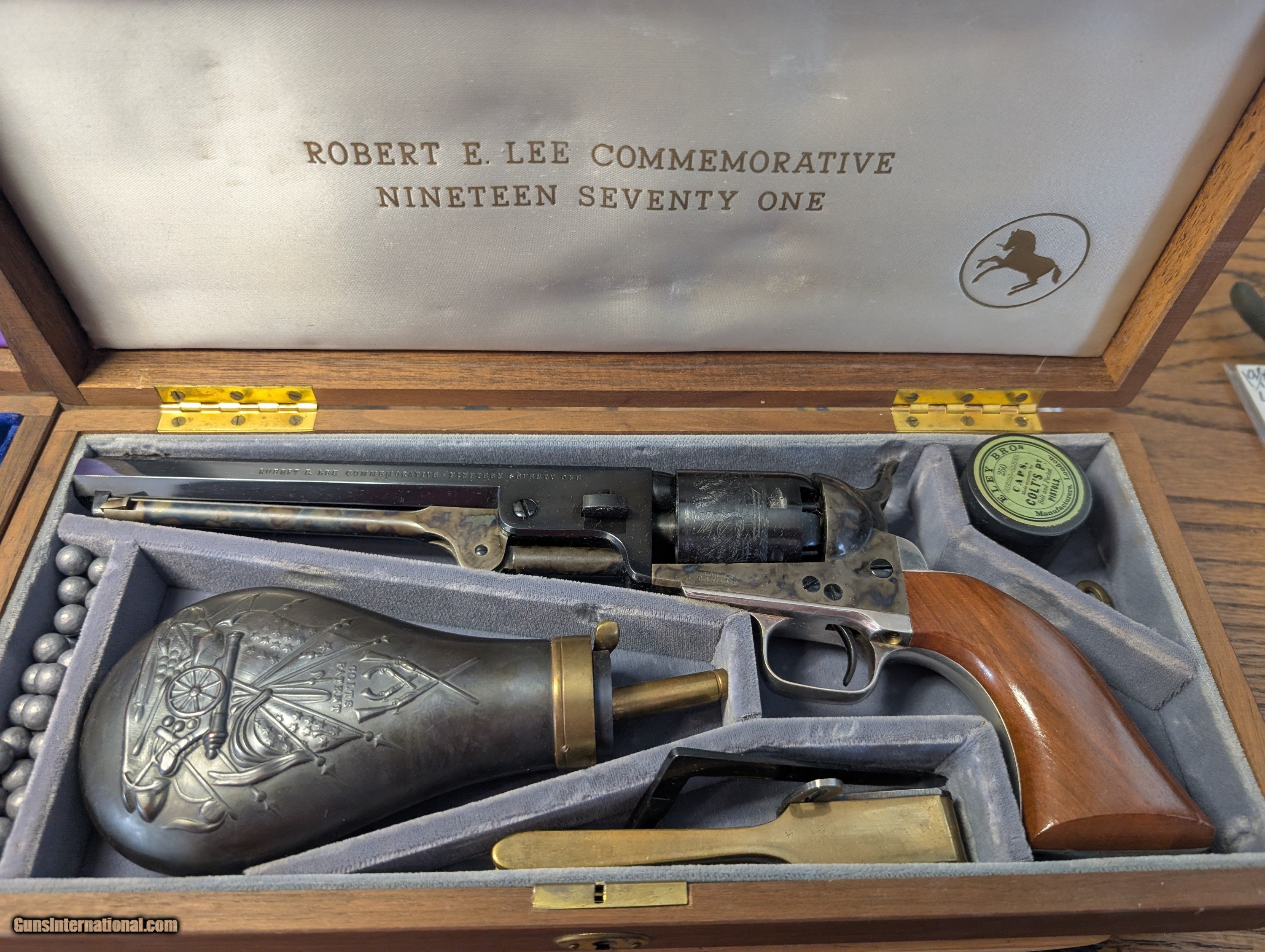 Description: !!!!!!REDUCED!!!!! Models C 9001 Robert E. Lee Commemorative and Model C 9002 Ulysses S. Grant Commemorative. MFG 1971 MATCHING SERIAL NUMBERS REL 3457 and USG 3457 Robert E Lee set includes a Colt Model 1851 Navy percussion revolvers with 36 cal. 7½" octagon barrel, hinged loading lever, six shot cylinder with roll engraved naval battle scene - "C" Series Royal Blue barrel, wedge, cylinder, trigger and screws - case hardened frame, loading lever and hammer - silver plated brass backstrap and round trigger guard - one piece varnished walnut grip. Includes English fit walnut presentation case with gray velvet lining, "stand of flags" powder flask, "L" shaped nipple wrench, two cavity brass bullet mold and cap tin. U.S. Grant set includes a Colt Model 1851 Navy percussion revolver with 36 cal. 7½" octagon barrel, hinged loading lever, six shot cylinder with roll engraved naval battle scene - "C" Series Royal Blue barrel, wedge, cylinder, trigger and screws - case hardened frame, loading lever and hammer - silver plated brass backstrap and square back trigger guard - one piece varnished walnut grip. Includes an English fit walnut presentation case with navy blue velvet lining, bag style powder flask, "L" shaped nipple wrench Spectacular color case hardening. No turn lines excellent unfired collectors condition Icludes a handful of 36 caliber round balls for each display $1995 Delivered CONUS. No FFL required. Must be over 21. I will need a copy of your ID Check local laws Personal check, cashapp, or zelle SOLD |