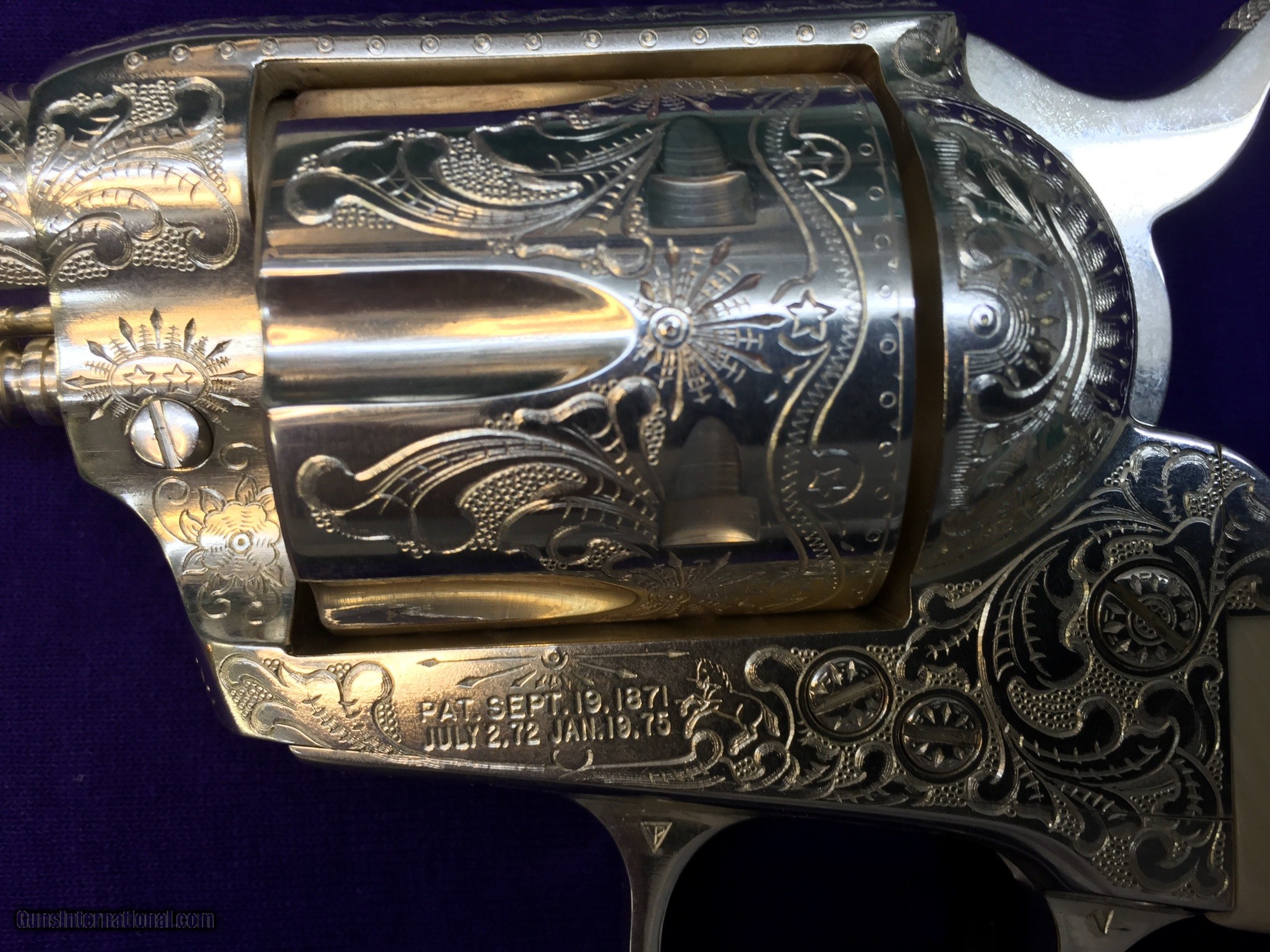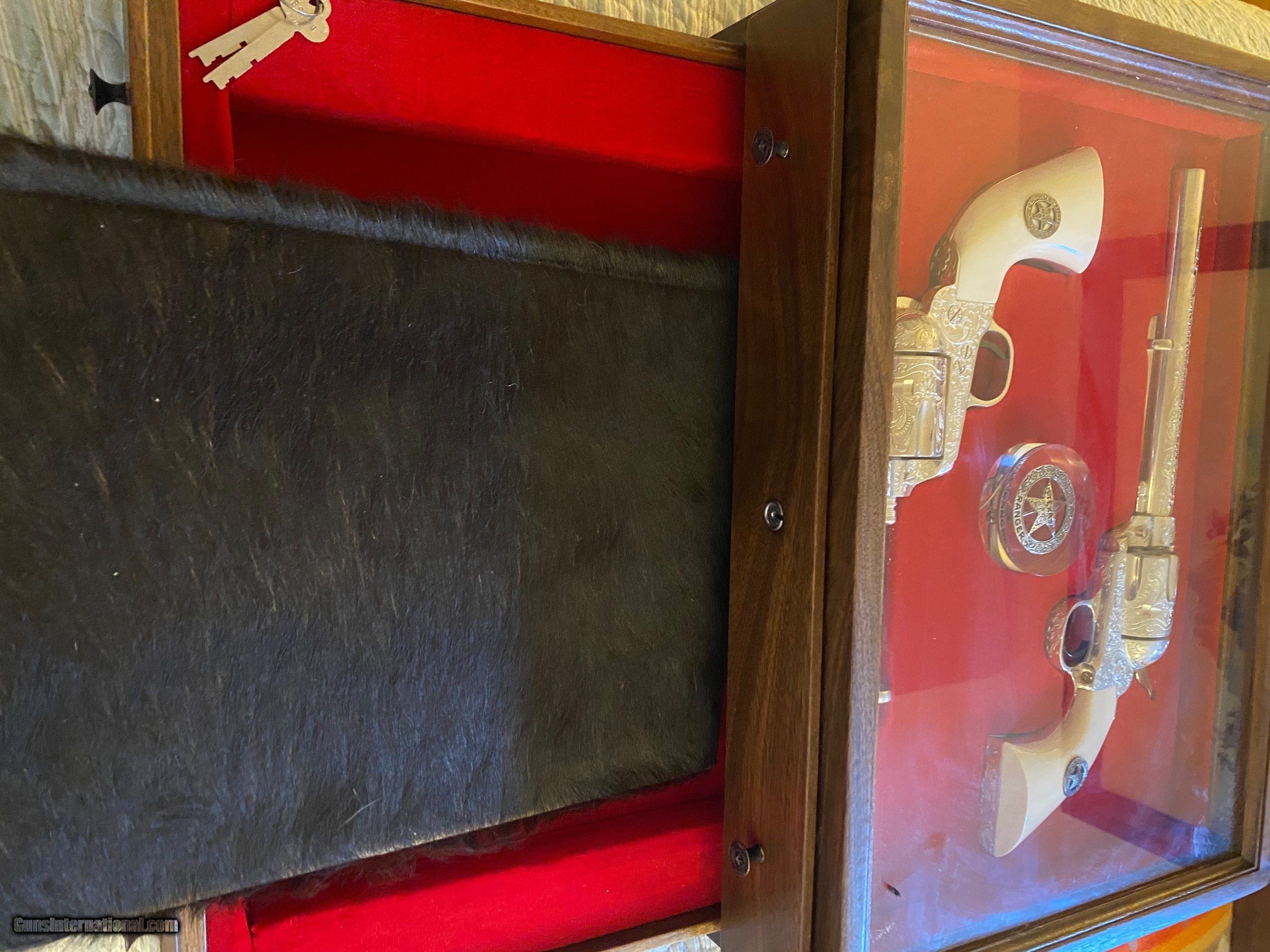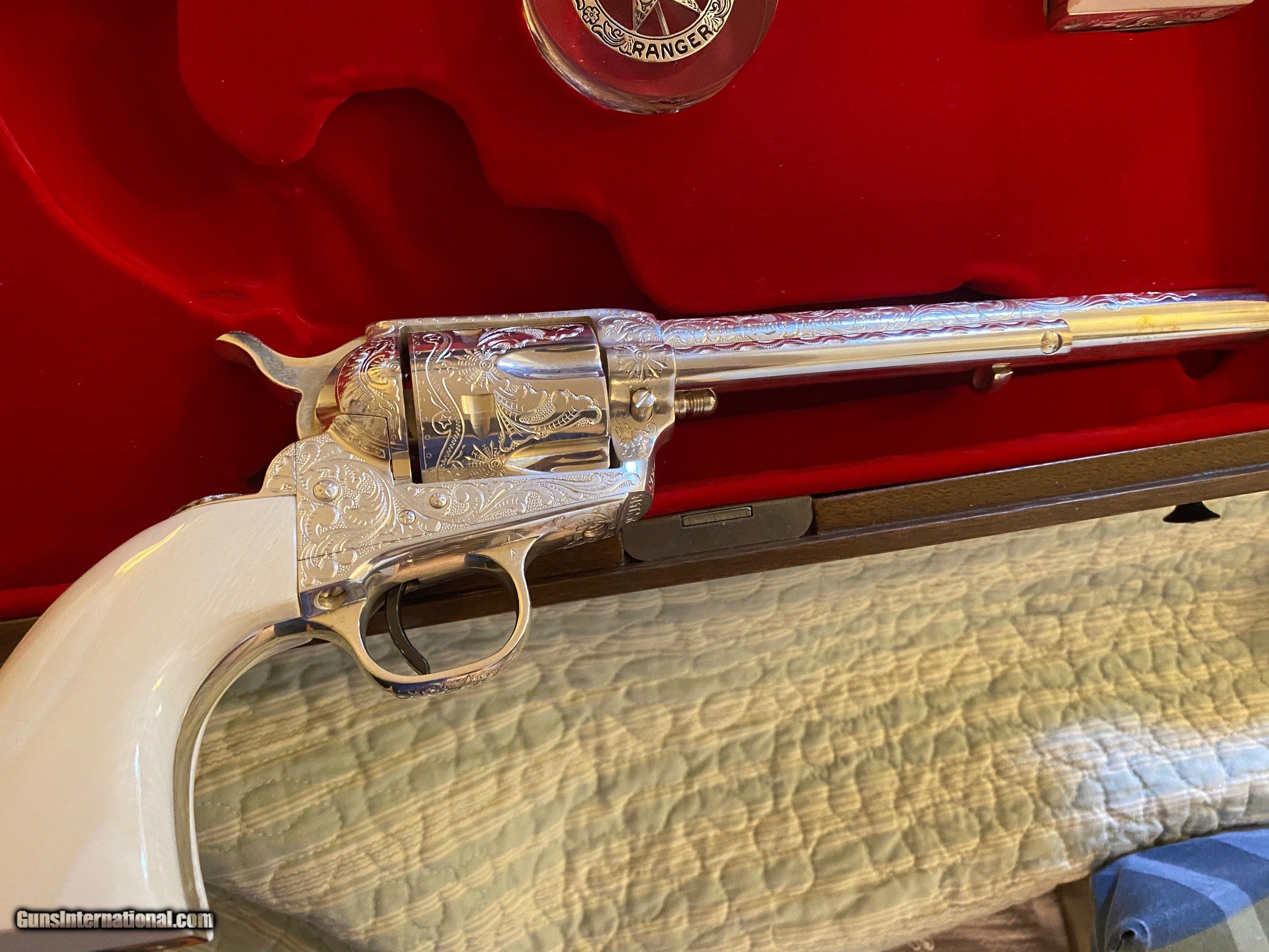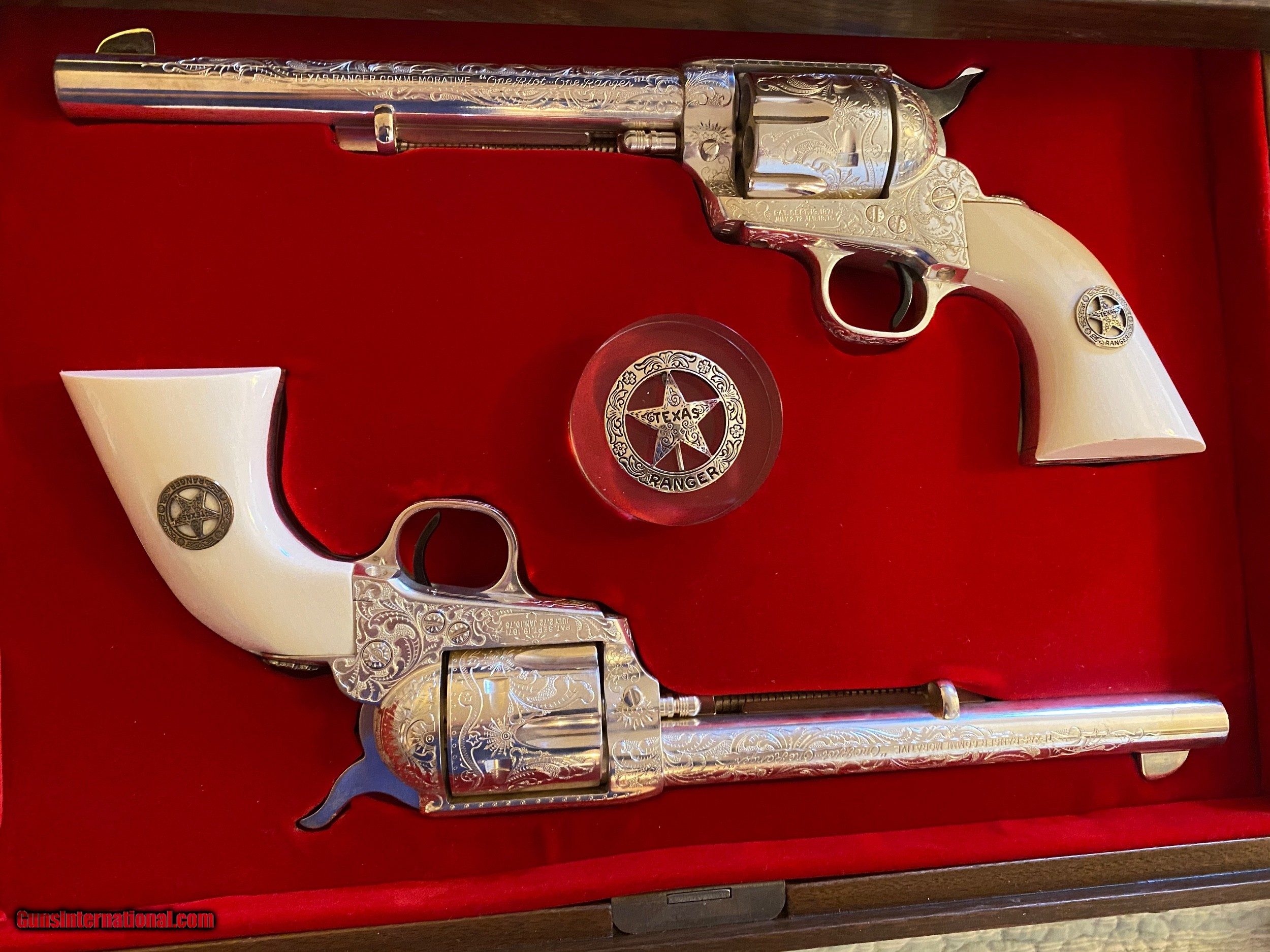 Description: Texas Ranger Deluxe Silver Conservative set (TR*544) (TR*545) Only 200 engraved revolvers, Only 800, sets in the Blue with same book and case as engraved sets, manufactured to commemorate the 150th anniversary of the Texas Rangers. Engraving and finishing was arranged by Texas Rangers Historical Arms, Inc. The revolver has attractive Southwestern style engraving, "TEXAS RANGER COMMEMORATIVE One Riot One Ranger" on the barrel, "TEXAS RANGERS" inscribed on the back strap, a silver star fitted behind the hammer, and a smooth grip with silver Ranger star inlay. The presentation case has silver Texas State Seal pulls and contains a Texas Ranger badge "made from a real five peso Mexican silver coin and set in lucite" and one Texas longhorn hide bound edition book of "The Pictorial History of the Texas Rangers" by Charles Schreiner III and others. The hides came from the famous YO Ranch. The patterns on the guns were based on Frank E. Hendricks in his shop in Texas Condition Excellent New condition. The case and book are also excellent with minor storage wear. Mechanically new excellent. 71/2 inch barrels, chambered .45lc There were other special ordered Texas Ranger guns ordered outside that 200, One was (TR *561) and this set, (TR*544 and TR*545) as well and one other I have seen, AS far as I can tell this is the only set of Consecutive Engraved Silver Plated guns Texas Ranger out there, I have looked and talked to people involved in the project, they know of no others. This is one of the most Beautiful sets you will see, The single gun with book and case sells for $12,000.00, these and being consecutive will sell for $20,000.00. In a day of laser engraving, hand engraved guns are a lost art. You can see the fine attention to detail done to these two guns Guns were Engraved by one time Colt Master Engraver Jere Davidson, it is rare to find a set Jere Davidson has done, Jere Davidson is a true old time artist, takes a chisel and produces art as of these guns, Ken 480-380-7875 SOLD Handgun Caliber: .45 Colt Manufacturer: Colt Deluxe Consecutive Commemorative Model: Colt Single Action Army Serial Number: TR*544, TR*545 Chambers: .45lc Condition: New old stock Metal Condition: Silver Plated Bore Condition: New Manufacture Date: 1970 Engraving: Engraved Silver Plated Case: Walnut Case with Glass top and a Drawer containing Longhorn Cow Bound Book Item Location: Florence, Arizona |
