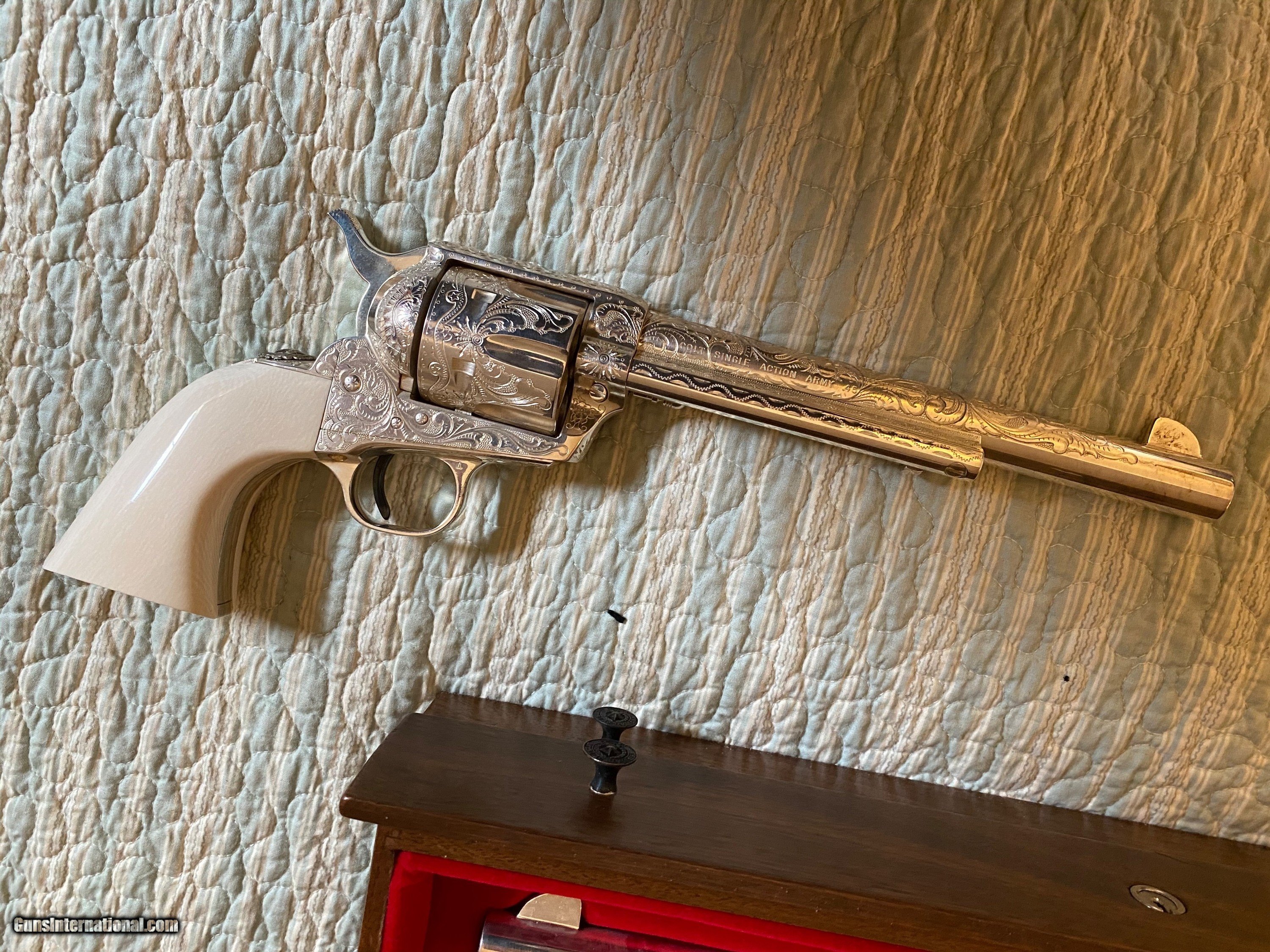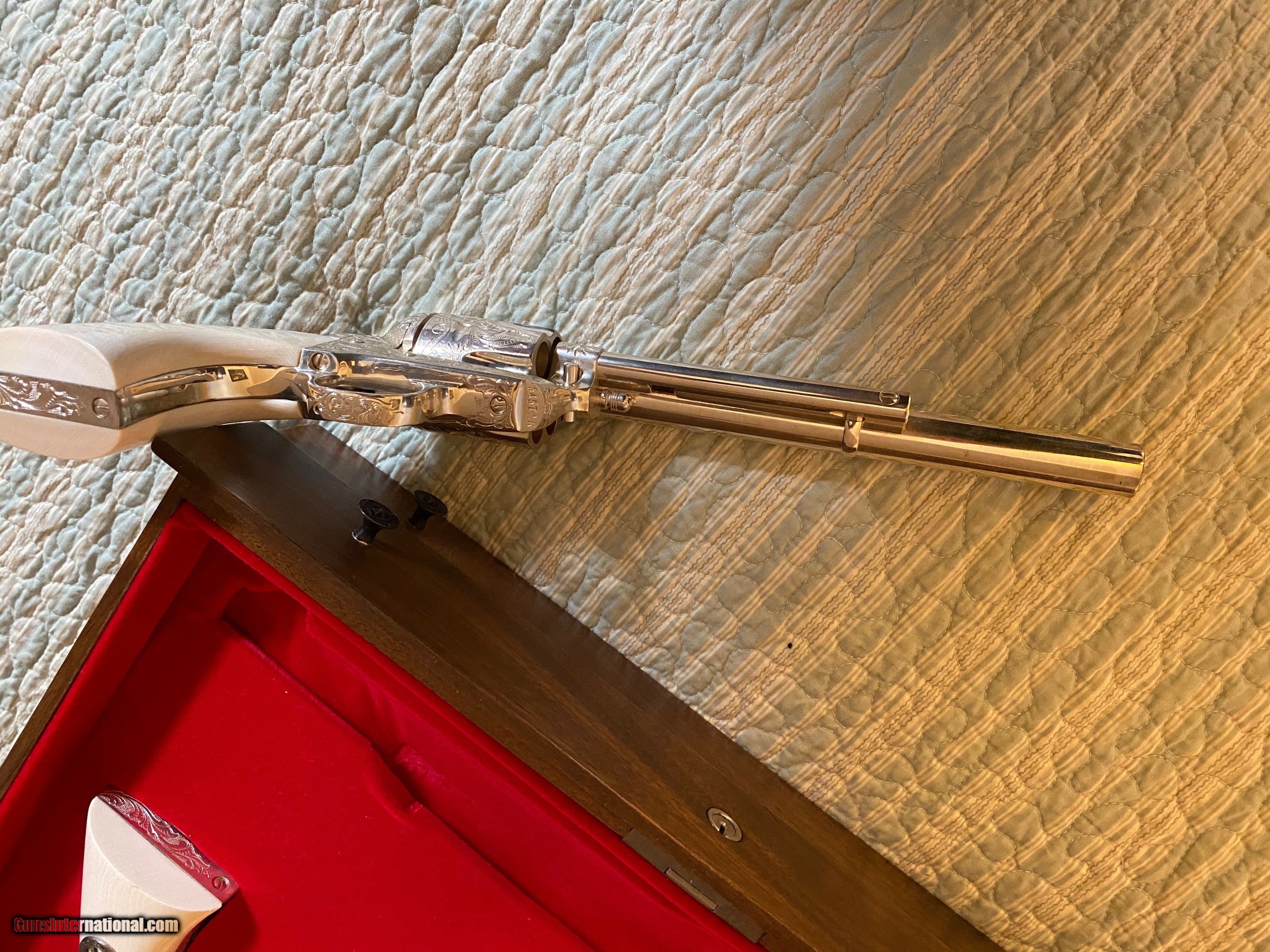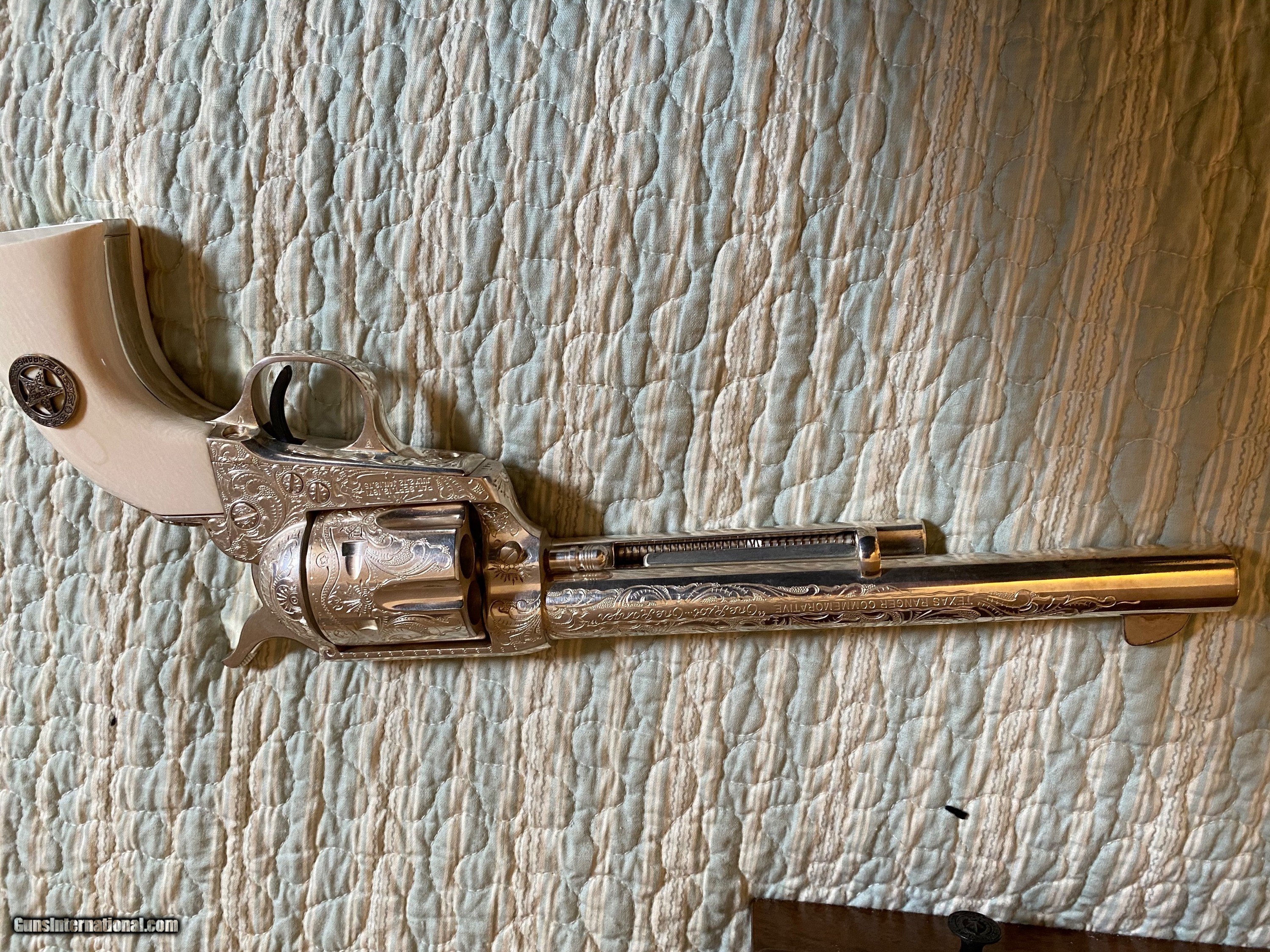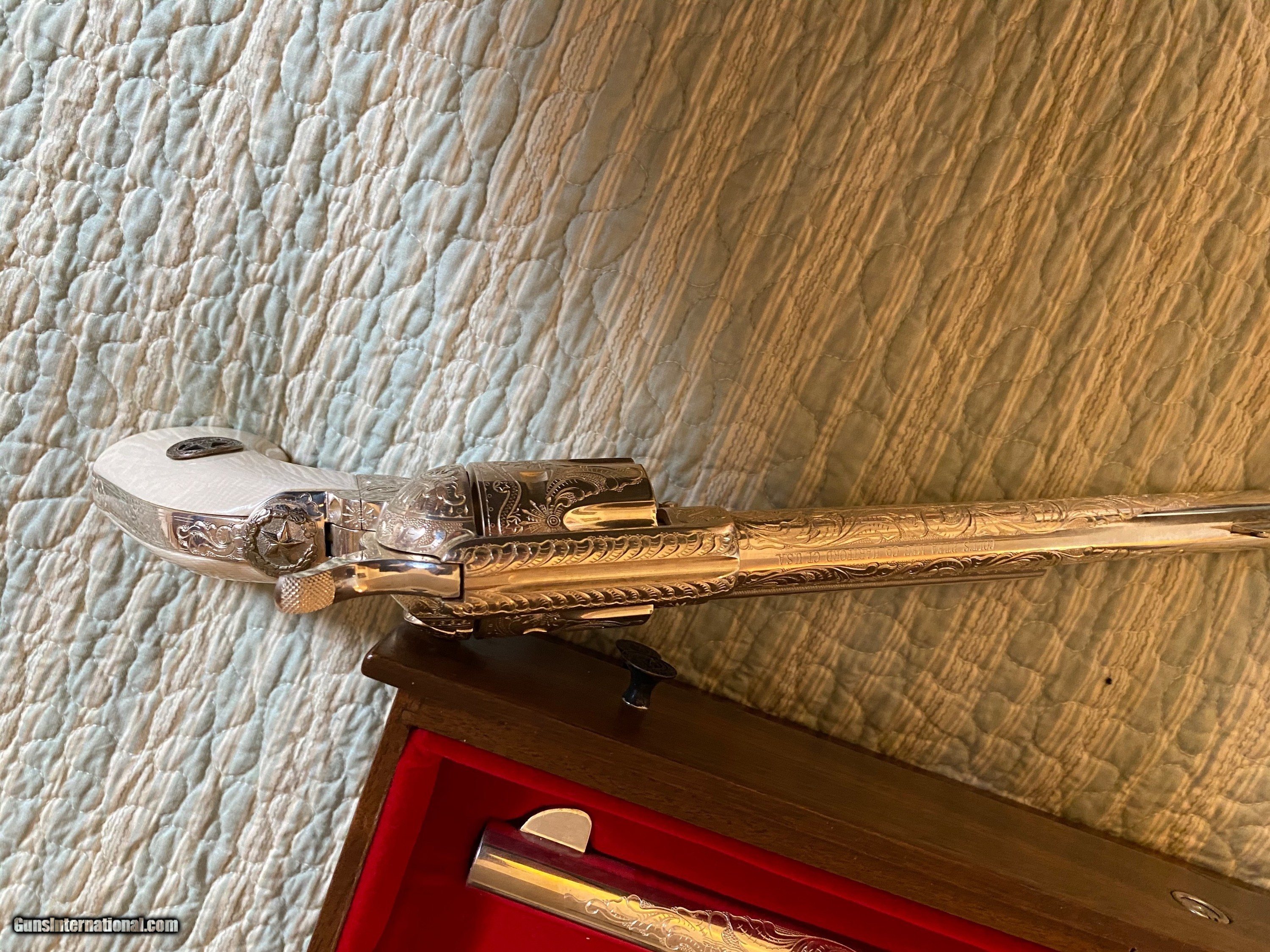 Description: Texas Ranger Deluxe Silver Conservative set (TR*544) (TR*545) Only 200 engraved revolvers, Only 800, sets in the Blue with same book and case as engraved sets, manufactured to commemorate the 150th anniversary of the Texas Rangers. Engraving and finishing was arranged by Texas Rangers Historical Arms, Inc. The revolver has attractive Southwestern style engraving, "TEXAS RANGER COMMEMORATIVE One Riot One Ranger" on the barrel, "TEXAS RANGERS" inscribed on the back strap, a silver star fitted behind the hammer, and a smooth grip with silver Ranger star inlay. The presentation case has silver Texas State Seal pulls and contains a Texas Ranger badge "made from a real five peso Mexican silver coin and set in lucite" and one Texas longhorn hide bound edition book of "The Pictorial History of the Texas Rangers" by Charles Schreiner III and others. The hides came from the famous YO Ranch. The patterns on the guns were based on Frank E. Hendricks in his shop in Texas Condition Excellent New condition. The case and book are also excellent with minor storage wear. Mechanically new excellent. 71/2 inch barrels, chambered .45lc There were other special ordered Texas Ranger guns ordered outside that 200, One was (TR *561) and this set, (TR*544 and TR*545) as well and one other I have seen, AS far as I can tell this is the only set of Consecutive Engraved Silver Plated guns Texas Ranger out there, I have looked and talked to people involved in the project, they know of no others. This is one of the most Beautiful sets you will see, The single gun with book and case sells for $12,000.00, these and being consecutive will sell for $20,000.00. In a day of laser engraving, hand engraved guns are a lost art. You can see the fine attention to detail done to these two guns Guns were Engraved by one time Colt Master Engraver Jere Davidson, it is rare to find a set Jere Davidson has done, Jere Davidson is a true old time artist, takes a chisel and produces art as of these guns, Ken 480-380-7875 SOLD Handgun Caliber: .45 Colt Manufacturer: Colt Deluxe Consecutive Commemorative Model: Colt Single Action Army Serial Number: TR*544, TR*545 Chambers: .45lc Condition: New old stock Metal Condition: Silver Plated Bore Condition: New Manufacture Date: 1970 Engraving: Engraved Silver Plated Case: Walnut Case with Glass top and a Drawer containing Longhorn Cow Bound Book Item Location: Florence, Arizona |