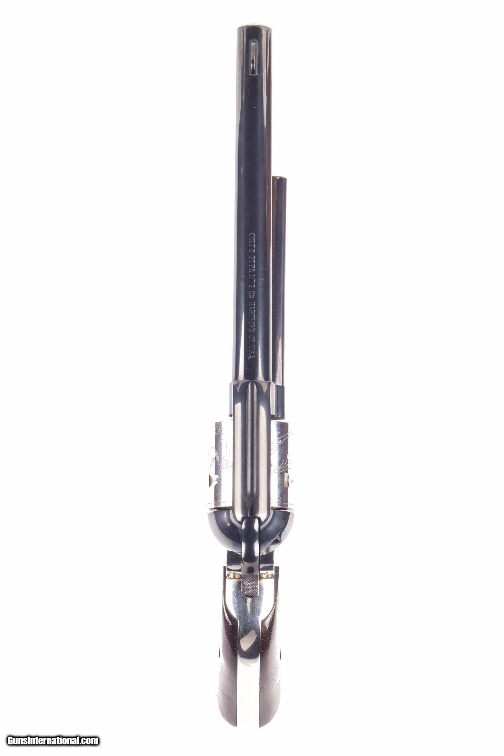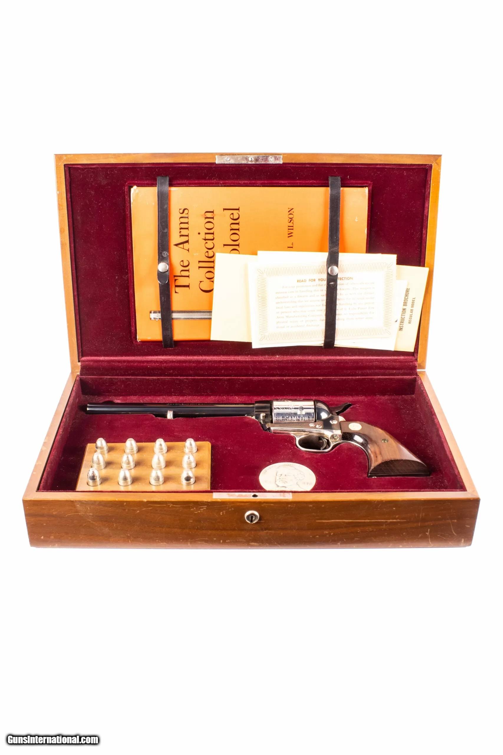 Description: Colt SAA Colonel Sam Colt Sesquicentennial Commemorative edition chambered in 45 Long Colt with a 7½ inch barrel, pristine mirror-shine bore with immaculate rifling. This revolver is 1 of 5,000 produced in order to honor the 150th birthday of one of the greatest contributors to firearms history and the American spirit alike, Colonel Samuel Colt. Included with this revolver is the original wooden presentation case which also comes with "The Arms Collection of Colt" written by R. L. Wilson, a commemorative coin showing the late Sam Colt, 12 dummy cartridges, and a letter of confidence in purchase from the late Paul A. Benke, then President of Colt firearms. The NRA grading condition for this USED firearm is Excellent. We ship domestically in the United States. Additional shipping rates apply to Alaska and Hawaii. Dury's Lifetime Warranty: All firearms purchased from Dury’s Gun Shop, NEW or USED, are covered by a lifetime warranty. We will repair or replace, at our discretion, any firearm purchased from Dury’s Gun Shop, Inc. for as long as it is owned by the purchaser. This warranty is not transferable. WE BUY GUNS! NO COLLECTION TOO BIG OR SMALL FOR OUR GUNS INTERNATIONAL CUSTOMERS ALL OF OUR FIREARMS CAN BE PURCHASED DIRECTLY FROM OUR DURY'S GUNS SITE ! SOLD Manufacturer: Colt Model: Single Action Army Caliber Info: 45 LC Barrels: 7inches |