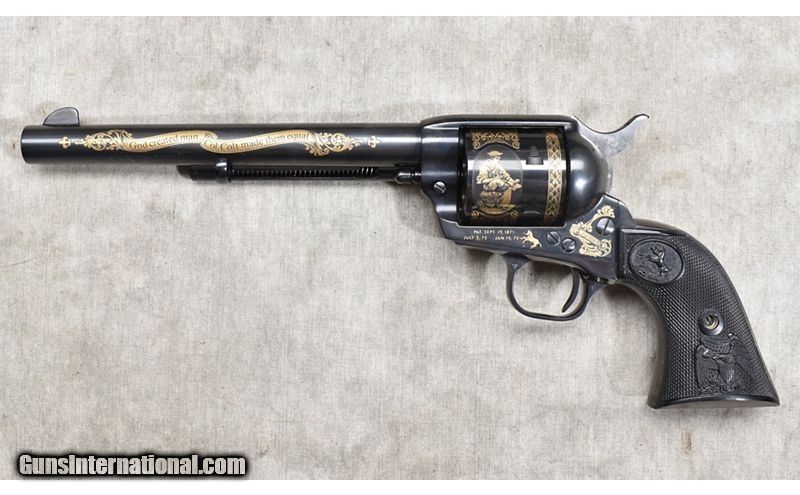 Description: Very nice Colt Custom Shop Single Action Army that commemorates Sam Colt's most famous pistol design. This features many engravings in remembrance of his life and career. .44-40 Winchester SOLD Chambers: 6 Metal Condition: Excellent. Wood Condition: Excellent. Bore Condition: Shiny and bright. Barrels: 7-1/2 inch Triggers: Factory Single Action only. Butt Pad: Black synthetic with Colt and eagle logos. Weight: 41 oumces Sights: Post and top strap notch. Item Location: Rogers |