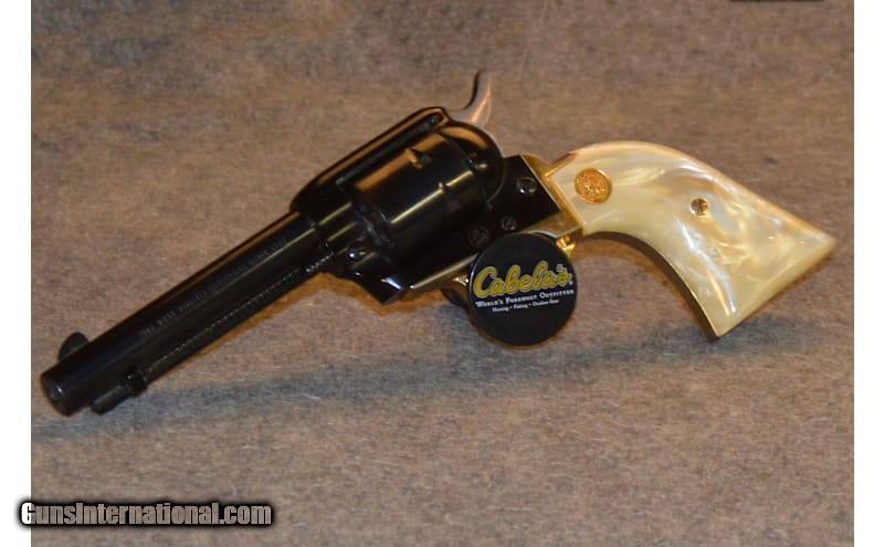 This Single Action Frontier Scout has the wooden display box as it is the 1863 to 1963 West Virginia Centennial Commemorative revolver. There appears to be no turn ring on the cylinder, nor any wear in the bluing. .22 Long Rifle