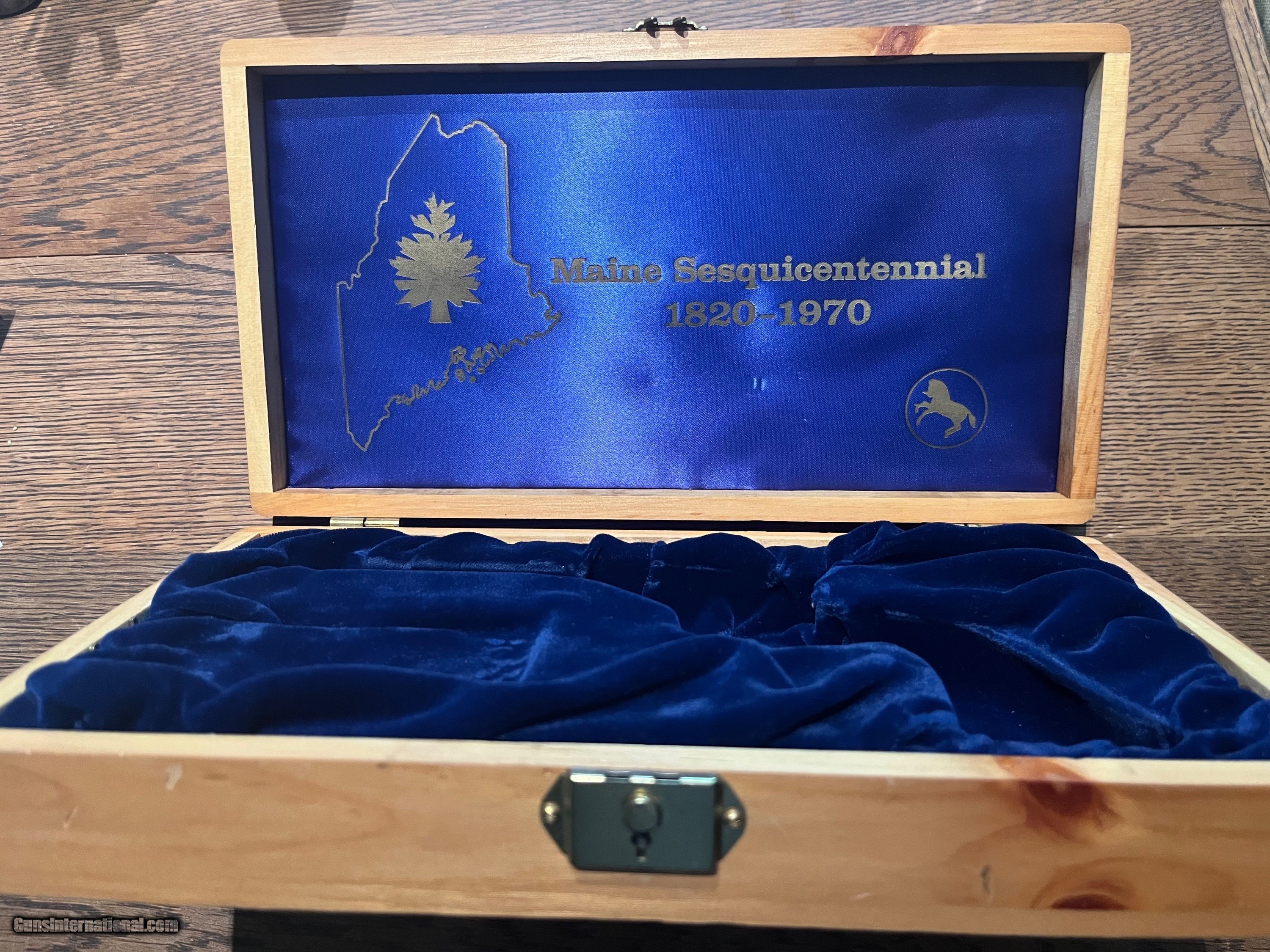 Description: PRICE REDUCED! Maine Sesquicentennial 1820-1970 with Gold Frame, Silver Grip & Cylinder. New in Presentation Case with Gold Maine Lobster. All in Beautiful Condition. 4 3/4" Barrel. Price includes shipping to lower 48 States. SOLD Curio/Relic: Yes Handgun Caliber: .22 Long Rifle Manufacturer: Colt Model: Frontier Scout Serial Number: 2132MES Barrel Length: 4 3/4 Condition: Excellent Metal Condition: Excellent Bore Condition: Excellent |