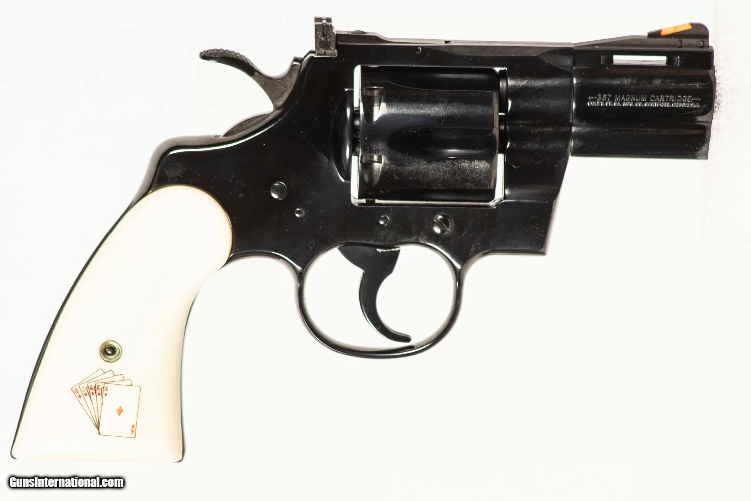 Description: Colt Snake Eyes Python revolvers, set number 003 of 500, with 2 1/2 inch vent rib barrels, bright bores, original factory boxes, Snake Eyes double gun display case, and decks of playing cards. Listed is set number 003 of the 500 made by Colt. The NRA grading condition for these USED firearms is Excellent-near Perfect/like-new-in-box. Dury's inventory #269053 and 269054 Dury's Lifetime Warranty: All firearms purchased from Dury’s Gun Shop, NEW or USED, are covered by a lifetime warranty. We will repair or replace, at our discretion, any firearm purchased from Dury’s Gun Shop, Inc. for as long as it is owned by the purchaser. This warranty is not transferable. WE BUY GUNS! NO COLLECTION TOO BIG OR SMALL FOR OUR GUNS INTERNATIONAL CUSTOMERS ALL OF OUR FIREARMS CAN BE PURCHASED DIRECTLY FROM OUR DURY'S GUNS SITE ! SOLD Handgun Caliber: .357 Magnum Manufacturer: Colt Model: Python Caliber Info: 357 MAG Barrels: 2inches |