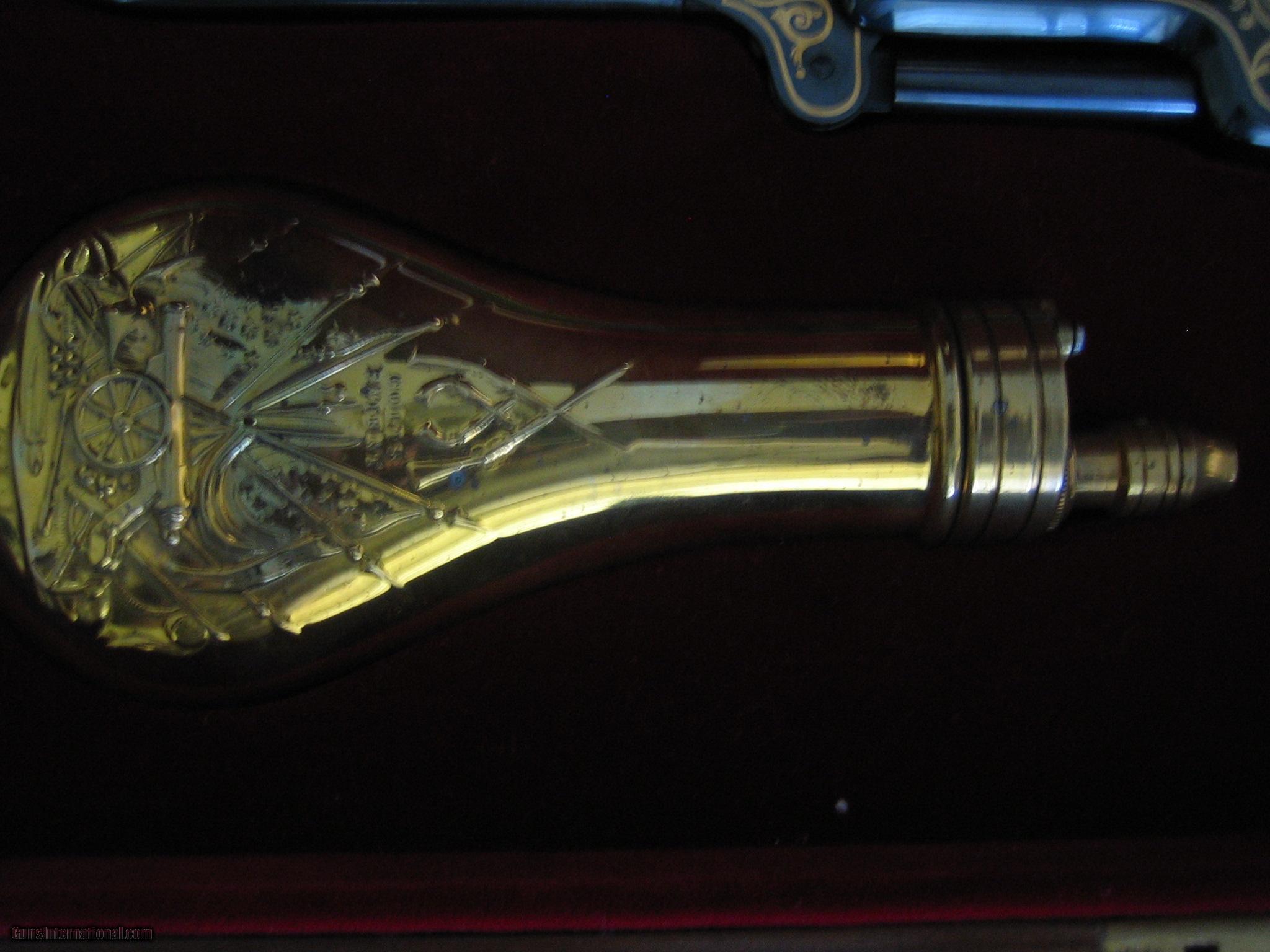 Description: Here's a super nice black powder commemorative revolver! Sold by the United States Historical Society in the 1980s, this is the "SAM HOUSTON PISTOL / TEXAS SESQUICENTENNIAL". It is an exact, firing replica of the famous Colt Model 1847 Walker revolver. The Walker revolver was the largest and most powerful repeating black powder handgun ever made. The Walker was named after Captain Samuel Walker, a renowned national hero who fought (and died) in the Texas-Mexico war and who was instrumental in the development of this revolver for use by the early Texas Rangers. This commemorative is dedicated to Sam Houston, the first President of the Texas Republic. Houston was the key figure guiding the destiny of Texas and securing freedom from Mexico. A very large handgun, the Walker tips the scales at nearly five pounds. It fires a .44 caliber bullet and has a 9-inch barrel. The revolver is finished in highly polished blue with lots of 24-karat gold decoration. The cylinder depicts the famous Alamo, has a portrait of Sam Houston, and also a vignette of Houston at the Battle of San Jacinto where his small army defeated Mexico's Santa Anna and secured Texas' independence. Scroll that includes the Texas flag, Texas lone star symbol and other designs adorn the balance of the gun. The smooth walnut grips feature a medallion bearing the likeness of Sam Houston. Condition is excellent, as new, and the revolver remains unfired. There are only a couple of the smallest handling marks (difficult to find/see) and there is no rust, pitting or problems with the pistol. There is some gold loss on the powder flask and the bullet mold. The gun is gorgeous! It comes in the specially designed solid walnut case with embossed leather top. The crimson velvet interior of the case is specially fitted for the revolver as well as a powder flask, bullet mold, nipple wrench, and cap tin that is stamped with the outline of Texas. The case is lockable (one key included) and has storage compartments for bullets, etc. Also included are the white cotton gloves. Original issue price of this revolver was $2300.00 in the early 1980's. Shipping to your door via UPS will be $55.00 SOLD |