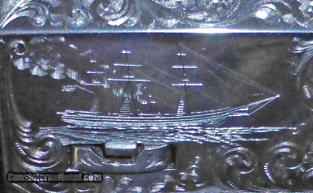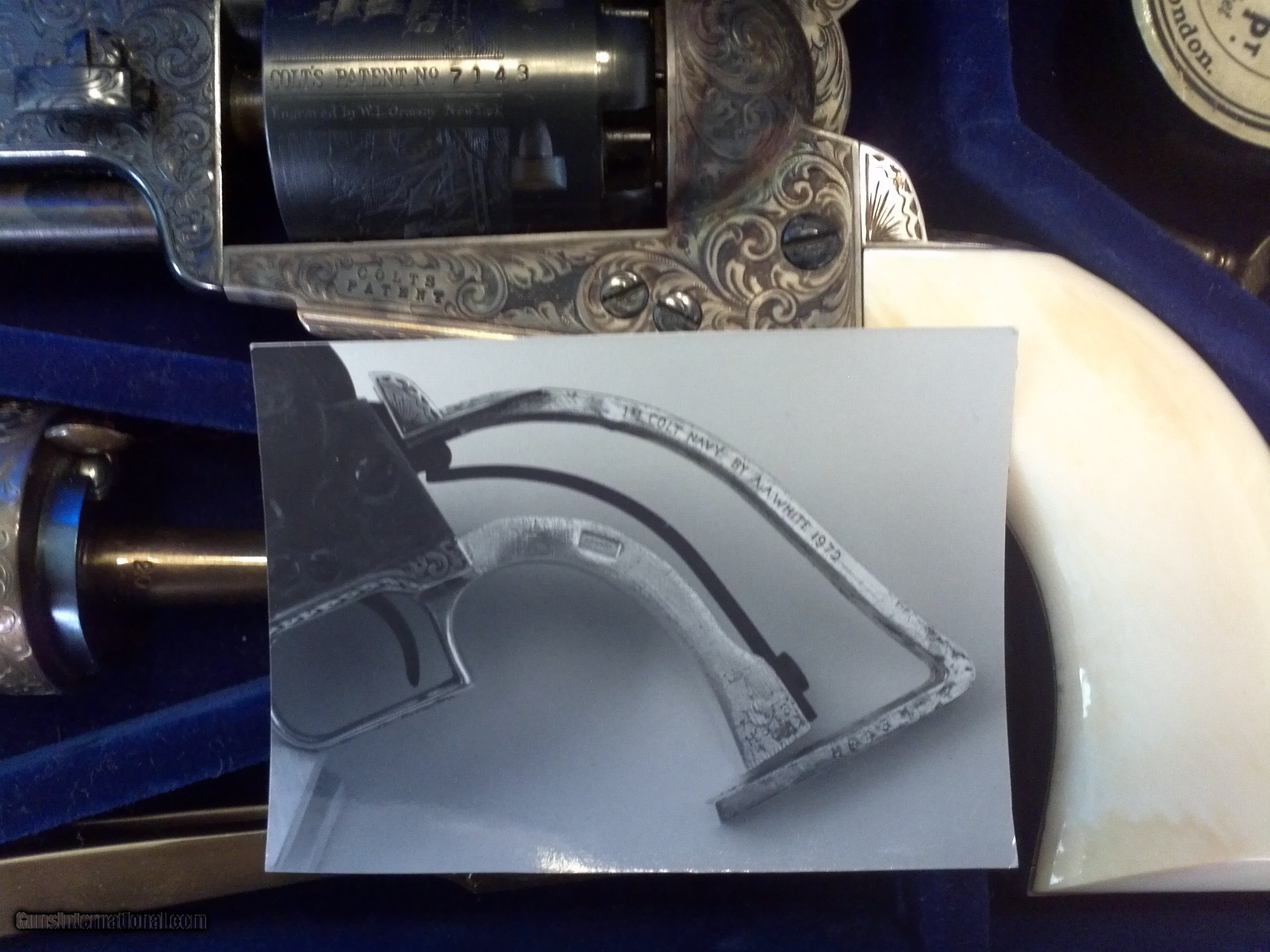 This masterpiece is a very rare, one of a kind, and is the 1st 1851 Navy engraved by Alvin White as so inscribed under the left grip “1st COLTNAVY BY A. A. WHITE 1972”
