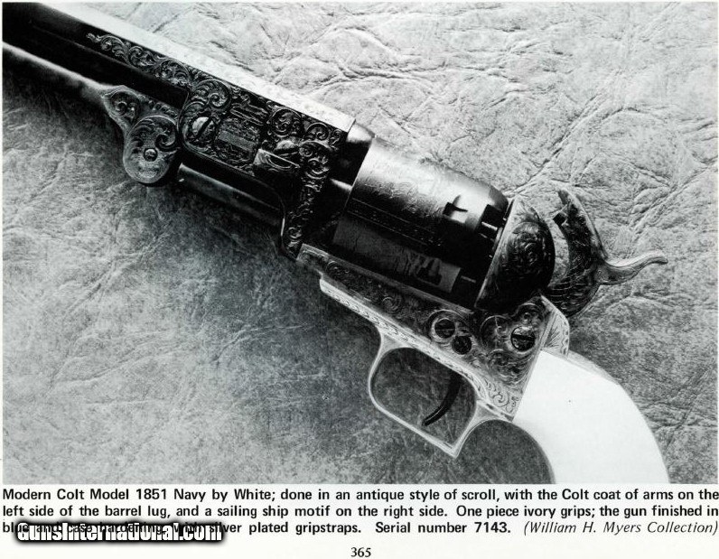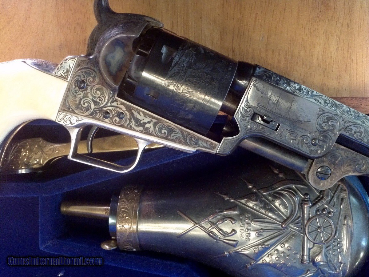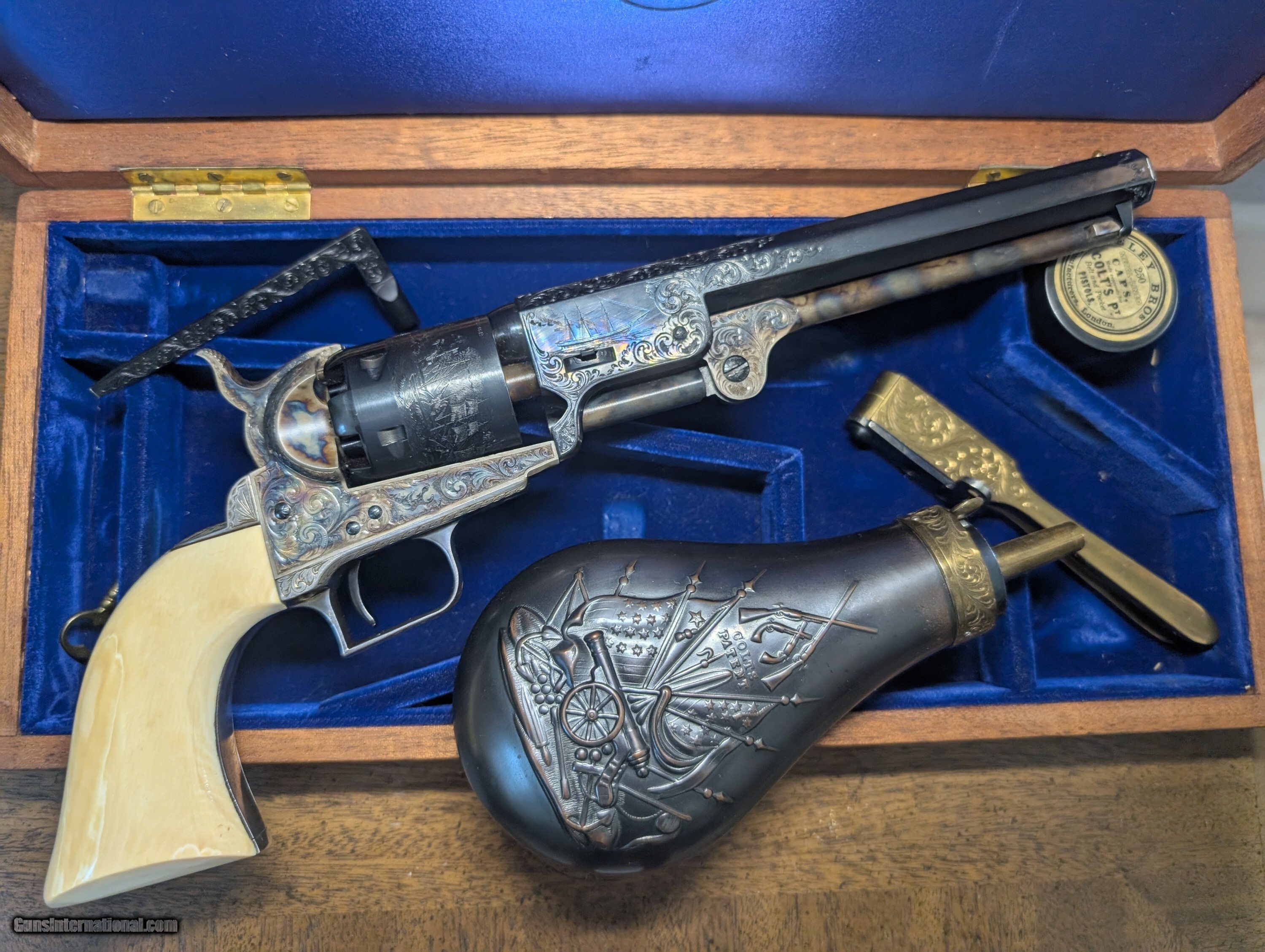 Here is an exquisite, beautiful, one of a kind 1851 Navy engraved by the master engraver Alvin A. White. The gun is a second generation Model C1121 Colt Black powder Series that exhibits presentation grade Donut Scroll engraving with the Colt family Coat of Arms on the left barrel lug and a sailing ship on the right barrel lug. Additionally, it has a one piece ivory grip (Pre Ban) and the accessories are also engraved. The blackstrap is inscribed “To Wm.H. Myers / From Saml Colt.”