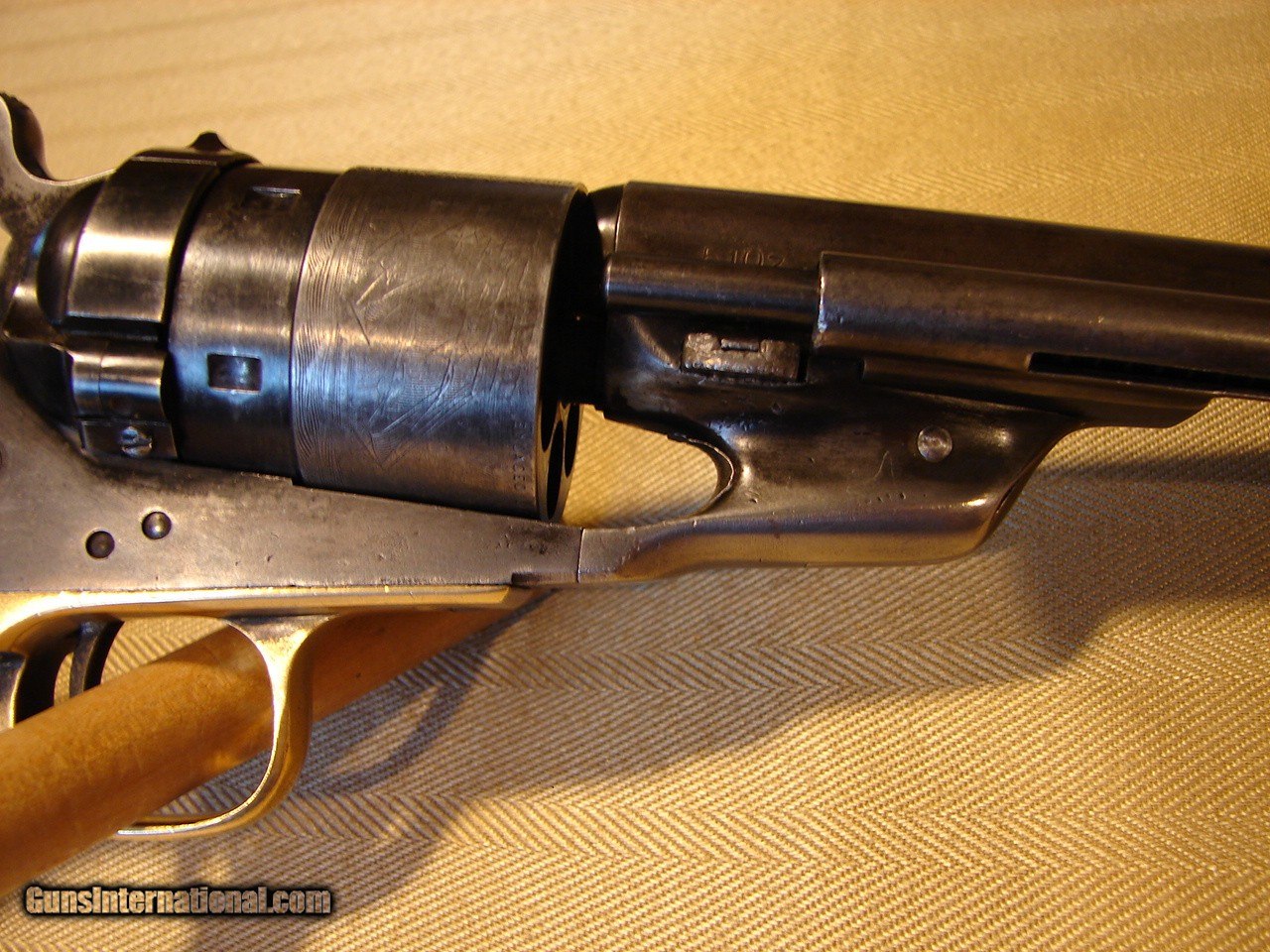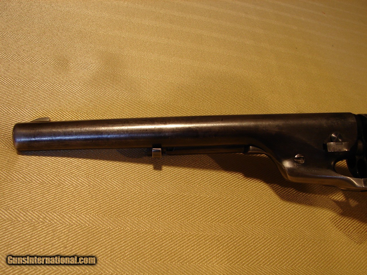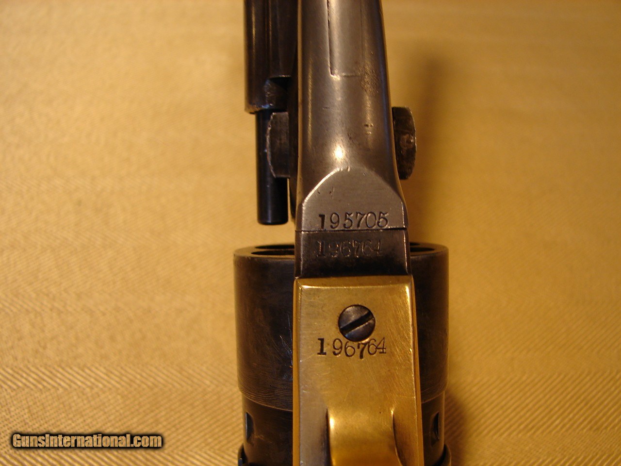 Description: Sale Pending.... Here for sale is a very nice Colt 1860 Army - Ricahrds conversion from percussion revolver to .44 caliber centerfire. The original serial number 196764 match on the receiver, the brass trigger guard, and the bottom of the pistol grip, with serial number 195705 on the barrel, are often encountered in the Colt factory. The conversion number, 5103 on the loading gate and the barrel also match (see photos). This specimen is mechanically perfect. Approximately 70% of the blue remains with wear only on the rim of the added recoil shield. Grips retain some varnish. There is a small chip at the forward bottom corner on the left wood grip. The naval battle scene on the cylinder is nearly 100 percent. All screws appear to be original. This is a fine example of a standard 1860 Army - Richard conversion popular in the western U.S. before the SAA "Peacemaker" became available in sufficient numbers. Inquires are welcome. Shipping will be actual cost. SOLD Handgun Caliber: .44 Colt Manufacturer: Colt Model: 1860 Army Serial Number: 196764 Barrel Length: 8 Condition: Good + Metal Condition: Good+ Wood Condition: Good Manufacture Date: 1871 |