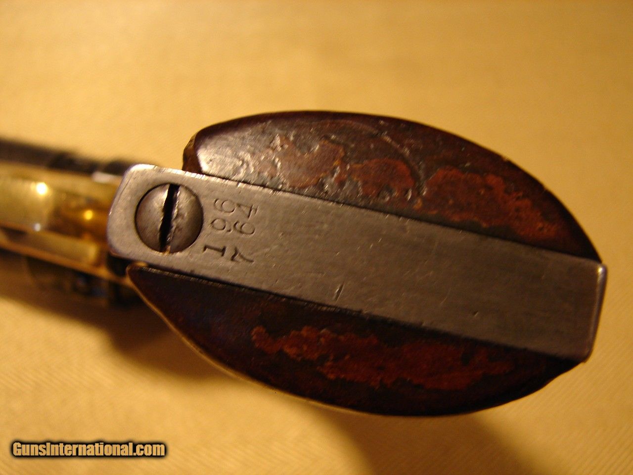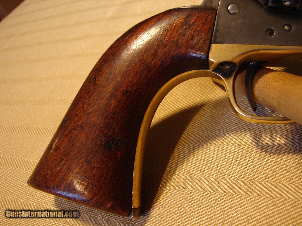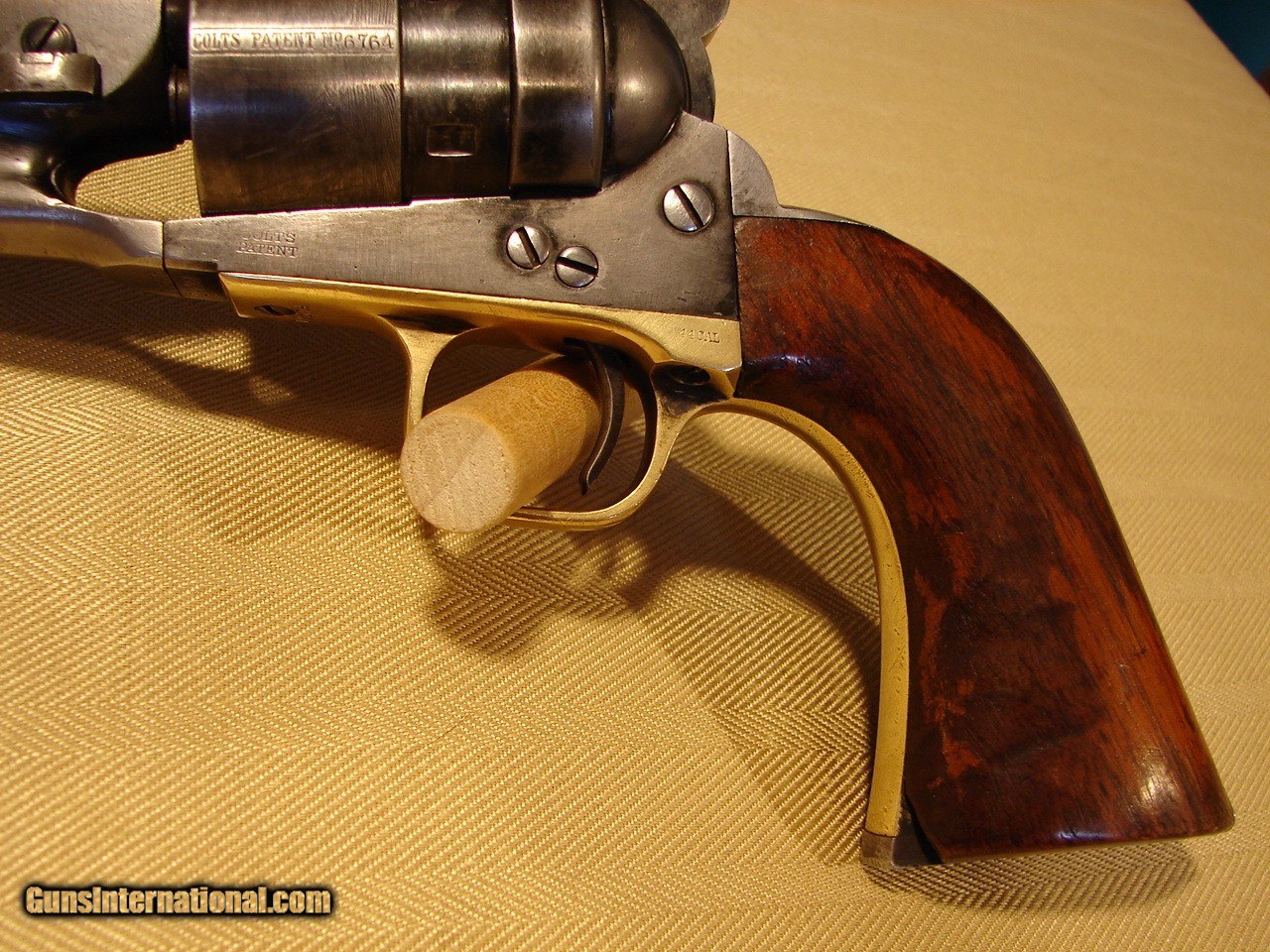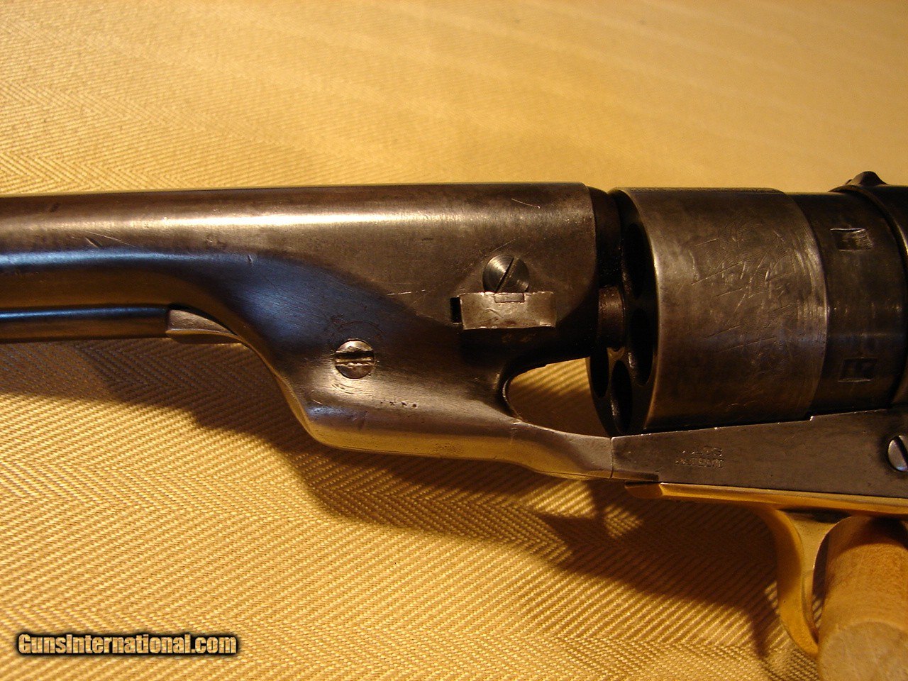 Description: Sale Pending.... Here for sale is a very nice Colt 1860 Army - Ricahrds conversion from percussion revolver to .44 caliber centerfire. The original serial number 196764 match on the receiver, the brass trigger guard, and the bottom of the pistol grip, with serial number 195705 on the barrel, are often encountered in the Colt factory. The conversion number, 5103 on the loading gate and the barrel also match (see photos). This specimen is mechanically perfect. Approximately 70% of the blue remains with wear only on the rim of the added recoil shield. Grips retain some varnish. There is a small chip at the forward bottom corner on the left wood grip. The naval battle scene on the cylinder is nearly 100 percent. All screws appear to be original. This is a fine example of a standard 1860 Army - Richard conversion popular in the western U.S. before the SAA "Peacemaker" became available in sufficient numbers. Inquires are welcome. Shipping will be actual cost. SOLD Handgun Caliber: .44 Colt Manufacturer: Colt Model: 1860 Army Serial Number: 196764 Barrel Length: 8 Condition: Good + Metal Condition: Good+ Wood Condition: Good Manufacture Date: 1871 |