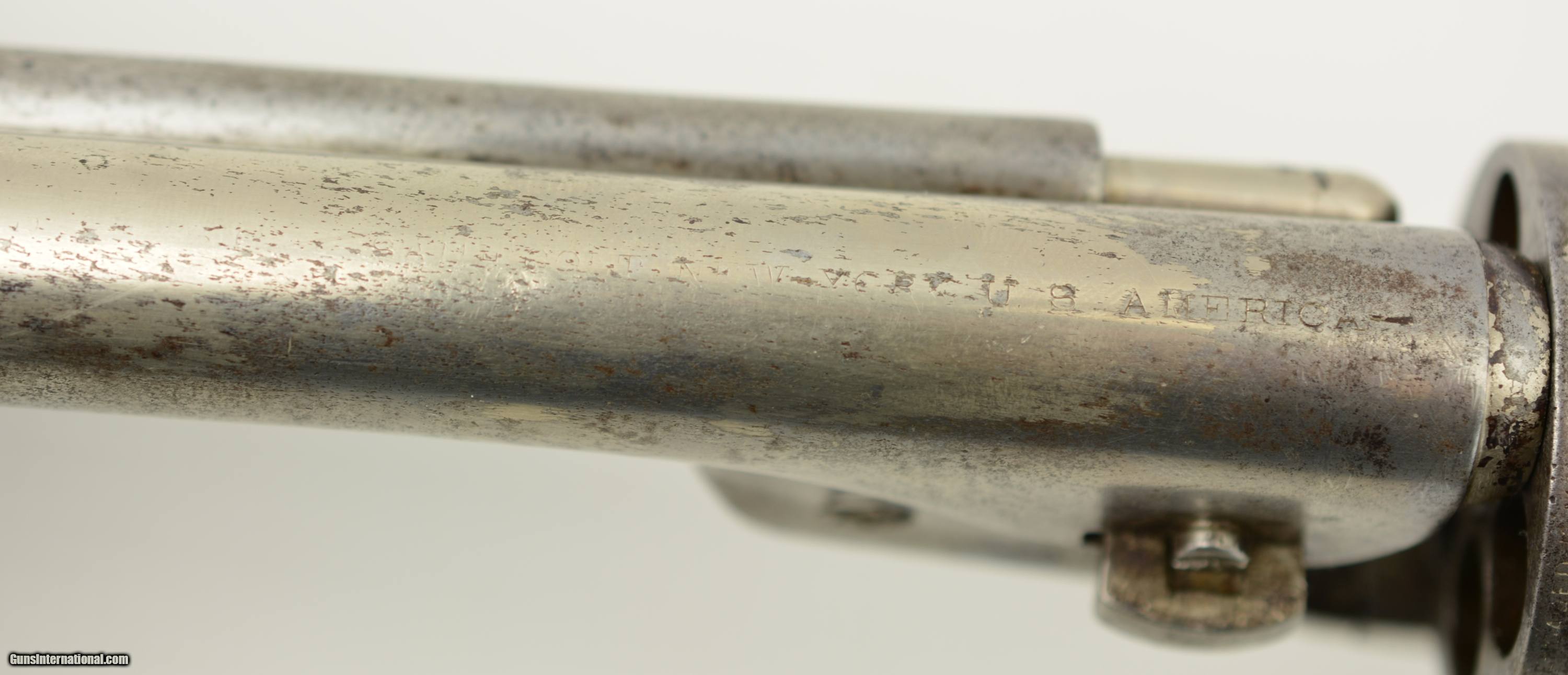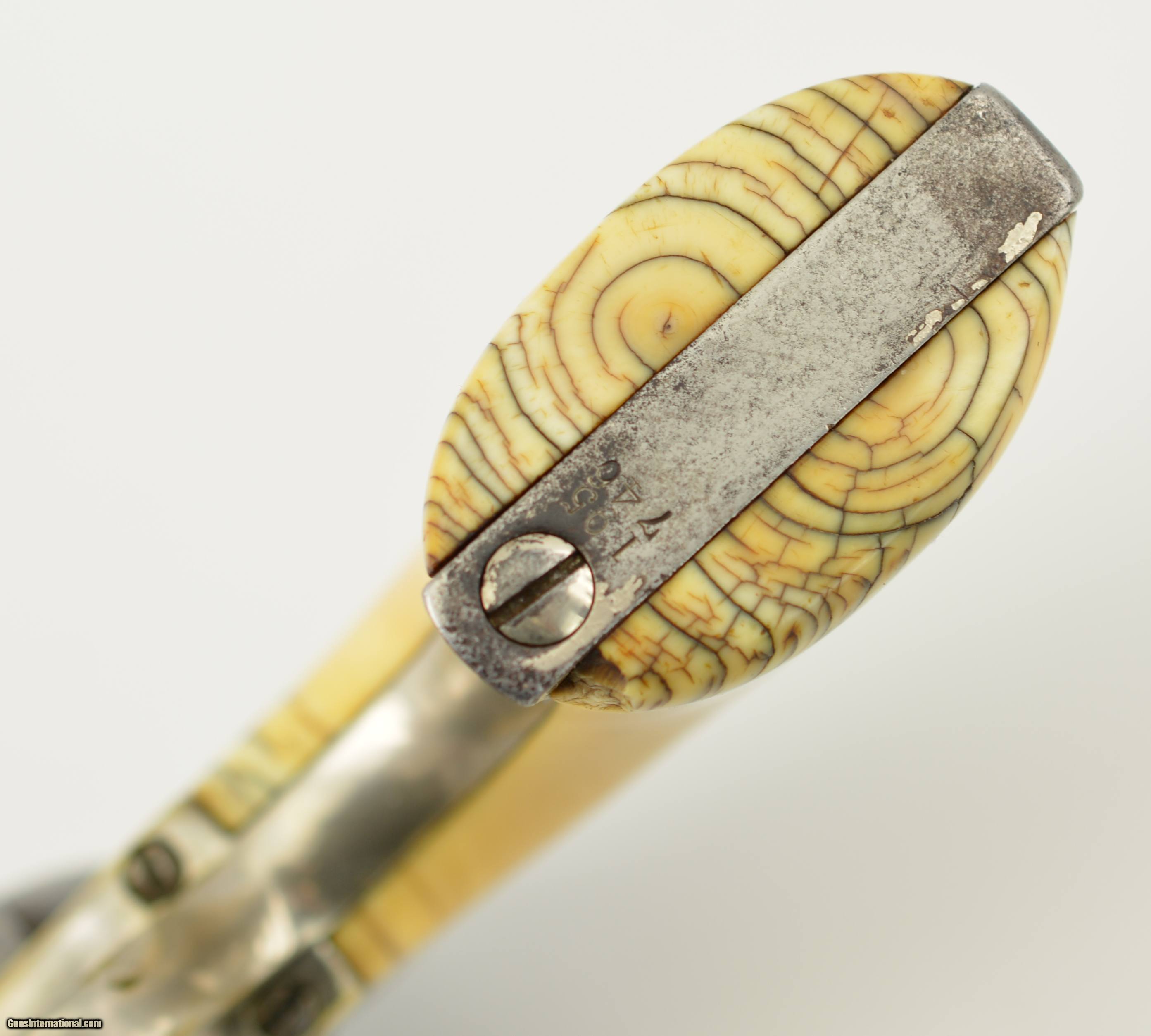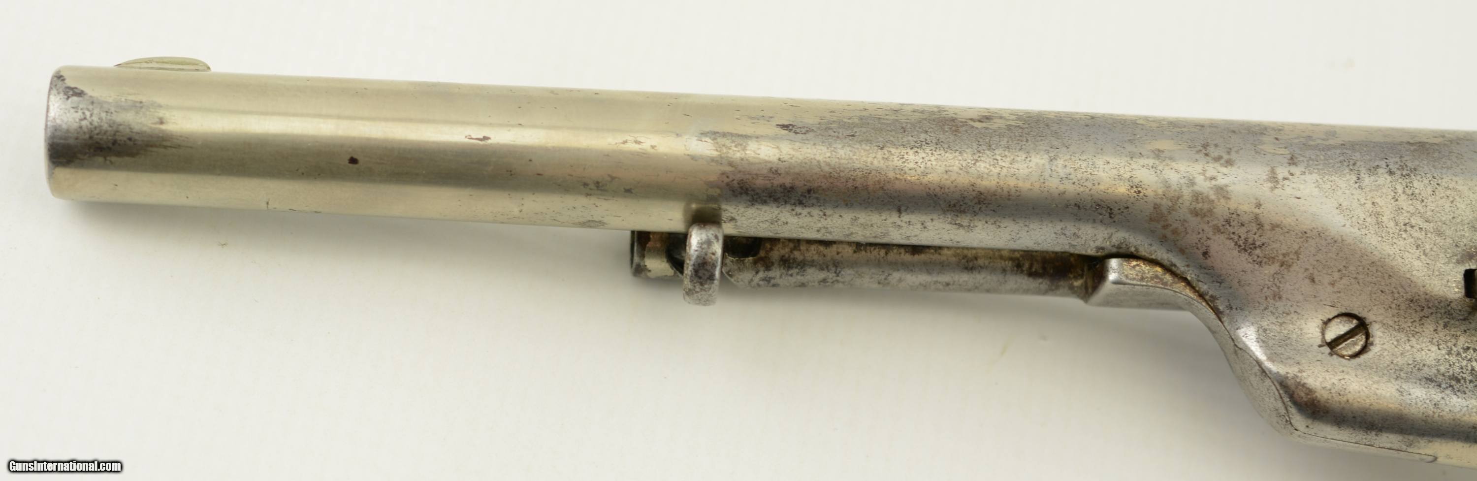 Description: Serial #195746, .44 CF, 7 1/2" octagon barrel with a fine, bright bore that has some very mild freckling with the grooves. This is a handsome Richards revolver that has matching numbers on the frame, cylinder, barrel, loading gate, trigger guard, and backstrap. The metal has about 50% of an old, added nickel finish remaining, with the balance flaked to a mottled gray-brown patina where the underlying metal is exposed. Some scattered areas of pinprick pitting are present, and the naval scene is visible, but not too distinct on the cylinder. The trigger guard has pale yellow brass where the silver has flaked, and the period ivory grip has a mellow, caramel-colored patina with dark grain around the butt, and a single small chip at the toe on the right side. The lock-up is tight as a drum and the action functions flawlessly. This is a great looking Richards Army, with genuine period ivory grips, and is in very good-fine overall condition. Antique SOLD Antique: Yes Manufacturer: Colt Model: 1860 Serial Number: 195746 Caliber Info: .44 Gauge Info: .44 |