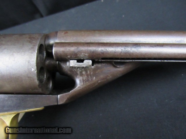 Description: Colt 1861 Navy, Navy Conversion to 38 Long Colt Centerfire, serial # 4321 with the original 4 digits of the percussion serial # showing on the outside of the cylinder. This specific revolver was one assembled from percussion parts on hand and was ordered & inspected by the New York Navy Yard - marked "R.W.M." with the Navy Anchor on the underside of the barrel. Richard W. Meade was the US Navy inspector at that time. A total of 8774 of these were ordered by the US government and about 1/2 were inspected by Commander Meade and marked as such. Correct 7.5" round barrel. Very good bore. Serial # matches on bottom of grip, trigger guard, frame, barrel, rear face of cylinder (typical of the conversions), and arbor. Loading gate is marked with an assembly #. Strong blue on the hammer and frame with about 15% case color present. Brass trigger guard and grip have very nice color and have not been cleaned or polished. Barrel and cylinder are patina. Action is tight and indexes perfectly each time. A slight amount of play exists at the barrel/frame junction. Correct unmarked wedge typical to these conversions. Original wood grips show wear and usage dings but have never been cleaned, sanded or refinished. No play to cylinder when hammer is cocked and ready to fire. Correct 2-line patent date stamped over the "Colts Patent" on the left side of the frame. "36 Cal" still shows on the side of the brass trigger guard and the # "2" shows at the top of the front of the tripper loop. No traces of cylinder scene remain but the "Colts Patent" is clear. All in all a good, honest Colt 1861 Navy US Navy conversion that is sure to increase in value over time. 315.251.4799 with questions or concerns. Antique so it can ship directly to you assuming your local laws allow it. Must provide copy of valid driver's license. No international sales. Ships by USPS Priority Mail with tracking and insurance for an additional $35. Payment by bank check, money order, or discreet PayPal only. Selling as is so please ask questions before . Buyer pays return shipping. Thanks for looking and please check my other listings. Always interested in single pieces or collections of Winchester, Marlin, Savage, Remington, Colt and other Old West / Civil War firearms, as well as old ammo and coins, books on the Old West and firearms. Now on the- visit cnycollectibles. Layaway available !! SOLD Antique: Yes Manufacturer: Colt Model: 1861 Navy Serial Number: 4321 Caliber Info: 38 Long Colt CF Barrels: 7.5" round Item Location: United States |