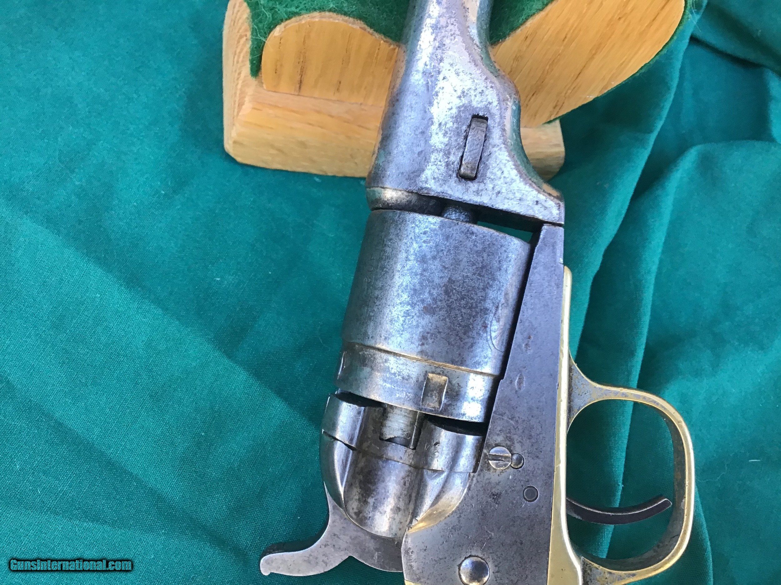 Description: 1862 Colt Pocket Conversion. 3 1/2” barrel and 38 rim fire caliber. 5302 serial number matches on barrel, cylinder, frame, trigger guard, and back strap. The cylinder pin and wedge do not match. Action locks up tight and functions nicely. Great barrel address marking. Overall condition is 35% nickel remaining with the remainder a gray patina. Has both the 1871 and 1872 patent dates. Grips are worn but no apparent cracks. Decent bore. Overall has a good look and is mechanically sound. Sold as a collectors item only. Feel free to ask questions. SOLD Antique: Yes |