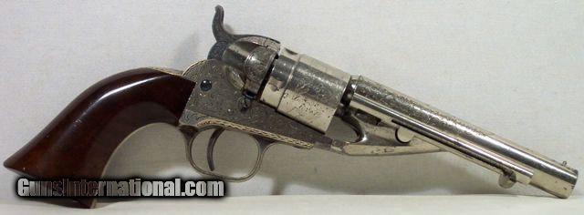 Description: FROM MY PERSONAL COLLECTION!!! BEAUTIFUL Colt Conversion of 1862 Police Revolver; SN 30081E; 38 Center fire with 4 ½” bbl.; Gustave Young Factory Engraved; all matching except wedge, which is engraved and probably left Colt as mismatched, which is not uncommon; most metal finish remains with finish wear to back strap; BEAUTIFUL grips numbered 0081 as is arbor, cylinder, and loading gate; number 30081 on bbl., frame, trigger guard, and back strap; PERFECT action and bore; engraving by Gustave Young, circa 1852-1869; listed by number on pg. 146 of “Variations of Colts New Model Police and Pocket Breech Loading Pistols”; antique, no FFL/C&R required for shipping; All items shipped fully insured Priority Mail- -Hand guns $30 --Long guns $45-- Spurs $30-- Knives, Swords & Sabers $30—Grips $20 ; return policy: three days inspection from the date the item is received; full refund of shipping both ways ONLY IF THE ITEM IS MISREPRESENTED. Note: International sales only as laws permit. Will ship C&R eligible items to C&R license. Antiques shipped without license to anyone EXCEPT New Jersey and City of New York where a FFL is required. SOLD Antique: Yes Manufacturer: Colt Model: 1862 Young engraved Serial Number: 30081E |