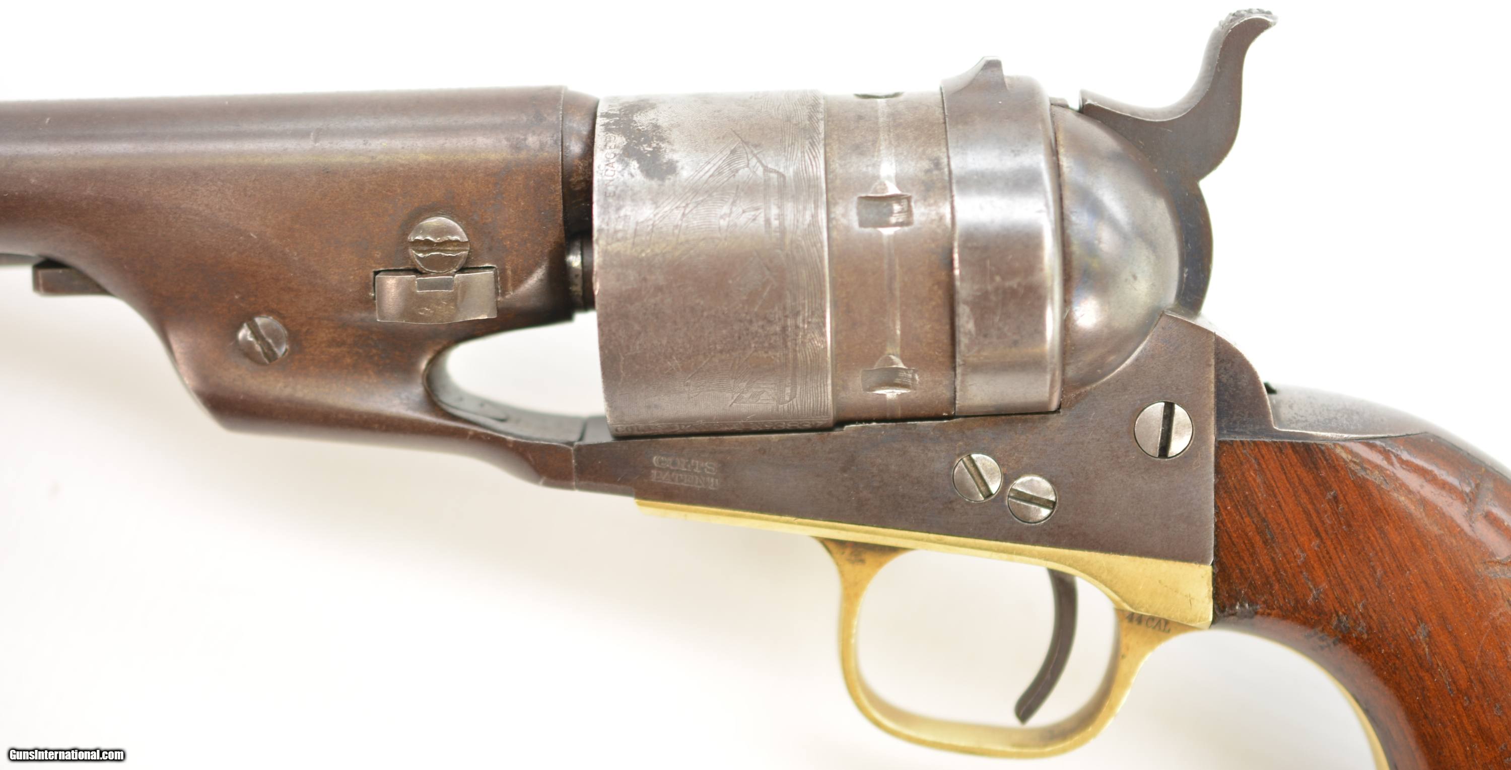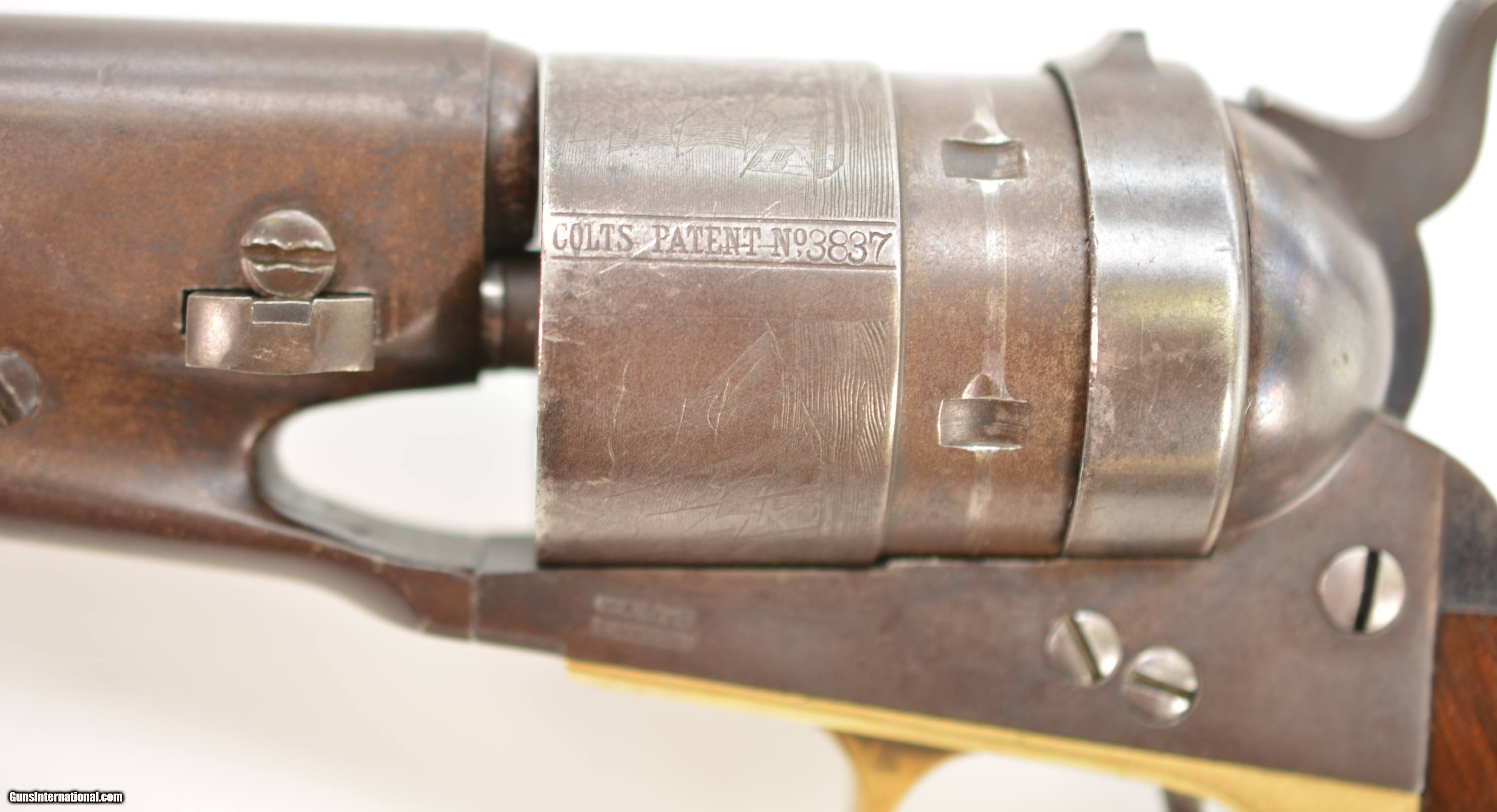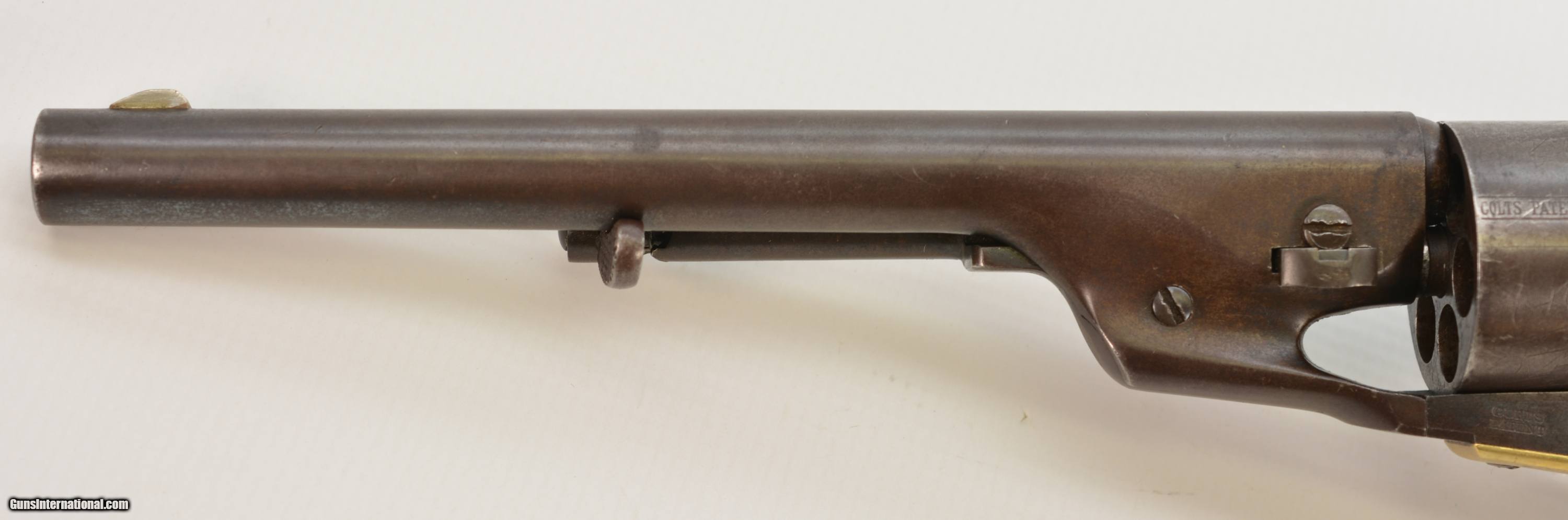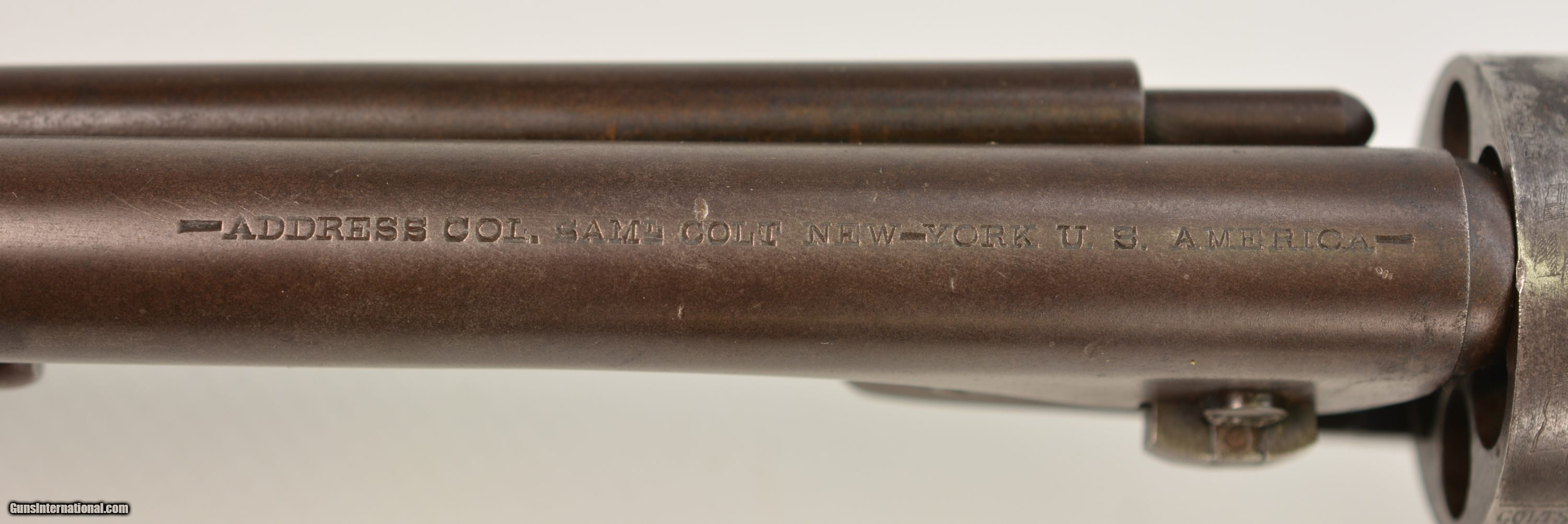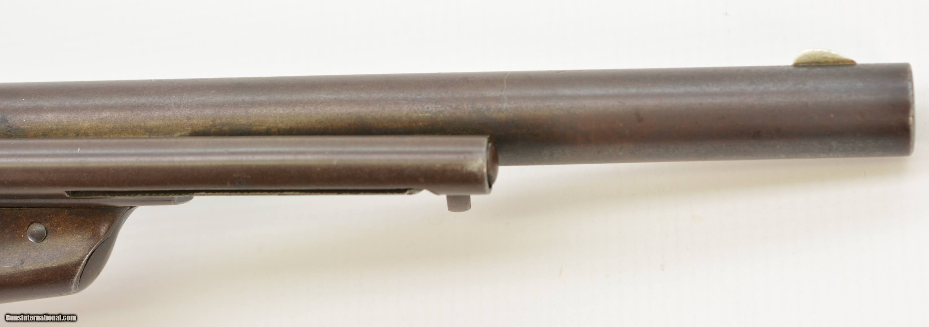 Description: Serial #3837, .44 CF, 7 1/2" barrel with a fine bore that has some minor freckling within the grooves. This is a handsome revolver that has matching serial numbers on the frame, barrel, cylinder, trigger guard, gripstrap, and grip. The frame, arbor, and conversion ring are marked with a “3208" assembly number, while the ejector assembly and barrel are marked with a “2785" assembly number. The barrel has a mostly plum-brown patina with thin freckling along the top and sides, as well as traces of the bright original blue along the bottom. The ejector rod has a matching brown patina with some silvering on the edges, and on the rounded ejector rod tip. The rod has some minor peen marks at the tip, and the tip of the wedge spring has broken off at some point as well. The frame and conversion ring have an overall dark patina with traces of the original color case-hardening remaining, as well as some silvering along the high edges, and the cylinder retains 80-85% of the naval battle scene with some dark patches of pitting and freckling near the face on one side, as well as a bright turn-ring at the rear. The trigger guard has turned to a pale-yellow patina, while the gripstrap has some bright, original blue at the frame juncture. The walnut grip (numbered to the gun on the interior) has heavy wear and vertical chipping along the base on both sides, with shiny original varnish still present on both sides as well. The action is tight and fully functional with no lateral play in the receiver, and crisp, firm locking of the cylinder. The is a splendid, original Richards Conversion Revolver that has matching assembly and serial numbers, and rates excellent condition overall. Antique SOLD Antique: Yes Manufacturer: Colt Model: Richards Serial Number: 3837 Caliber Info: .44CF Gauge Info: .44CF |
