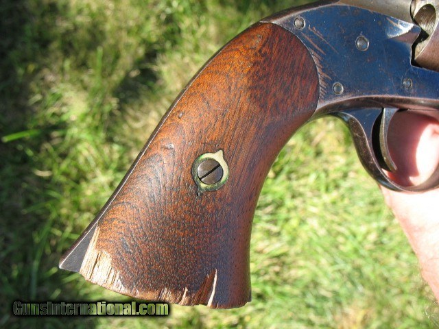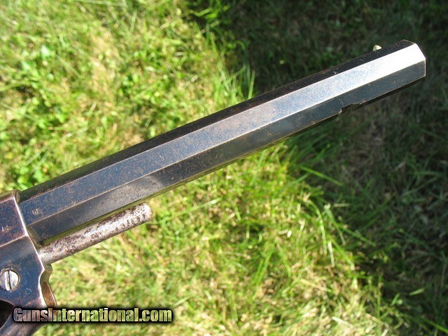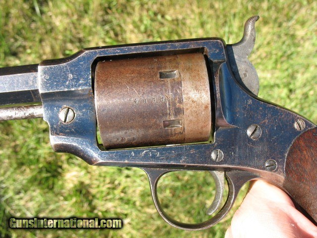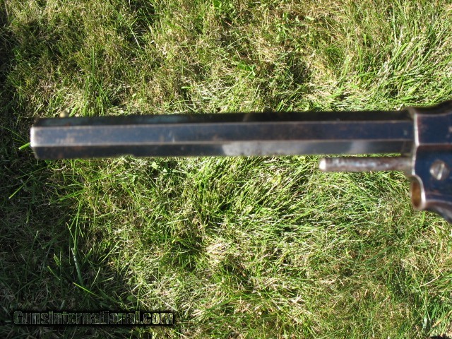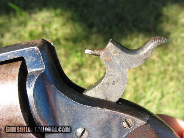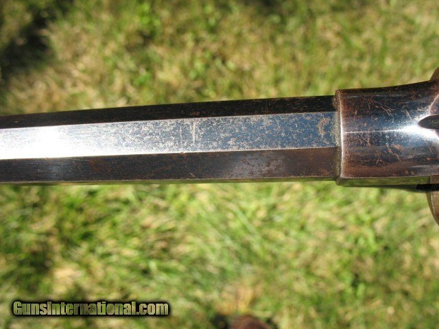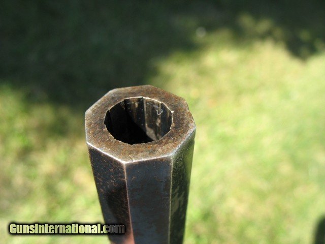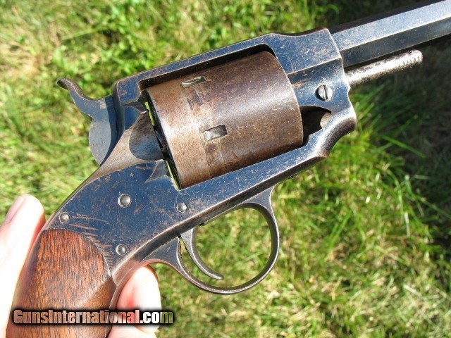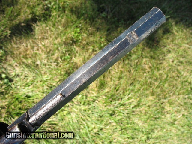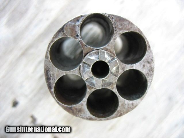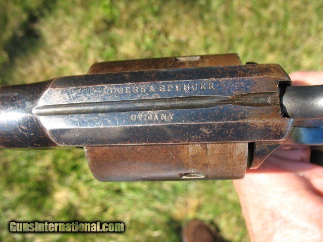 Description: SOLD...Antique Rogers and Spencer conversion. Here is a gun that is very rarely found.. Rogers and Spencer conversion to .45 caliber. These were converted to .44 and .45 calibers. These rare conversions are mentioned on page 425 in the late Bruce McDowell's fantastic book “ A Study of Colt Conversions “.. This one will chamber the .45 Colt but I would shoot the shorter .45 S&W as the cylinder walls are thin on these .45 caliber conversions.. As you can see in the photo of the rear of the cylinder, one of the chambers is pretty thin.. I left that one empty when I shot it... And YES, I have fired this thing with the .45 S&W black powder ammo.. It backs out the primers a little and it bulges the cases so not a gun you want to go out and shoot all day.. If I find the time, I think I can fix the backed out primer problem but not the bulged cases.. The cylinder chambers are rough bored and the only way to fix this problem would be to line the cylinder chambers to a .smaller caliber, say a .38 and then reline the bore to that caliber.. Bobby Hoyt is the man for this job... Other than that it is mechanically tight as a new gun.. It indexes perfectly and locks up tight as new with absolutely no cylinder movement side to side or front to rear.. The bore is mint like new and still retains the factory blue inside the bore as can be seen with a flash light.. Also I took a photo of the bore and you can see the blue.. !!!!! As for the condition I think the photos tell the story.. Over all this gun retains a boat load of factory blue from its percussion days... I would rate the barrel and frame at about 85% or more nice bright blue.. The cylinder has faded to a medium brown patina with some thinning blue. It has the cut out on the right side of the frame for loading and unloading.. The percussion rammer has been removed as you can see and a simple pin is in place to retain the cylinder. Matching S/N on the barrel, frame and cylinder.. The grips are chipped on the bottom of both sides as is common on the R&S's as they have a very wide flare on the bottom.. Original front sight. Excellent frame markings.. Screw heads are clean and not all burred up.. Over all this is a very rare and hard to find conversion. It shoots like a new gun but for the mentioned issues.. Shoot it as it is, or have it converted to a .38 or don't shoot it at all.. It is up to you.. If it does not sell, I might be calling Bobby Hoyt..?? Call me at 765-728-8049 with any questions or more photos.. I want happy customers.. $30 insured shipping.. SOLD Antique: Yes |